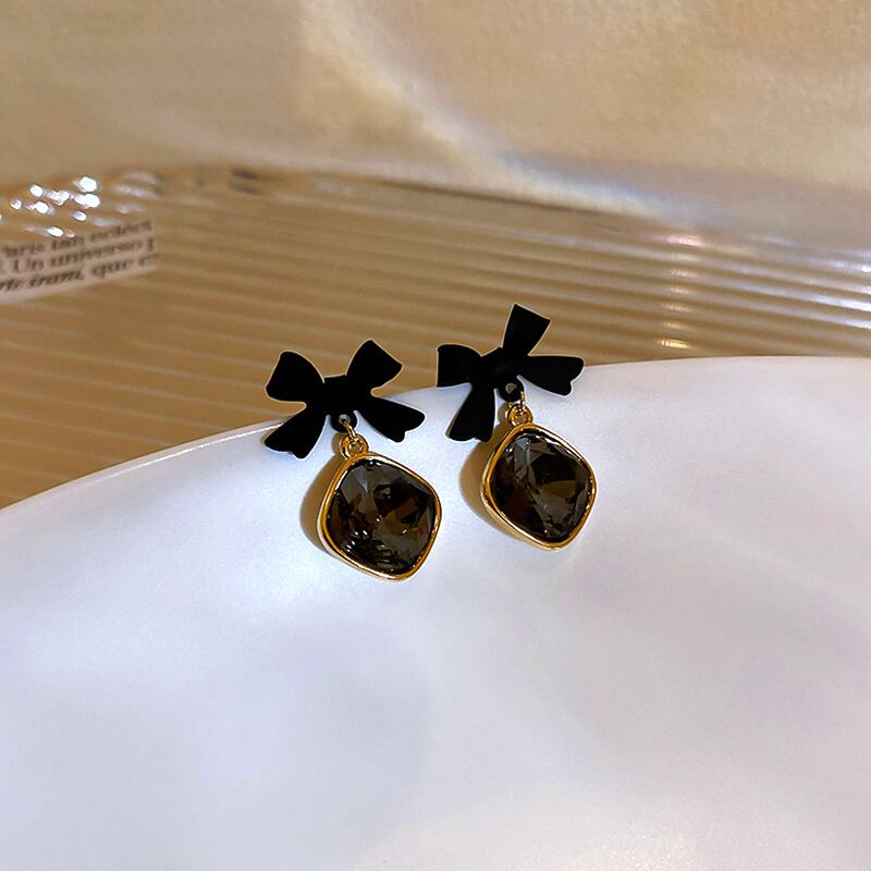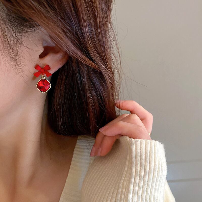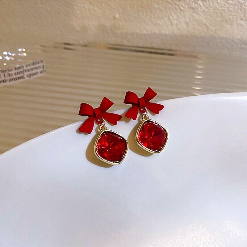 ファイン 14 18K ゴールドメッキちょう結びスクエアクリスタルイヤリング女性ガールジュエリー AAA ジルコン S925 シルバーニードルギフト リボン 指輪 銀 スクウェア