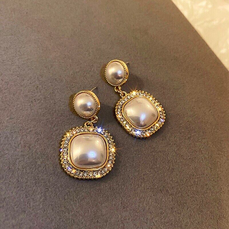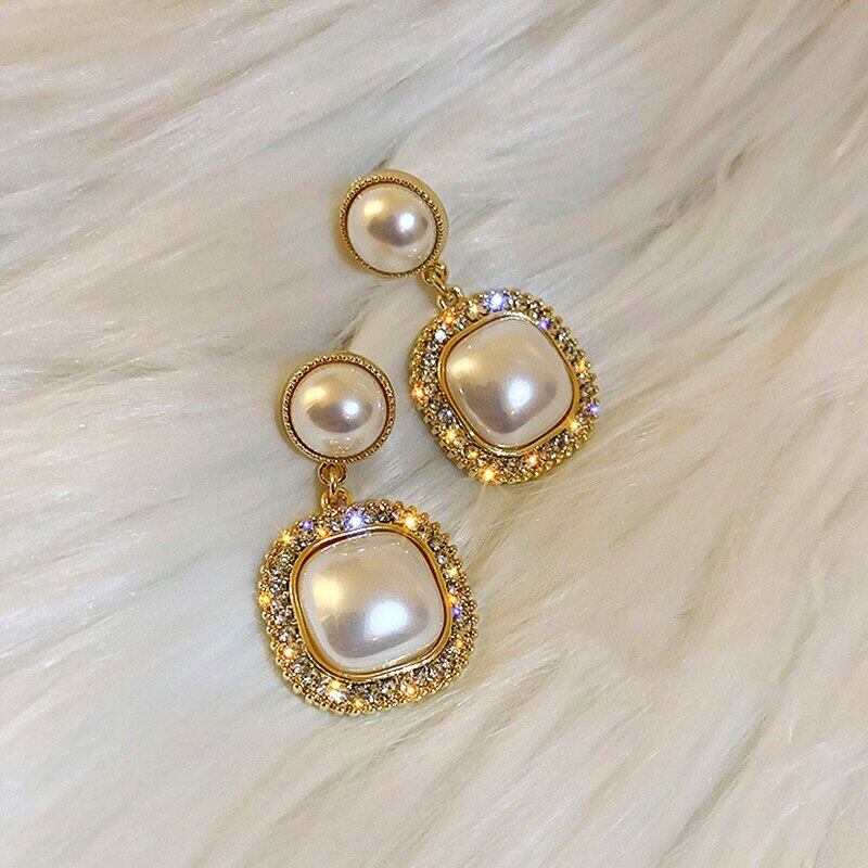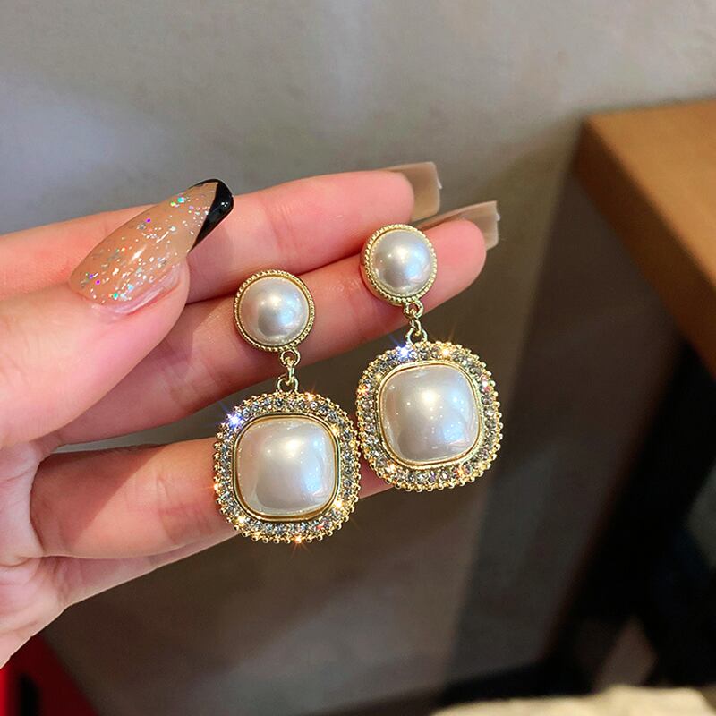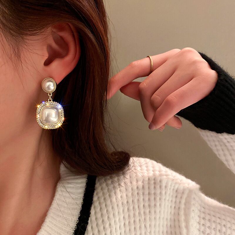 ファイン 14 18k リアルゴールド幾何スクエアパールイヤリング女性ガールジュエリー AAA ジルコニア S925 シルバーニードルパーティー 真珠 指輪 銀 スクウェア 風信子石