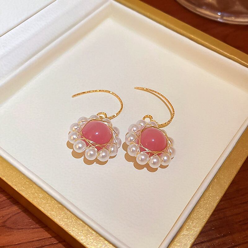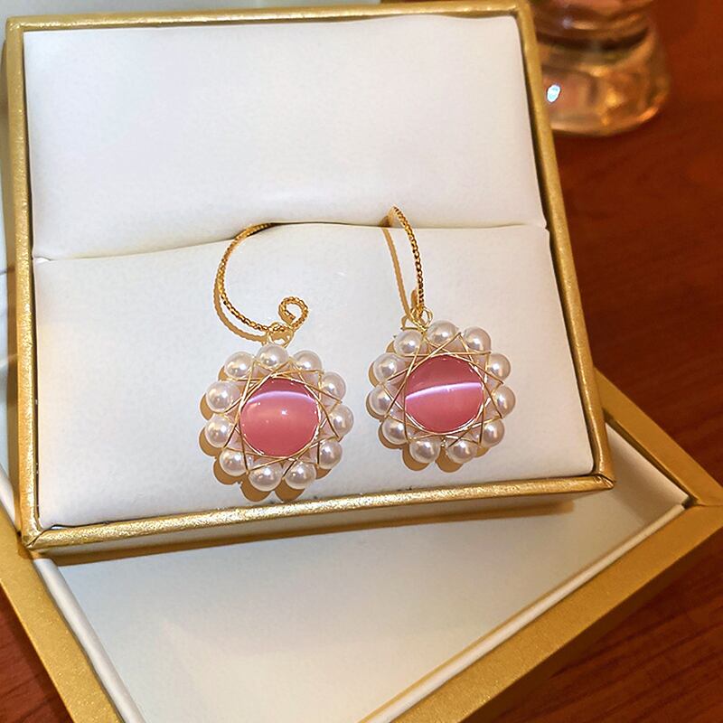 トレンディな 14 18K リアルゴールドメッキピンクオパールパールフラワーイヤリング女性ガールジュエリー S925 シルバー針 蛋白石 真珠 指輪 フラワーデザイン 銀