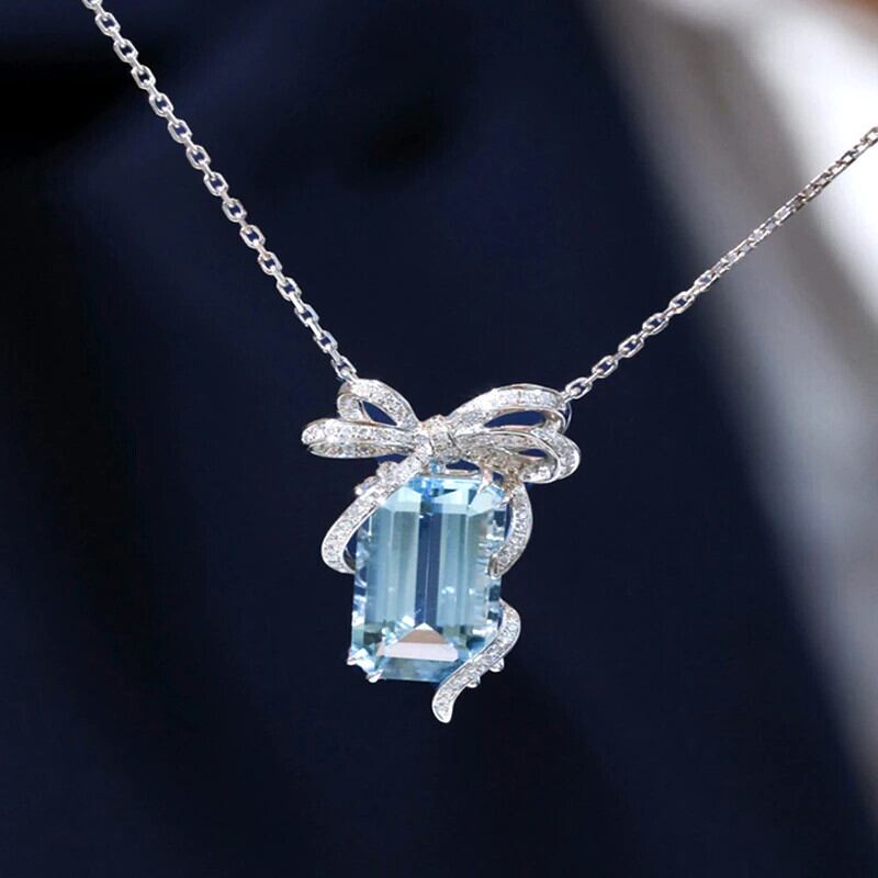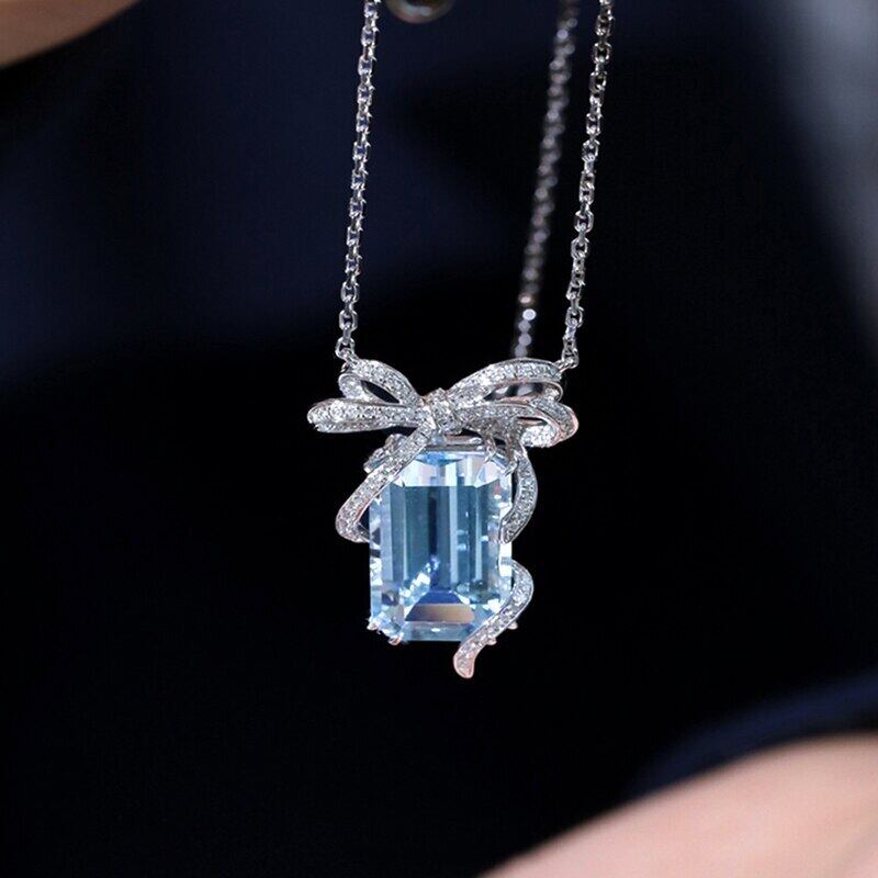 トレンディちょう結びサファイアシルバーネックレス女性宝石ジュエリーシャイニー AAA ジルコン卒業花嫁介添人ギフト リボン レース 銀 サファイヤ 碧玉 青玉