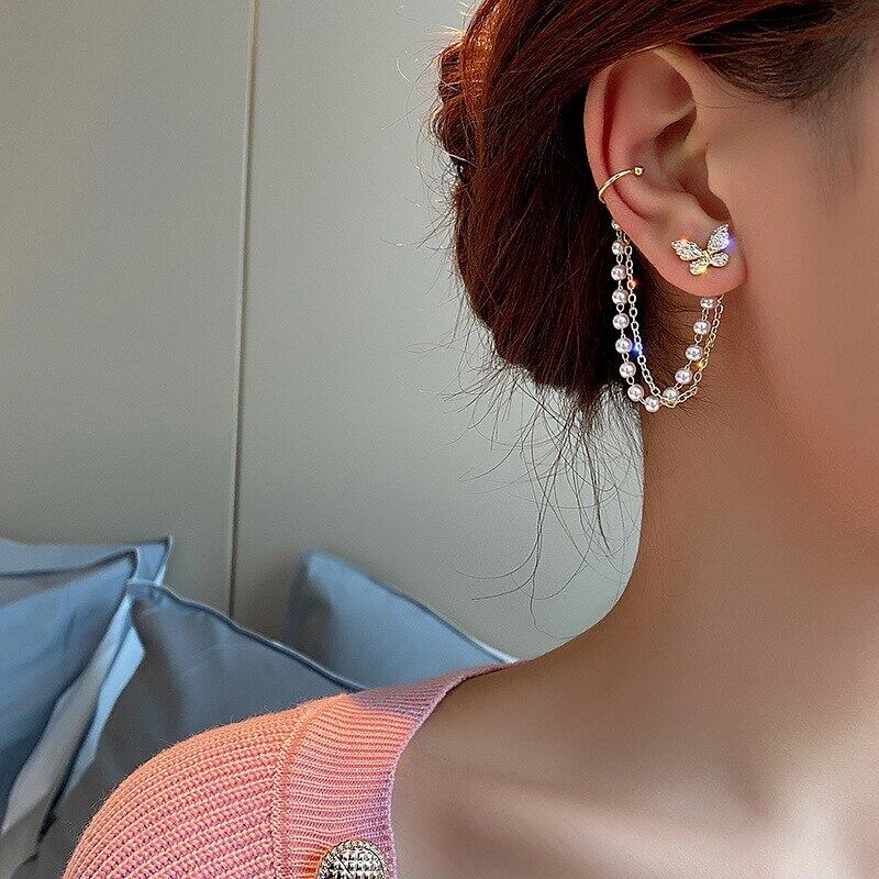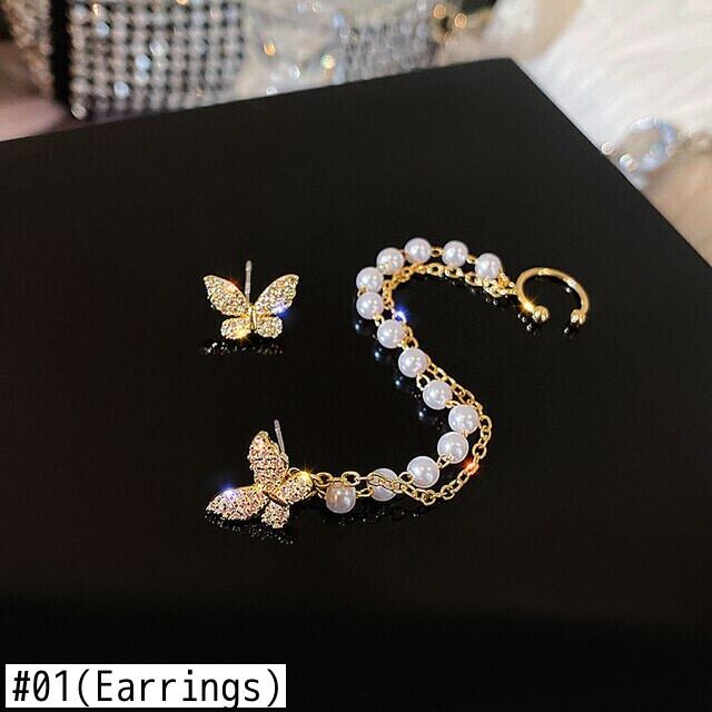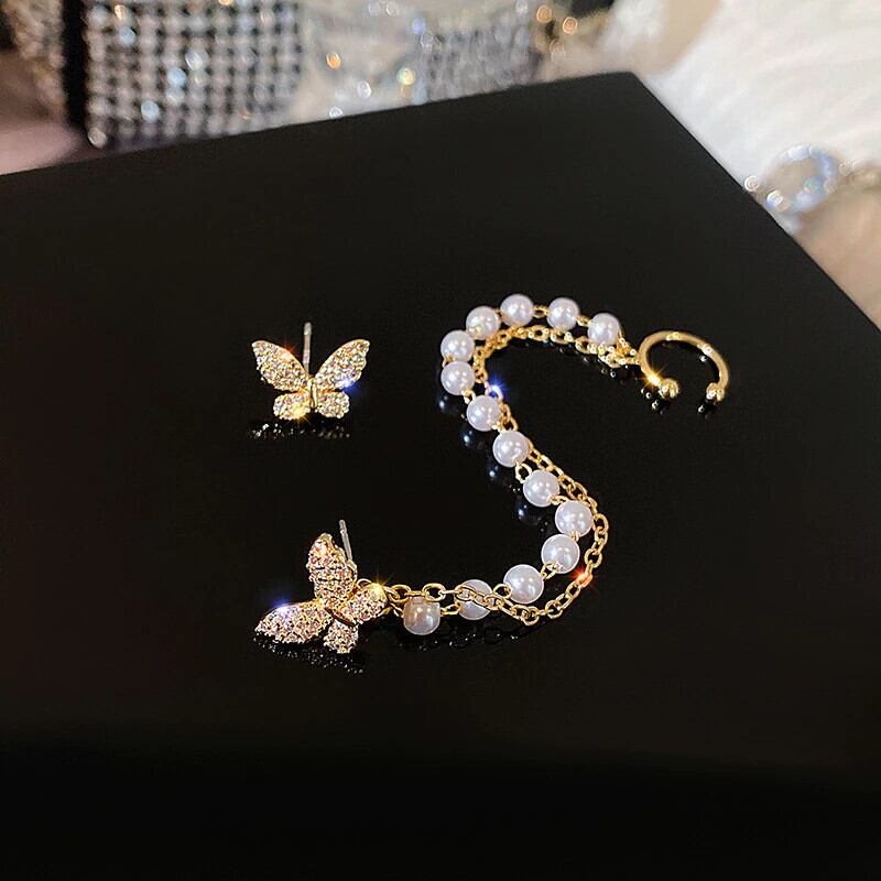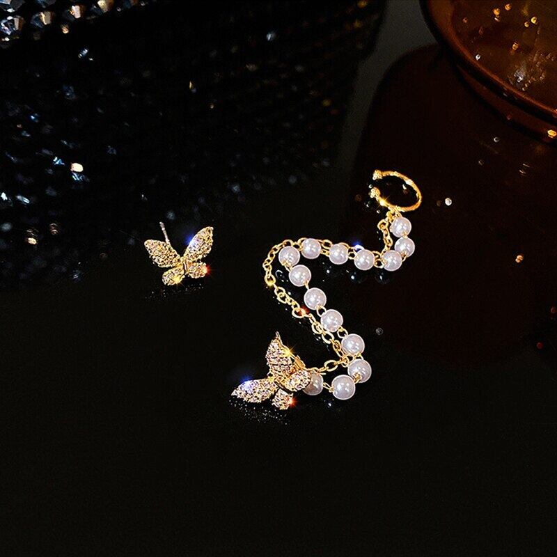 トレンディな 14 18K リアルゴールドメッキバタフライパールクリップイヤリング女性ガール非対称ジュエリー S925 シルバー針ジルコンパーティーギフト 真珠 指輪 銀