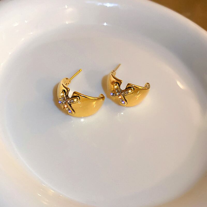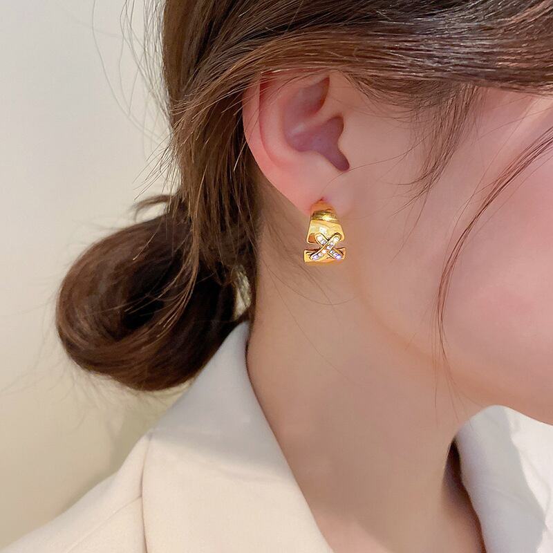 トレンディな 14 18K リアルゴールドメッキ X ジオメトリ C シェイプイヤリング女性ガールジュエリー S925 シルバーニードル AAA ジルコンスタッド 指輪 銀