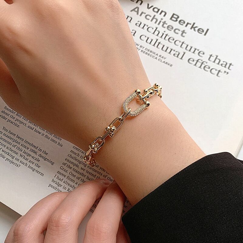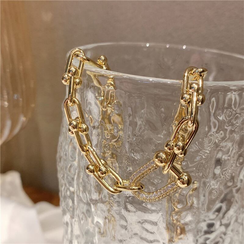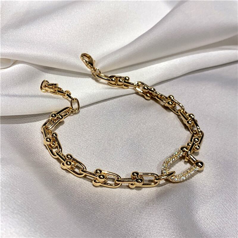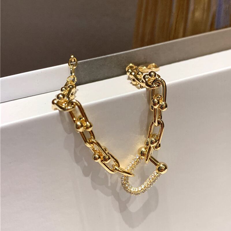 トレンディな 14 18K リアルゴールドジオメトリ U シェイプメタルブレスレット女性気質ジュエリーシャイニー AAA ジルコンギフト