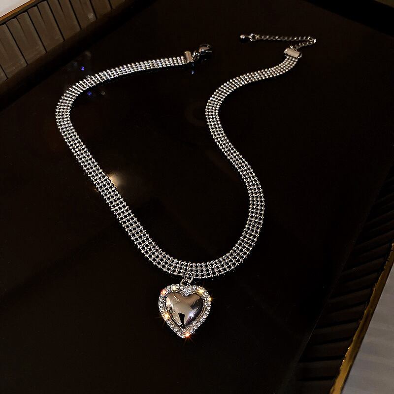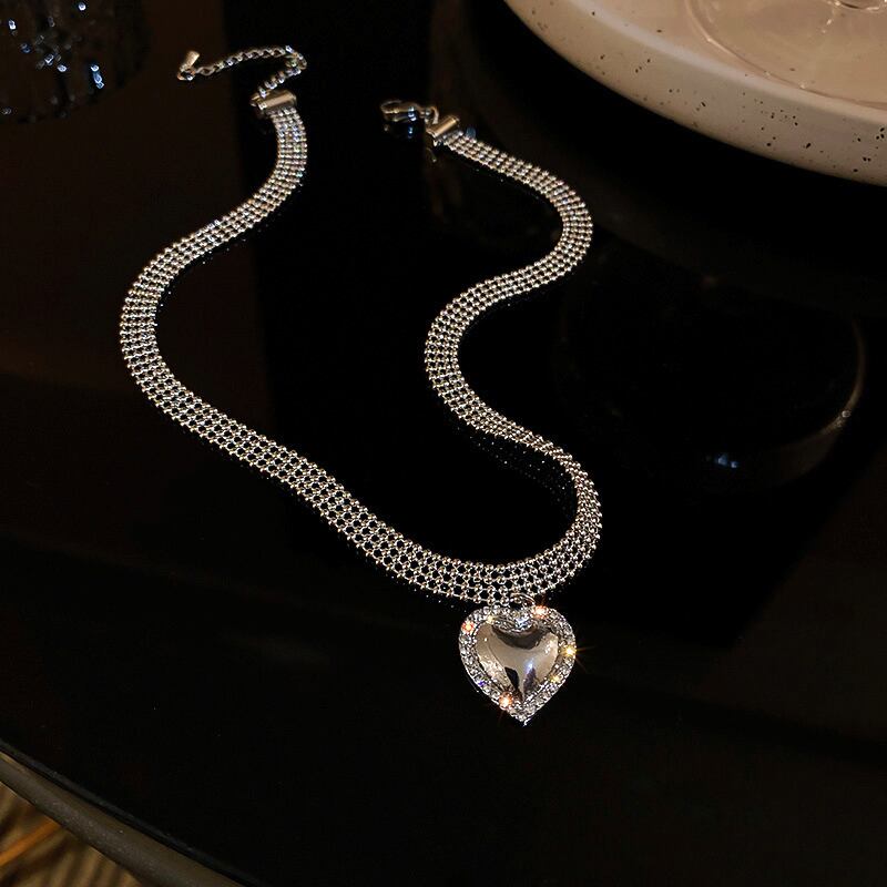 メッキシルバーラウンドビーズハートペンダントチェーンネックレス女性ガール AAA ジルコニア気質ジュエリー レース 銀 風信子石