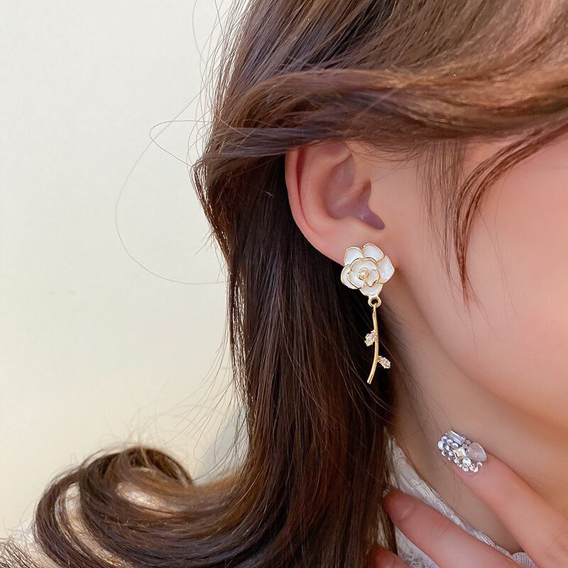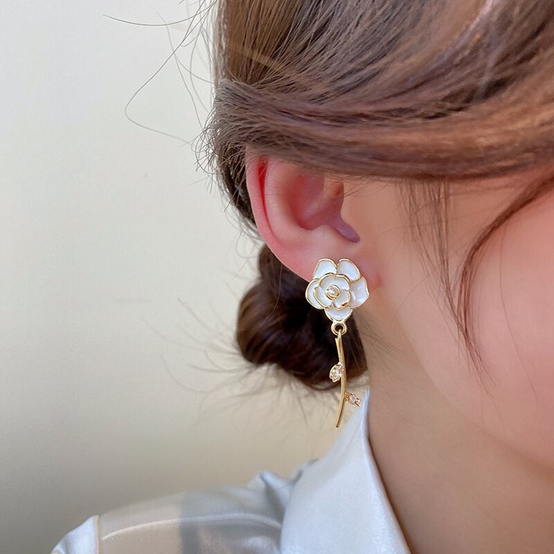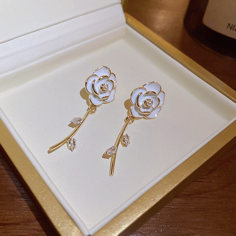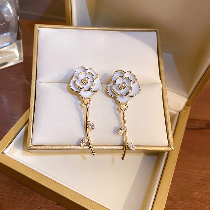 ファイン 14 18K リアルゴールドメッキパールエナメル椿イヤリング女性ガールジュエリー AAA ジルコニア S925 シルバーニードルスタッド 真珠 指輪 銀 風信子石