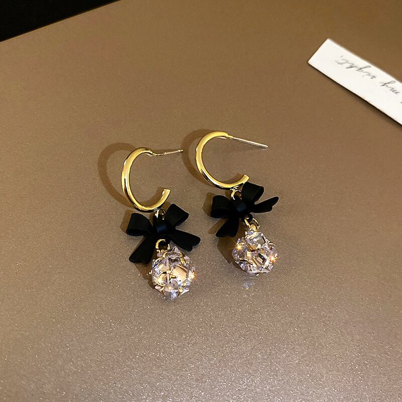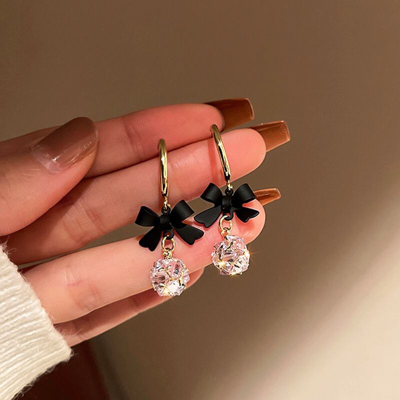 トレンディな 14 18k ゴールドメッキ黒ちょう結びジルコンボールイヤリング女性ガールジュエリー S925 シルバーニードルジルコニア ブラック リボン 指輪 銀 風信子石