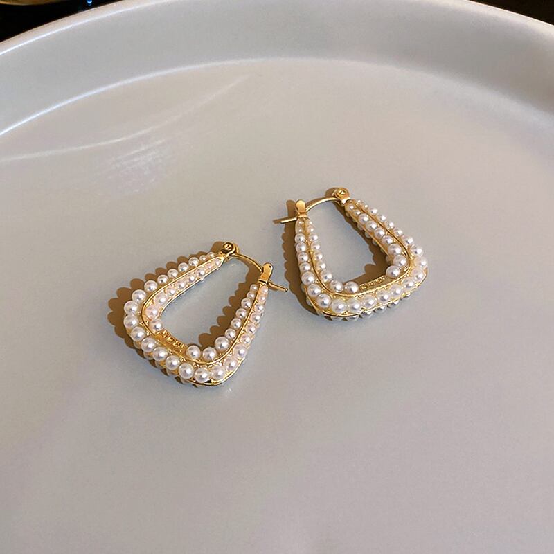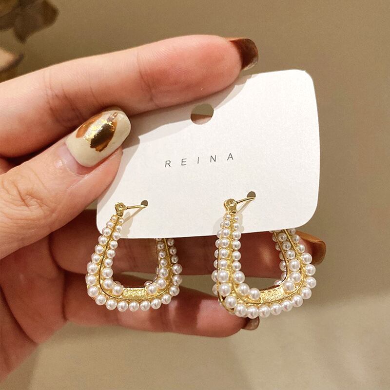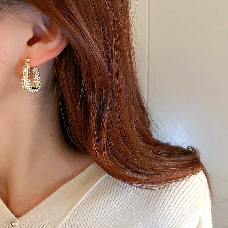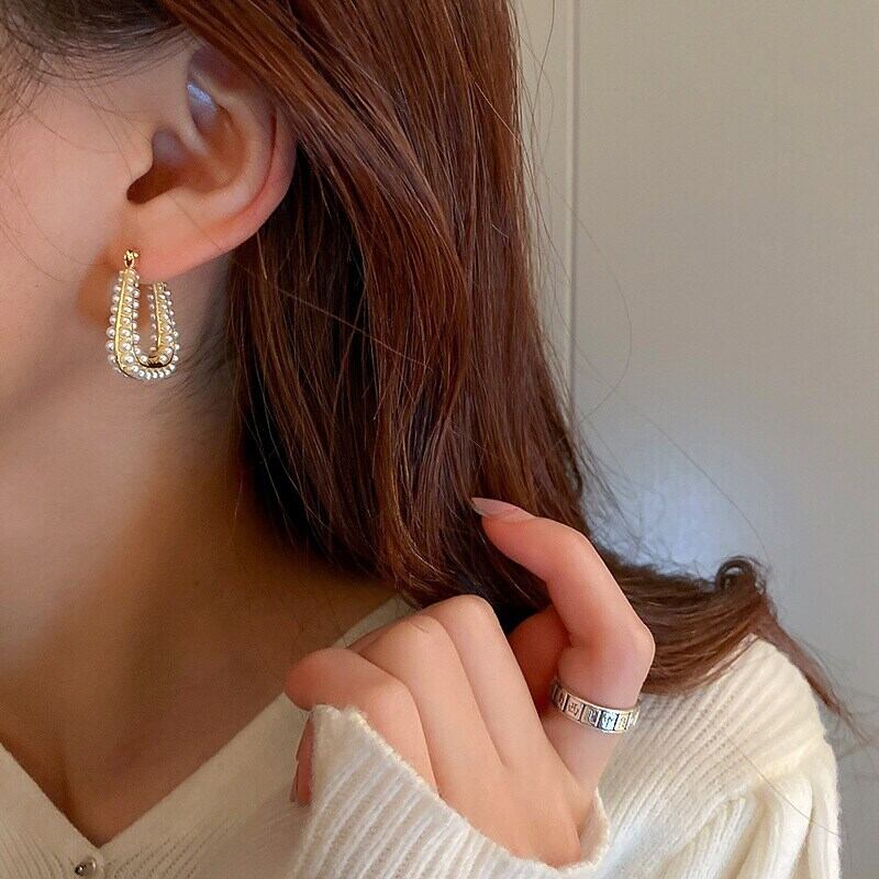 14 18k ゴールドメッキ幾何学的な U 字型の真珠のイヤリング女性ガール気質ジュエリー S925 シルバー針の結婚式 パール 指輪 銀
