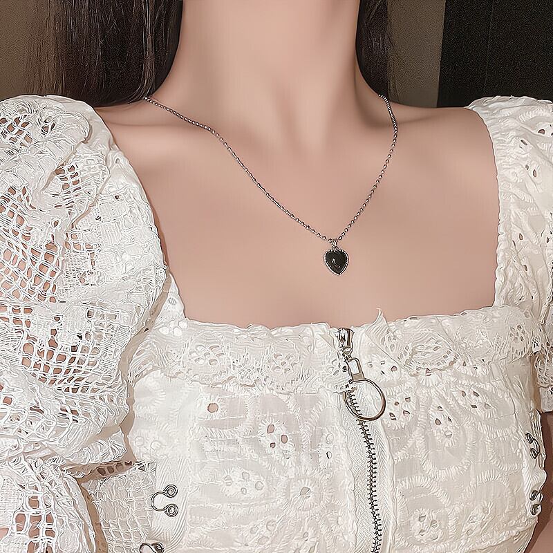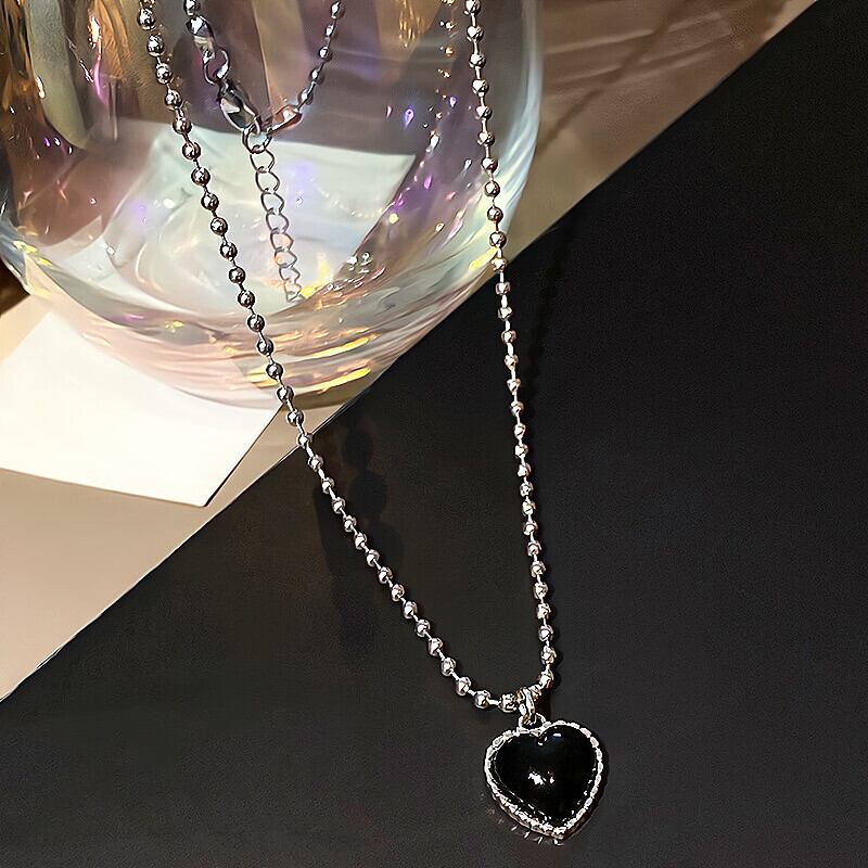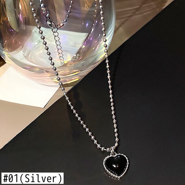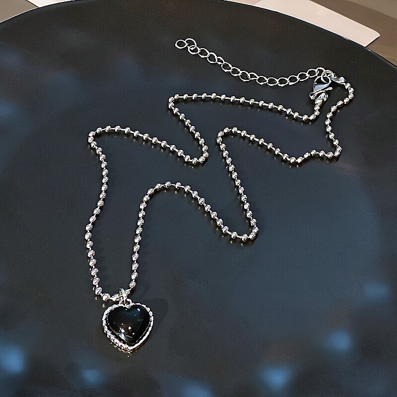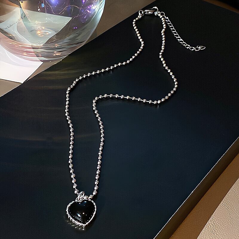 シルバーハート型オパールブラックペンダントチェーンネックレス女性ガール気質ジュエリーインホットギフト レース 蛋白石 銀