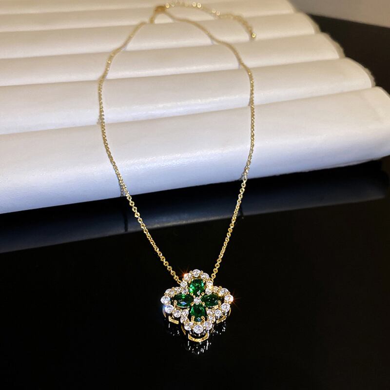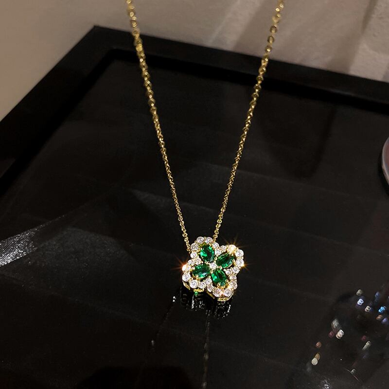 トレンディファイン 14 18K リアルゴールドメッキグリーンクリスタルフラワーペンダントチェーンネックレス女性ガールジュエリー AAA ジルコニア レース フラワーデザイン 風信子石