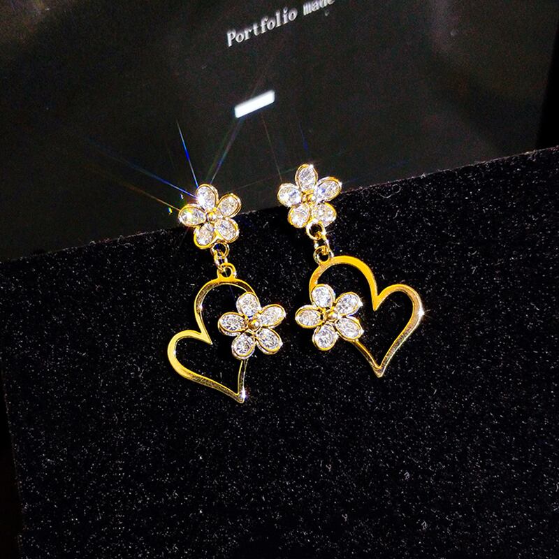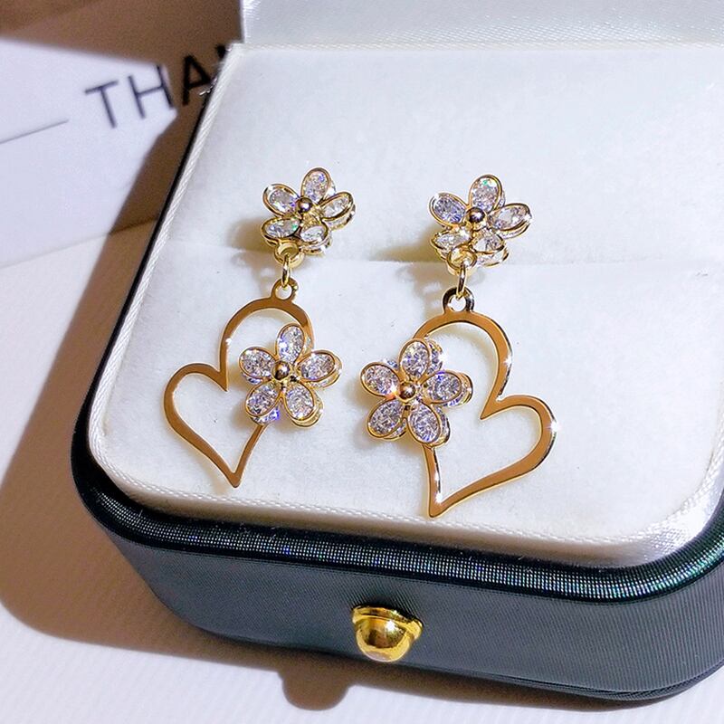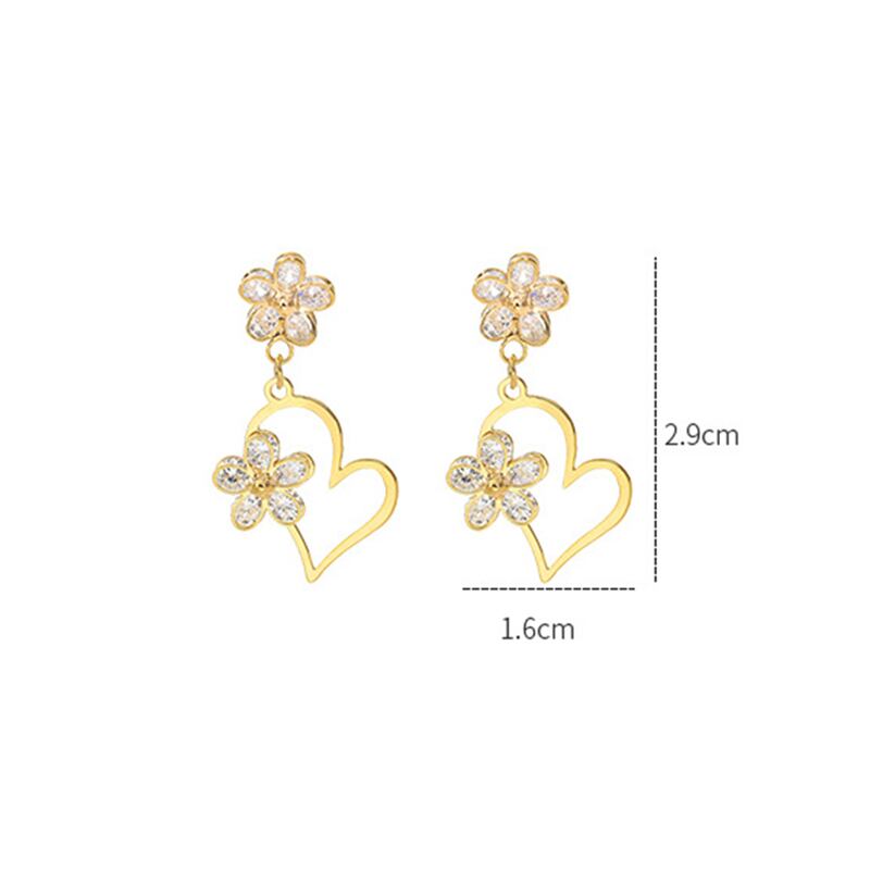 トレンディファイン 14 18k リアルゴールドハート型の花のイヤリング女性気質ジュエリー S925 シルバー針シャイニー AAA ジルコン 指輪 フラワーデザイン 銀
