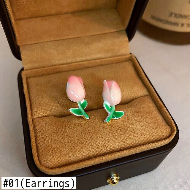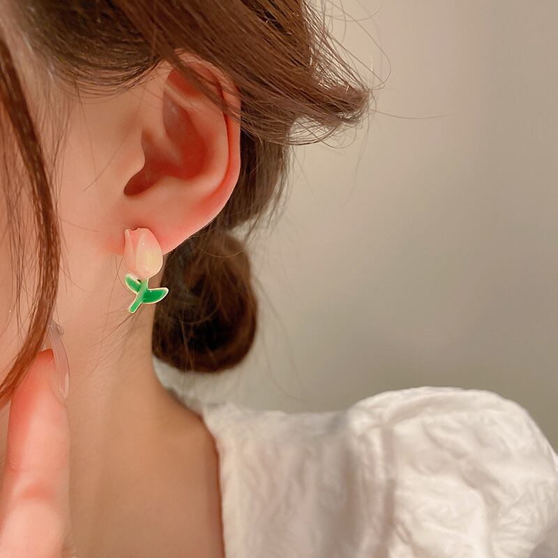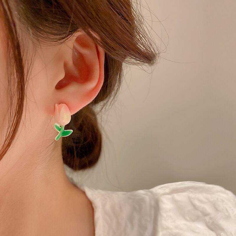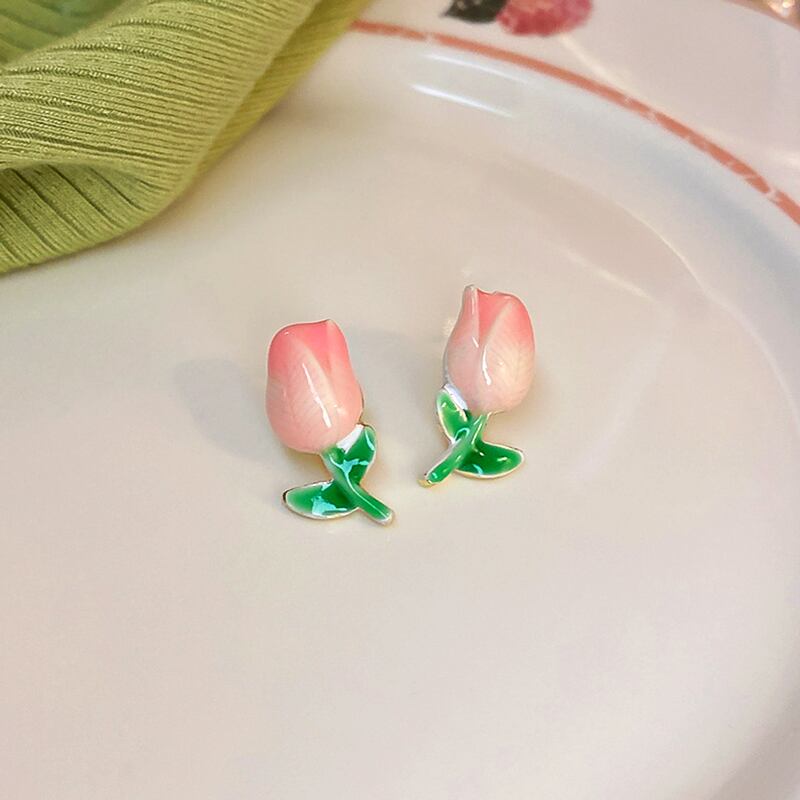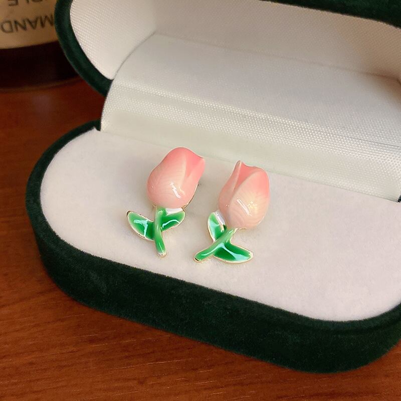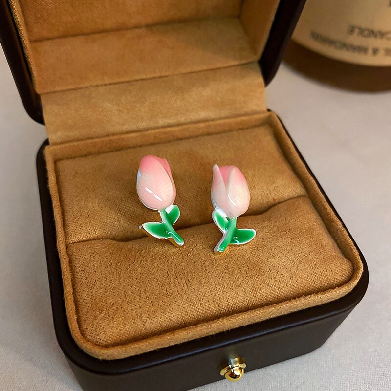 トレンディな 14 18k リアルゴールドメッキエナメルチューリップの花イヤリング女性ガールジュエリー S925 シルバーニードルスタッドギフト 指輪 フラワーデザイン 銀
