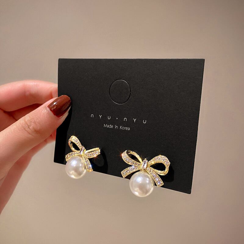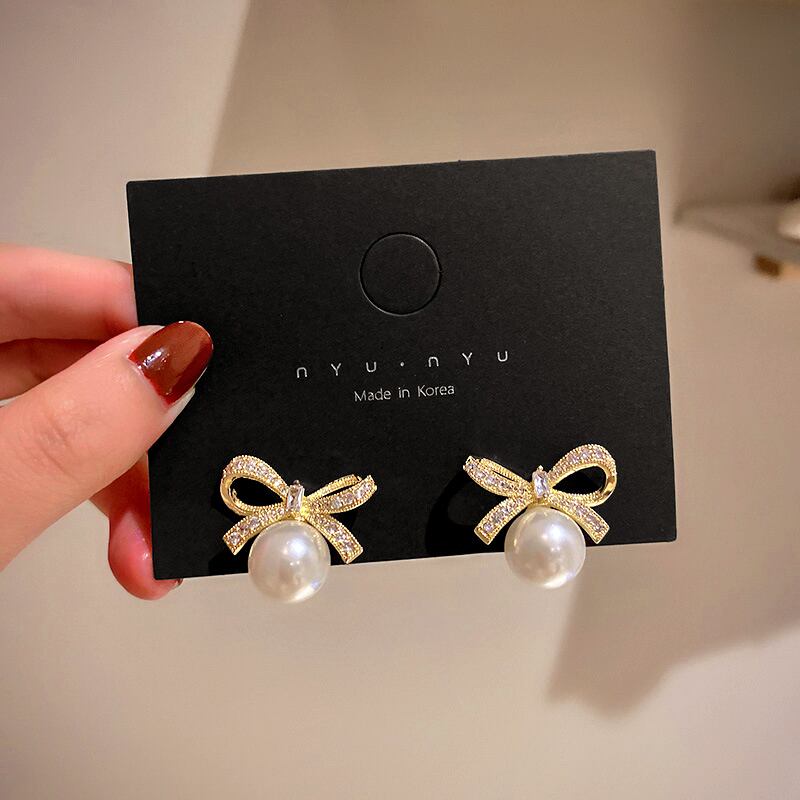 ファイン 14 18K リアルゴールドパールちょう結びスタッドピアス女性ジュエリーシャイニー AAA ジルコン S925 シルバー針 リボン イヤリング 真珠 リング 指輪 銀