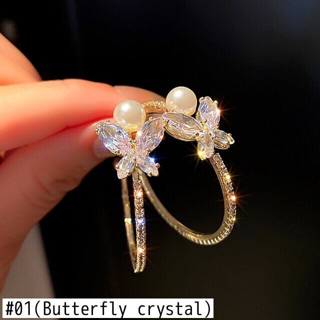 トレンディな 14 18k リアルゴールドクリスタルバタフライパールフープイヤリング女性ジュエリー S925 シルバー針シャイニージルコンギフト 真珠 指輪 銀