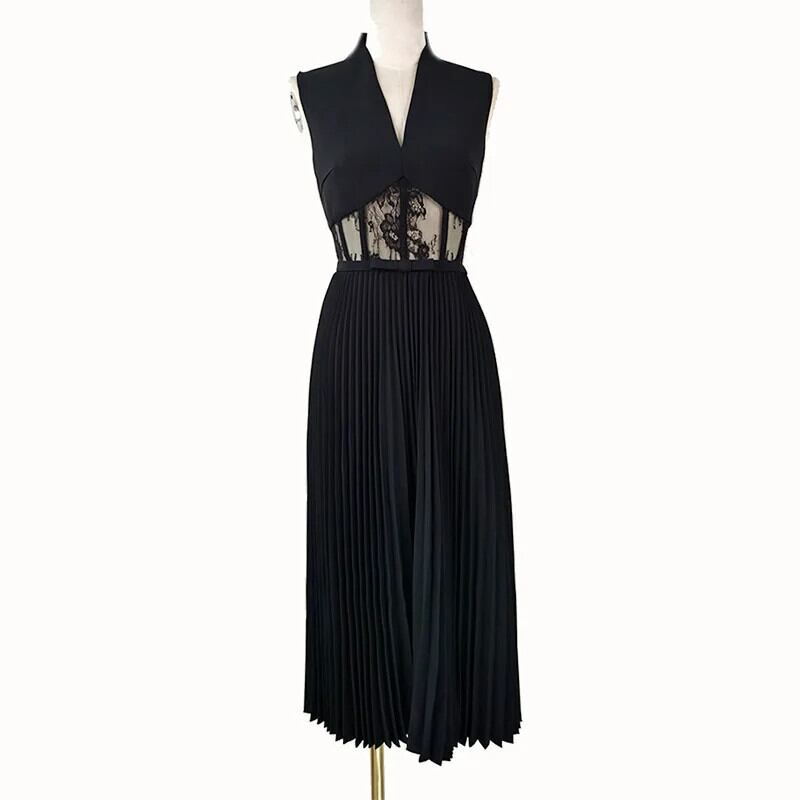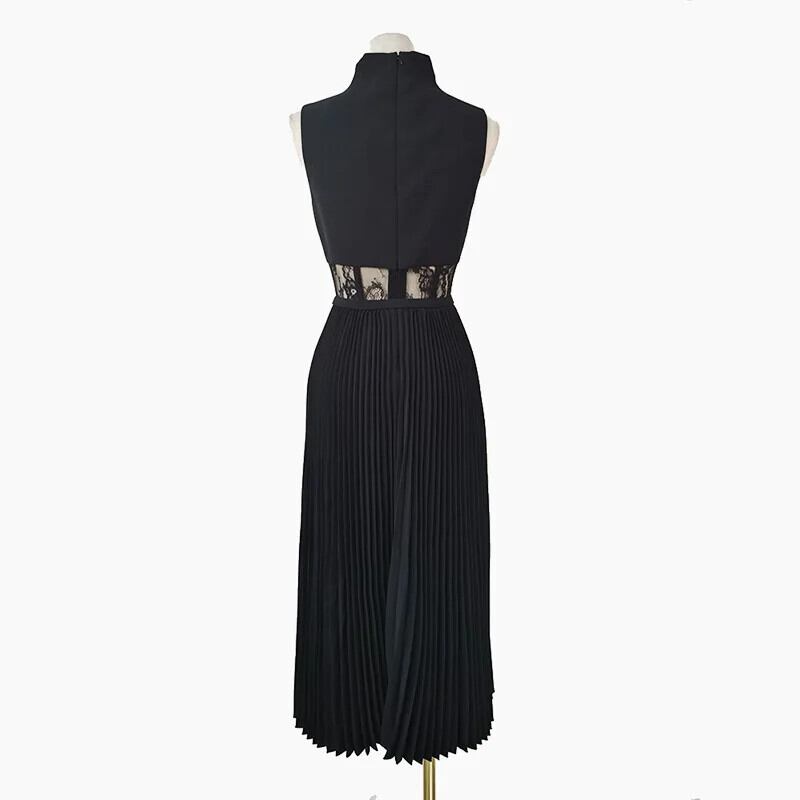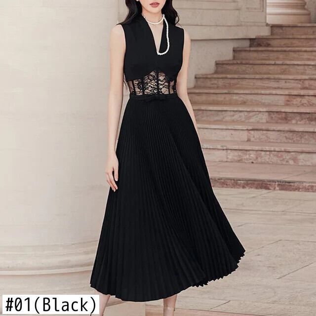 夏黒セクシードレスレースアウトウエスト気質プリーツドレス ブラック サマー 夏物