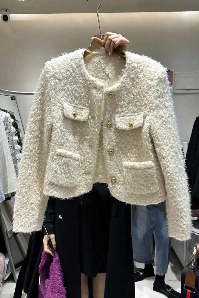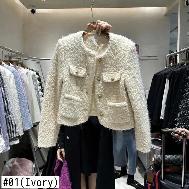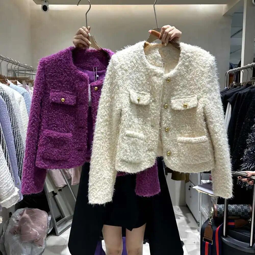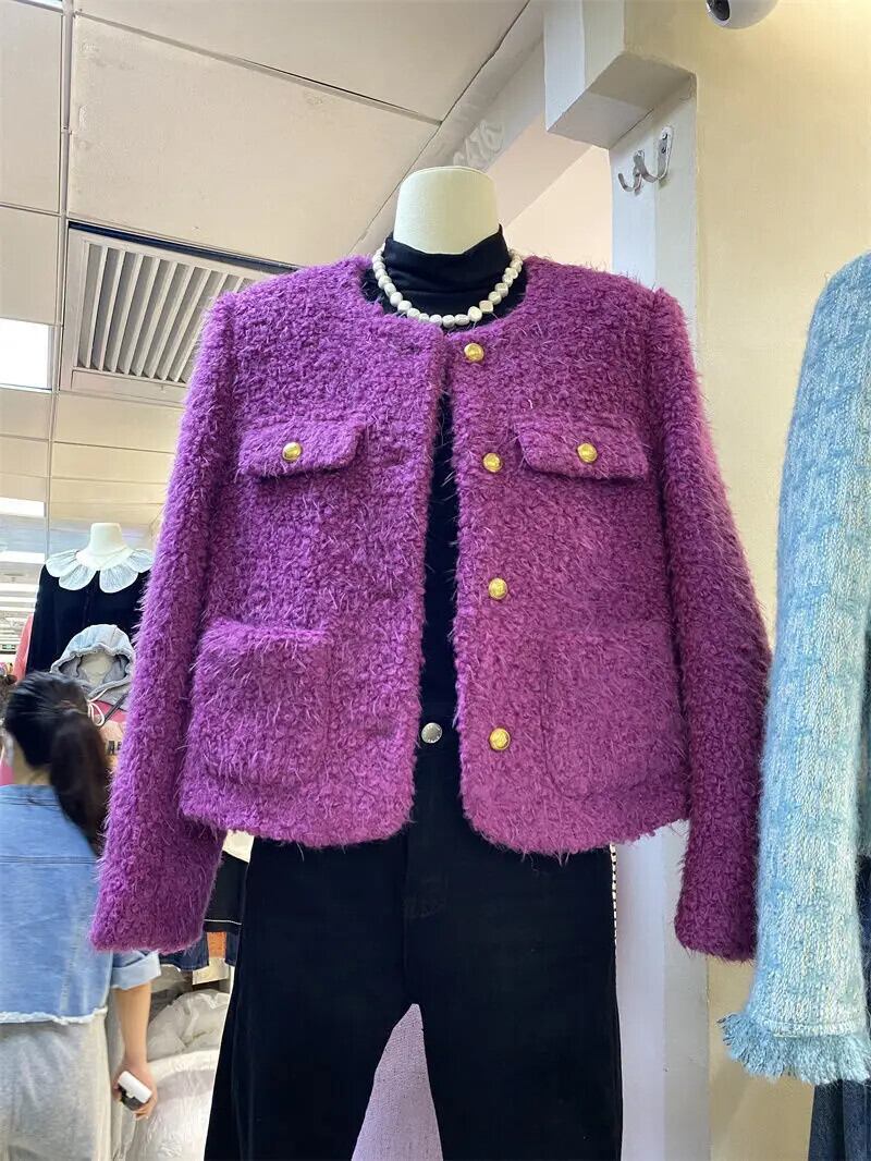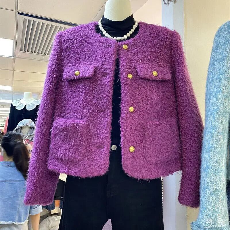 冬ウールコート白紫肥厚ソフトラウンドネックルーズシングルボタンジャケット ホワイト ウィンター 冬物 Oネック パープル