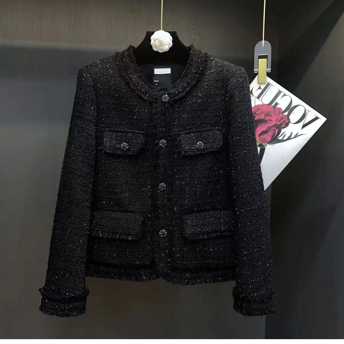 秋冬スーツコートショートラウンドネックブラックツイード気質Cicブレザー オータム 秋物 ウィンター 冬物 Oネック