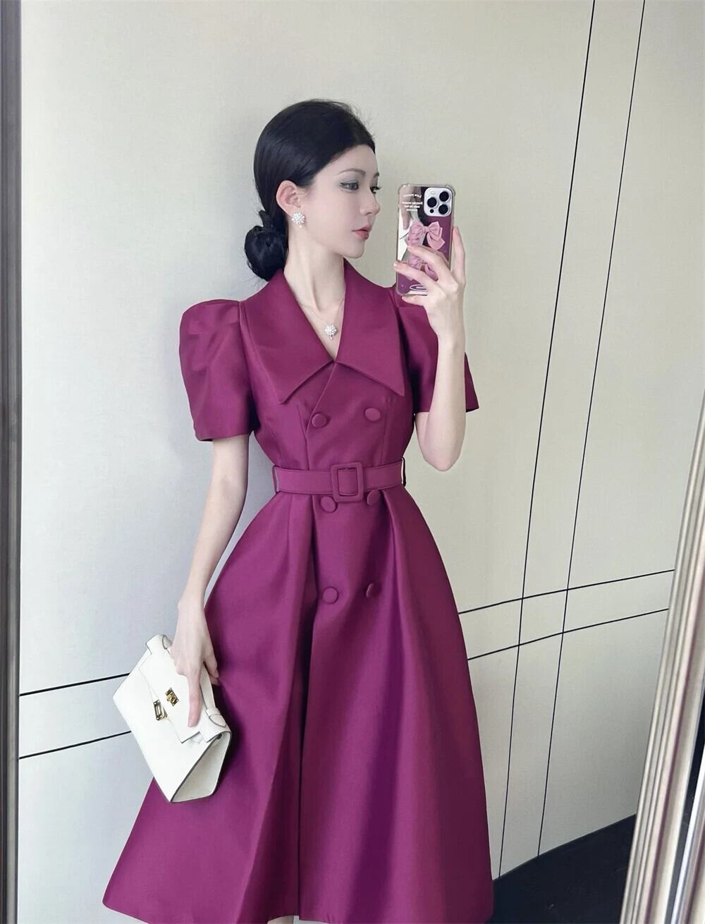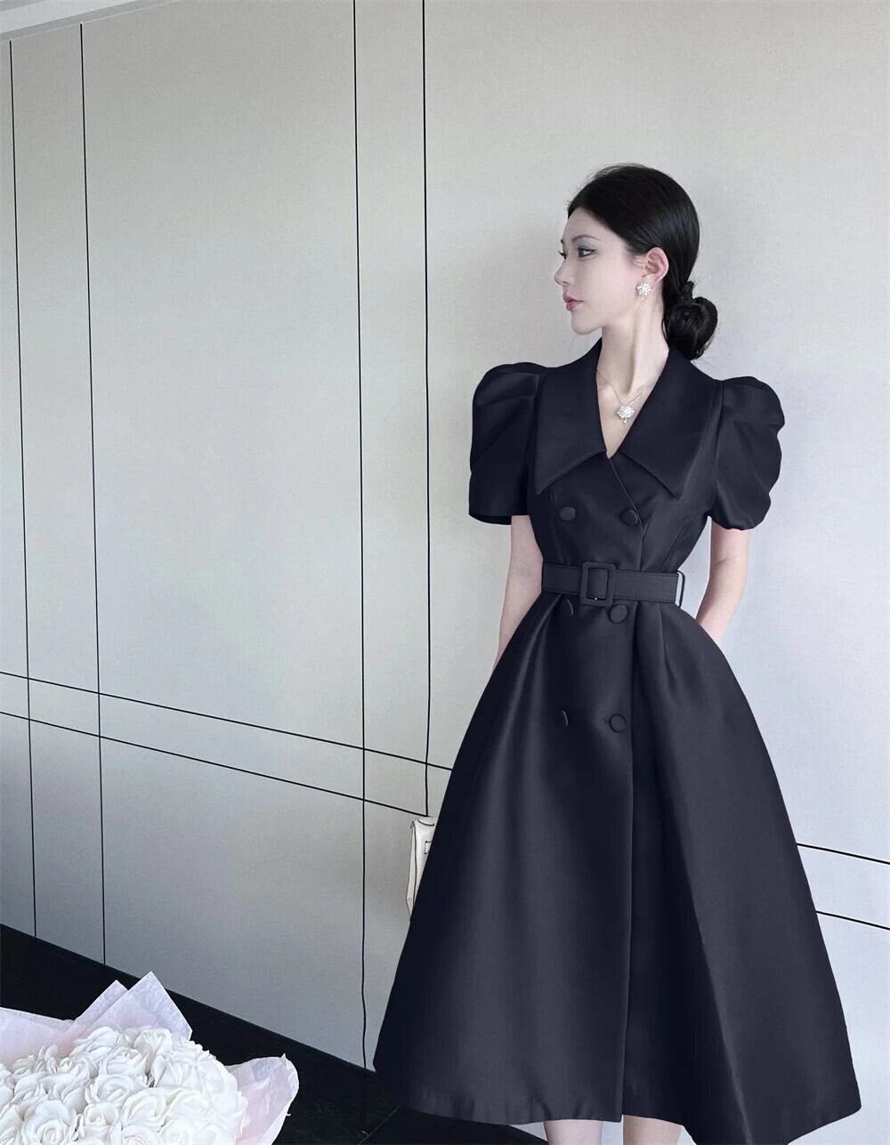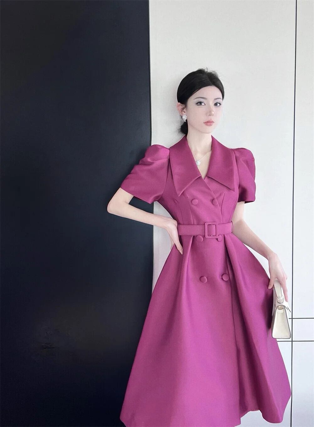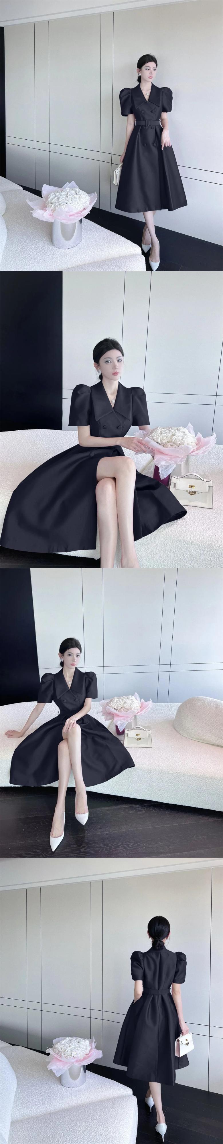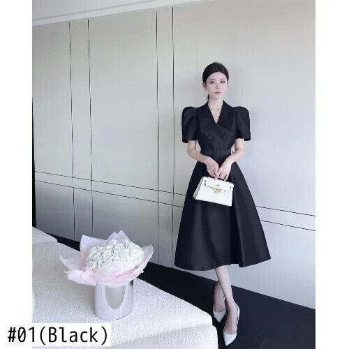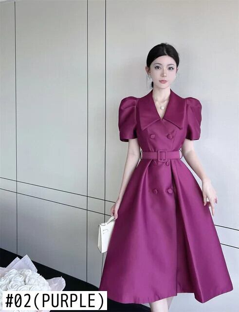 夏スタイル バブル スリーブ ロング レースアップ スーツ ドレス レディース パープル ブラック サマー 夏物