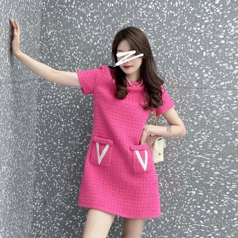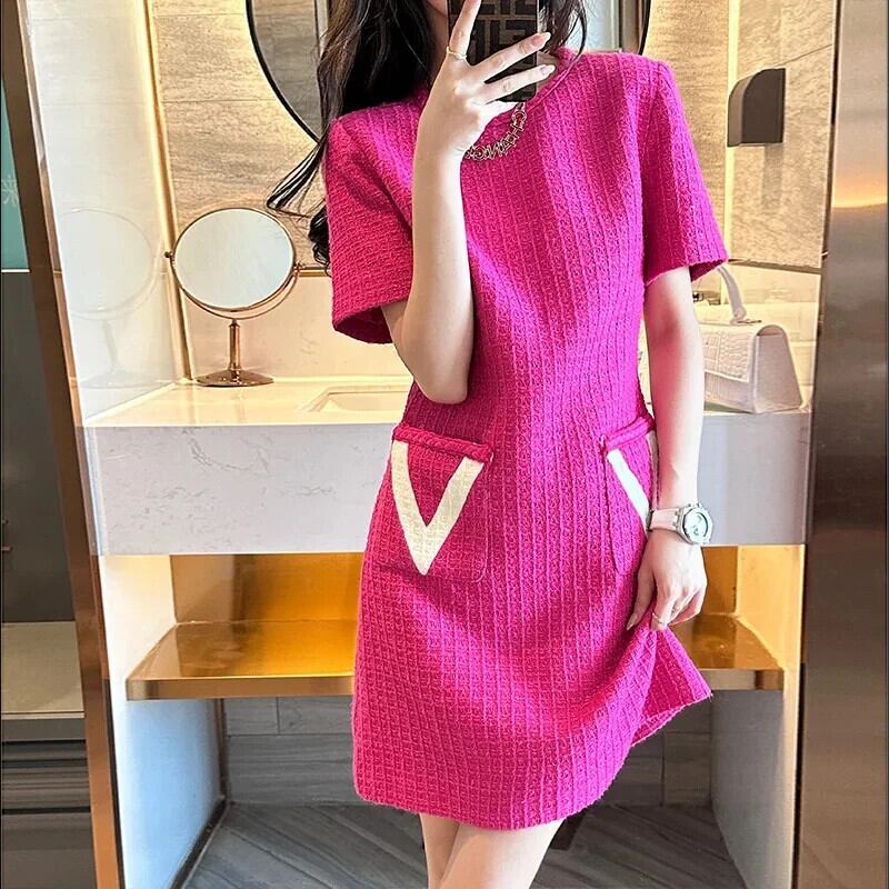 夏ツイード ラウンドネック ストレート チューブ ピンク シック スリム パーティー ドレス 甘い 大人ガーリー スウィート キュート カジュアル サマー 夏物 Oネック