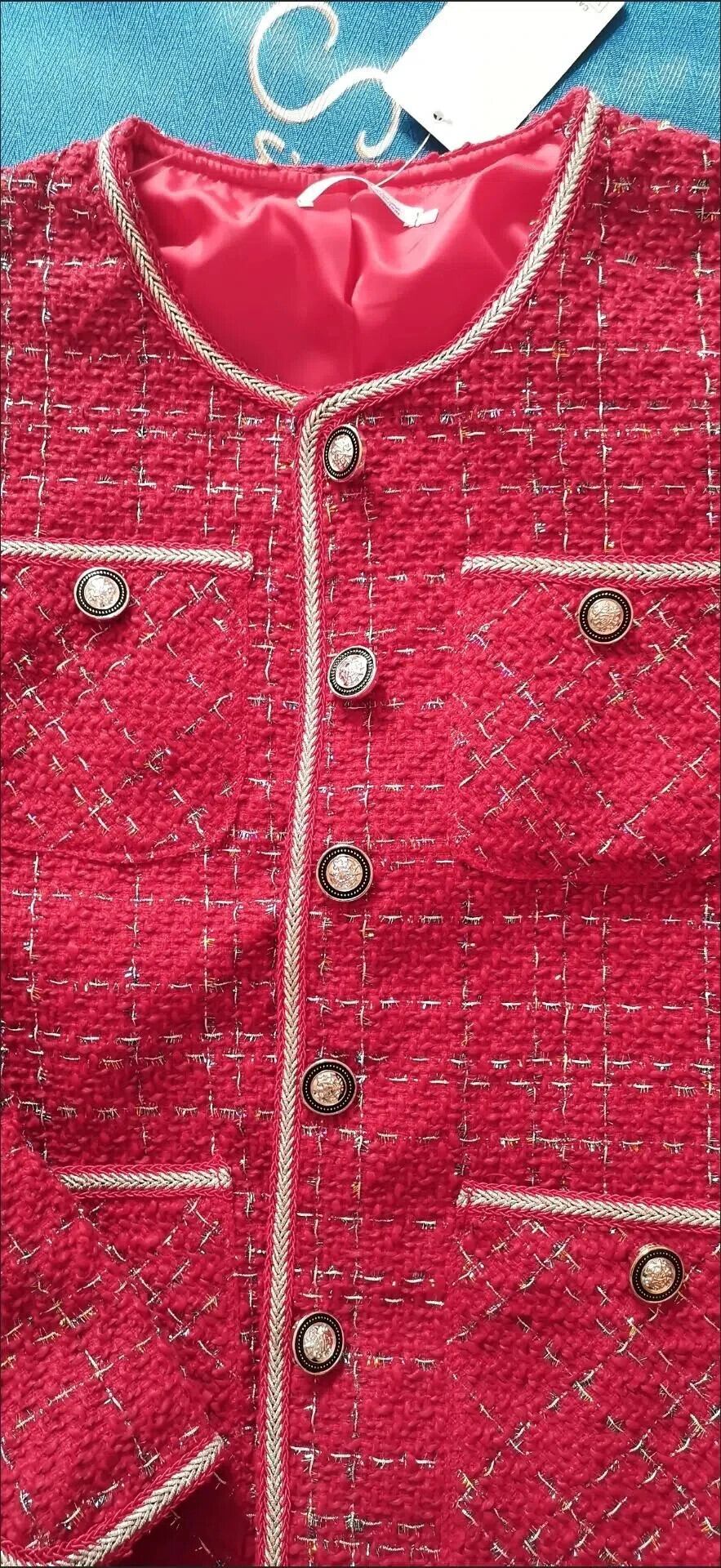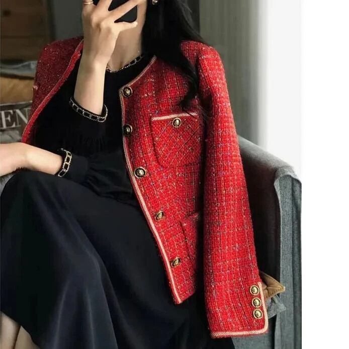 ツイード ブレザー レディース ショート イン 秋冬 ルーズ レッド ラウンドネック シングルブレスト スーツ ジャケット オータム 秋物 ウィンター 冬物 Oネック