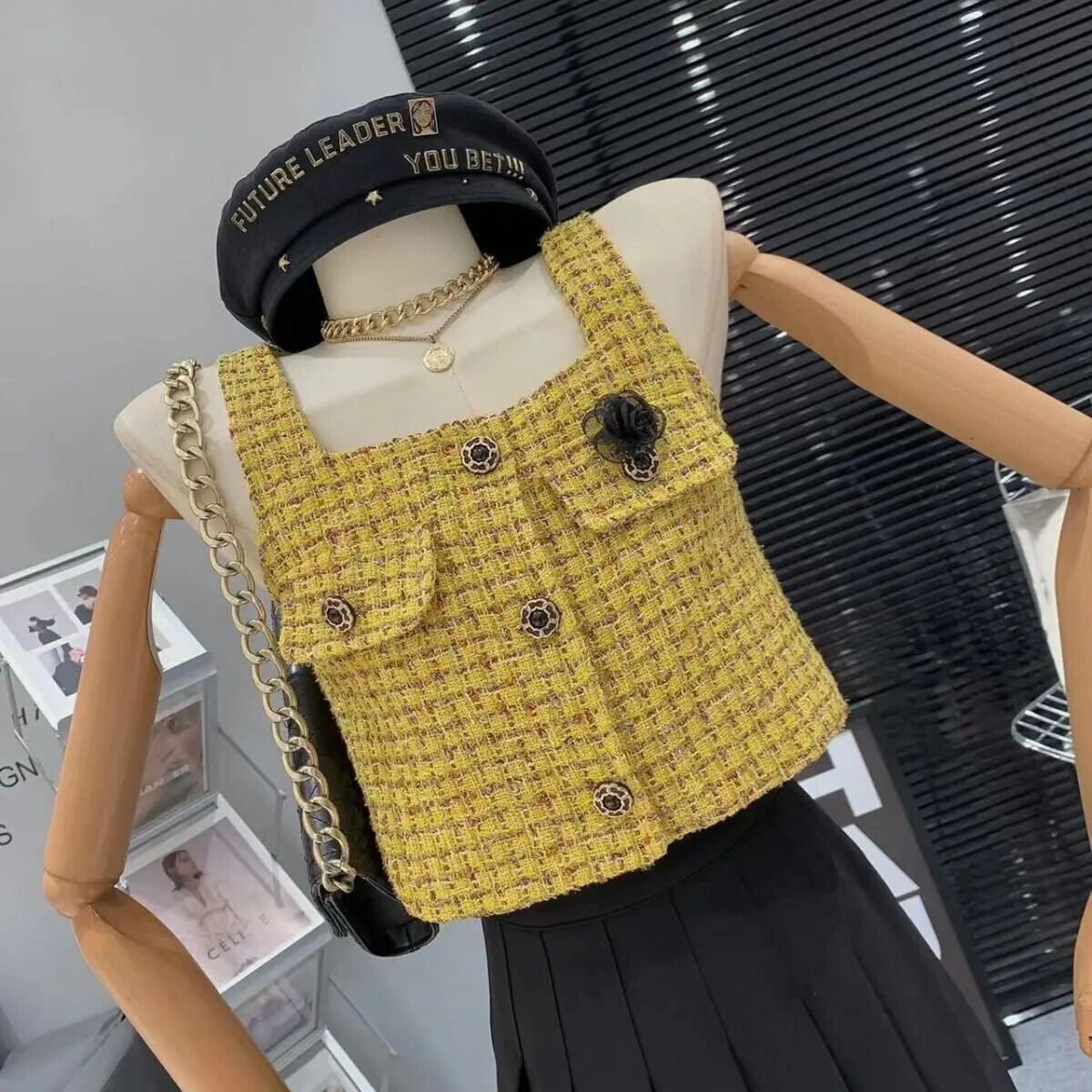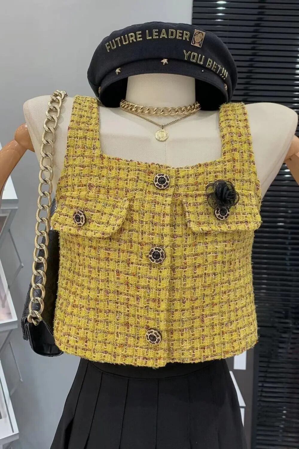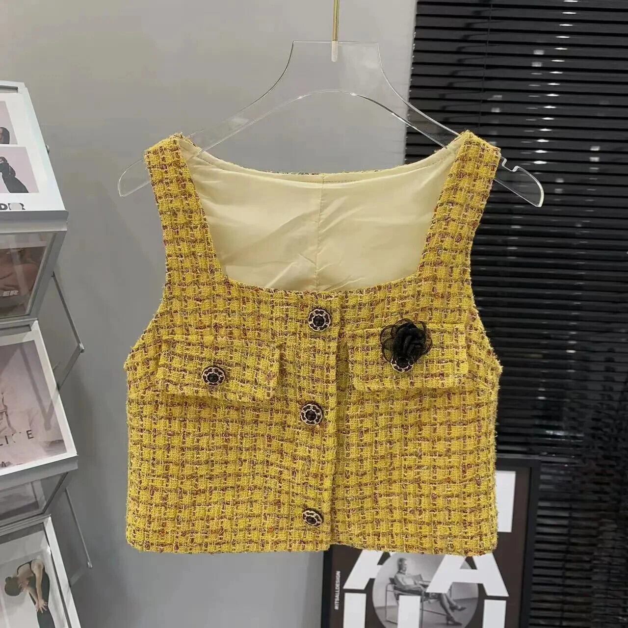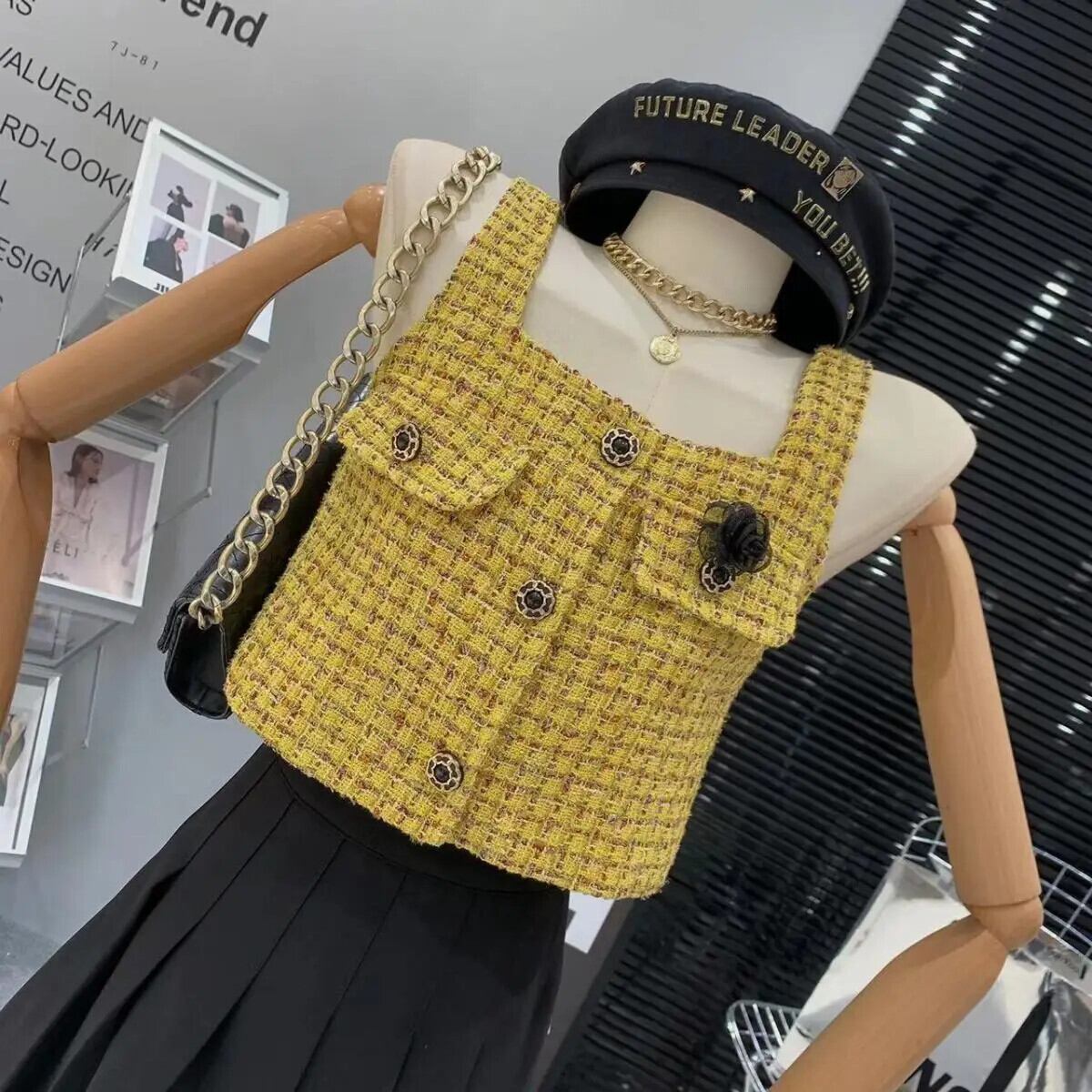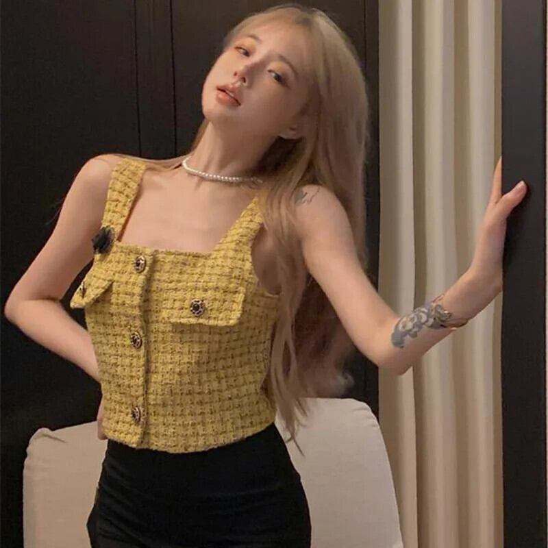 3D 花香りスクエアカラーチョッキウエストショートレトロゴールドチェック柄スクエアカラーノースリーブベストトレンディコート フラワーデザイン スクウェア