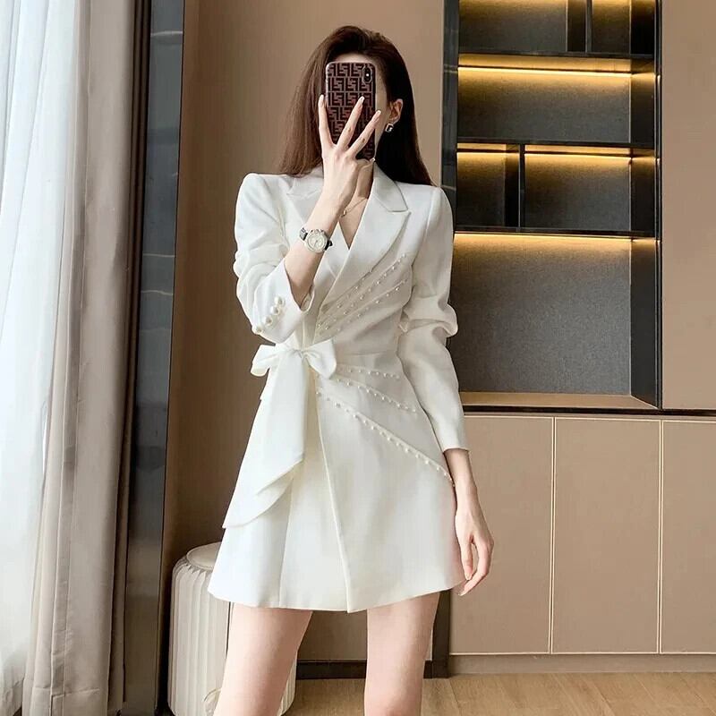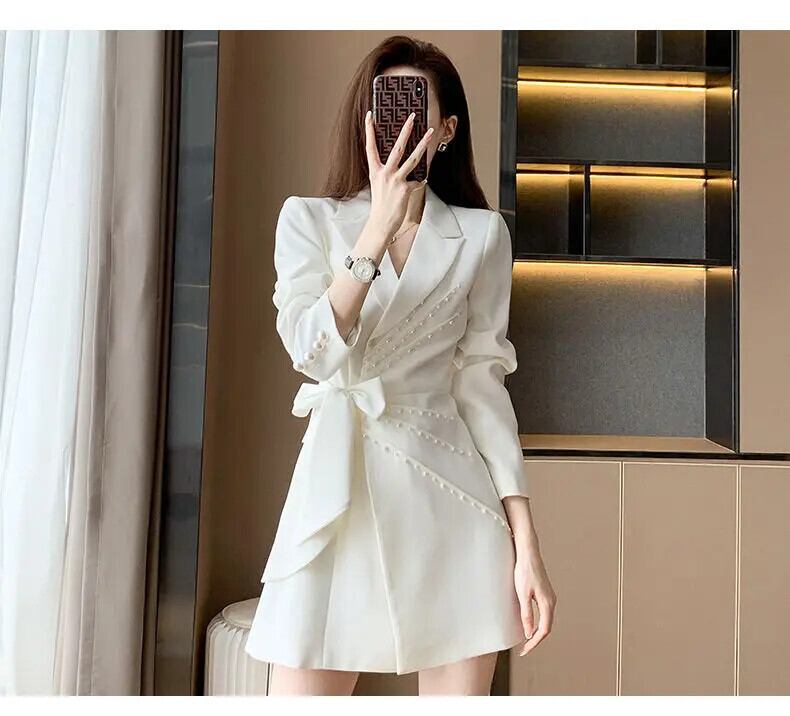 春秋長袖ビーズリボンスーツドレスレディースホワイトミッドレングス ロング スプリング 春物 オータム 秋物