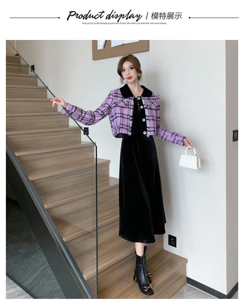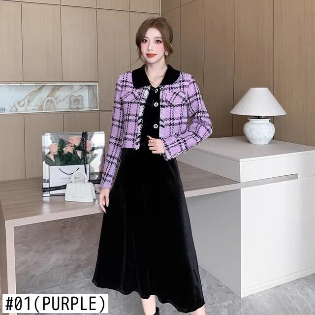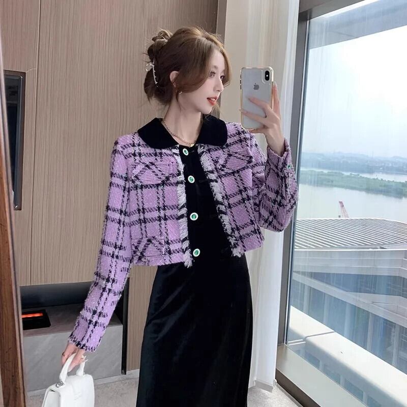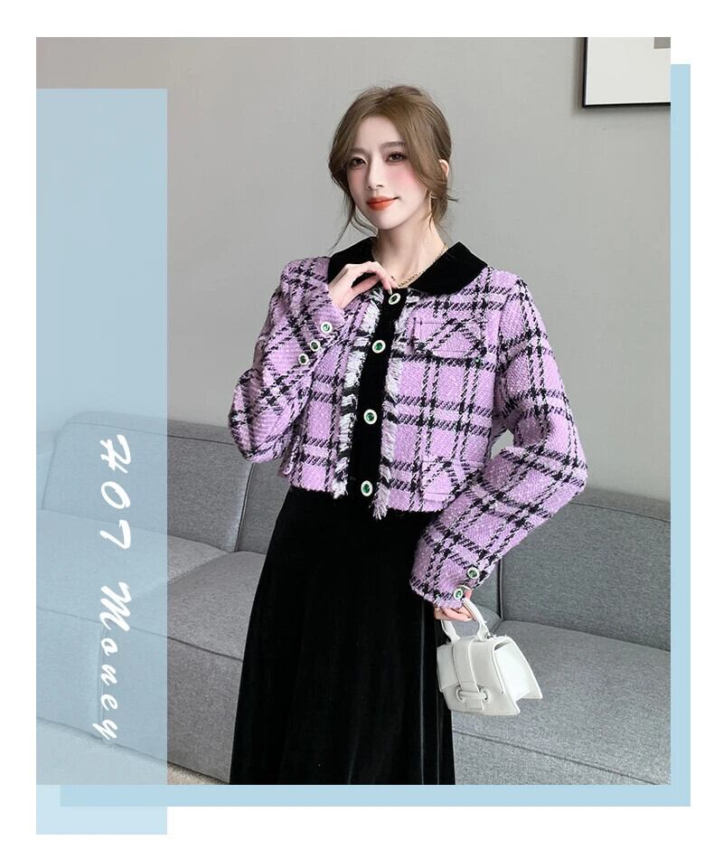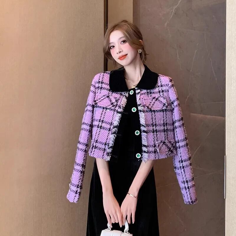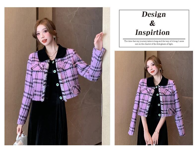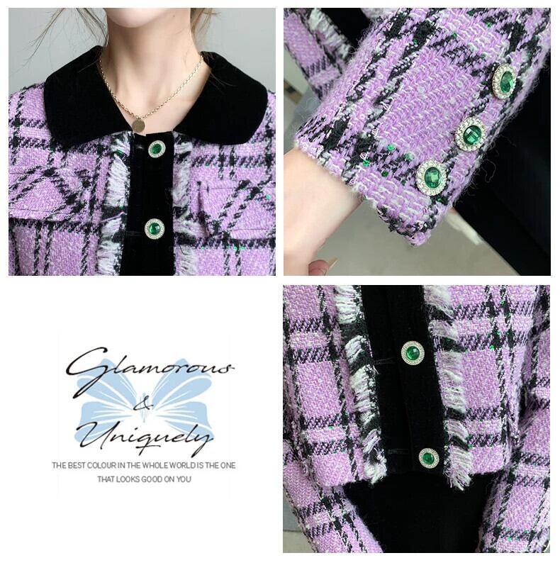 レディース秋冬人気チェック柄パープルツイードコートアウタージャケット オータム 秋物 ウィンター 冬物
