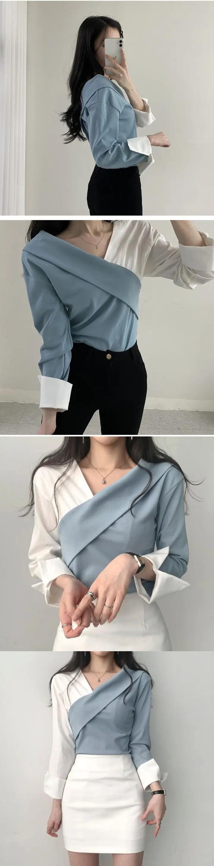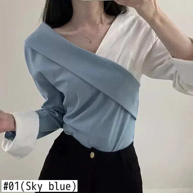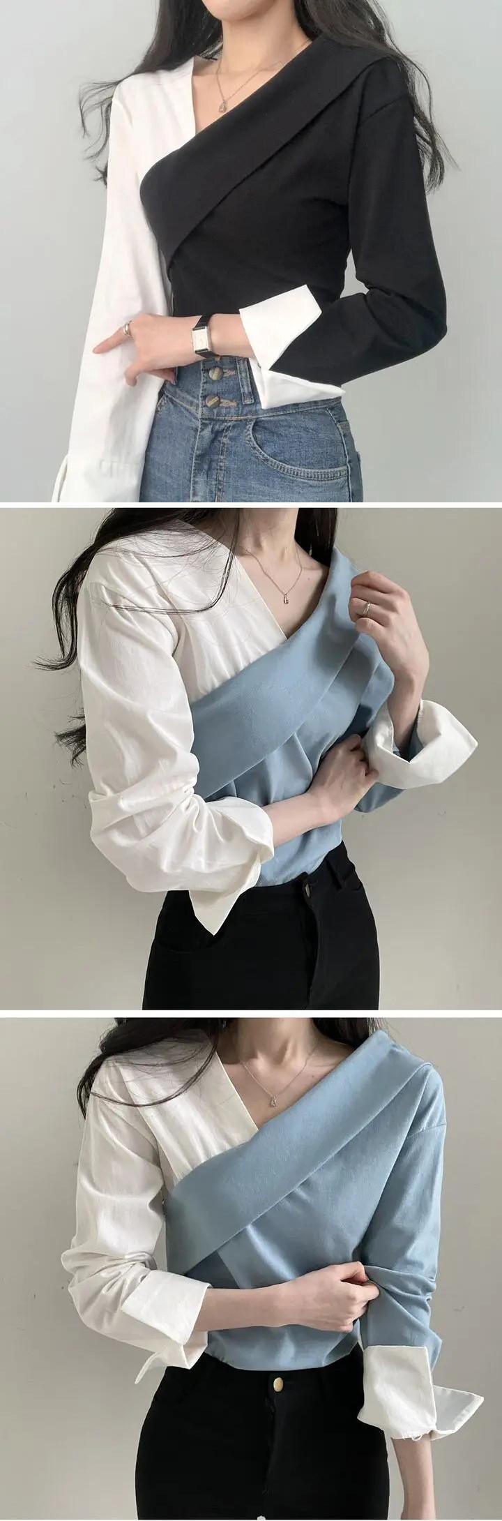 不規則長袖シャツコントラストカラーステッチレディース春ブラウス ロング スプリング 春物