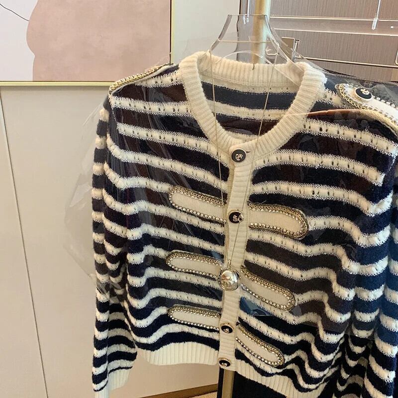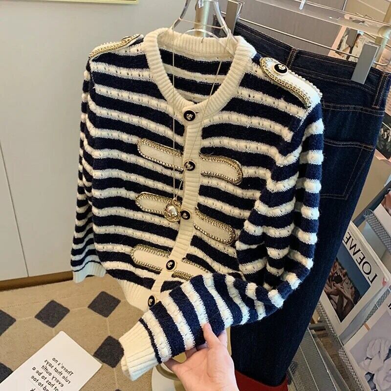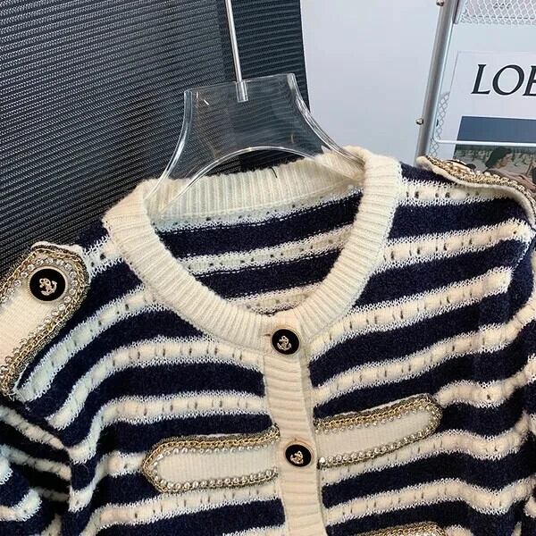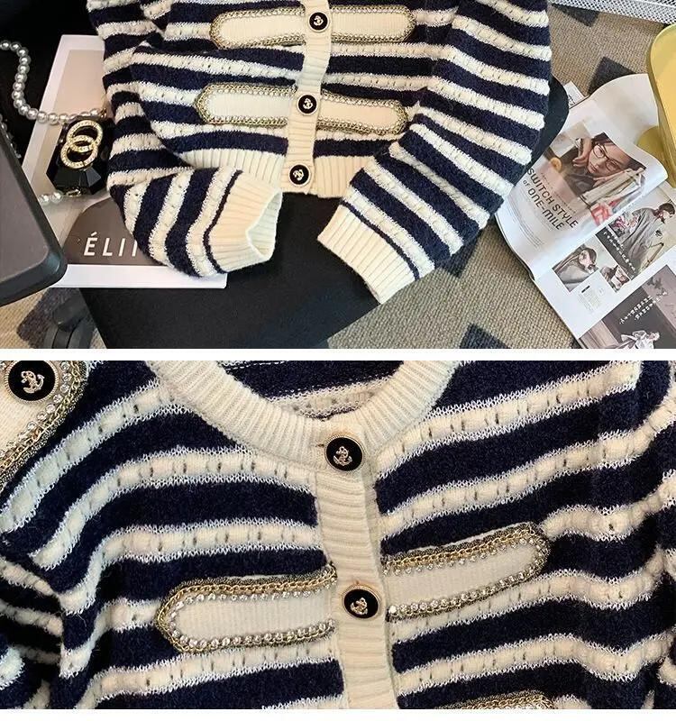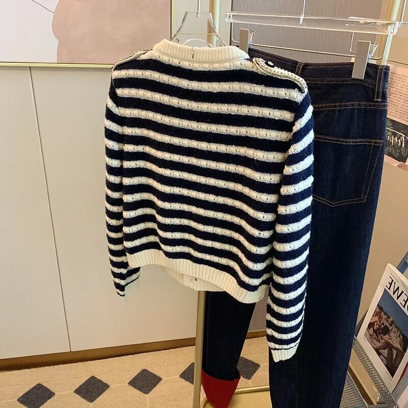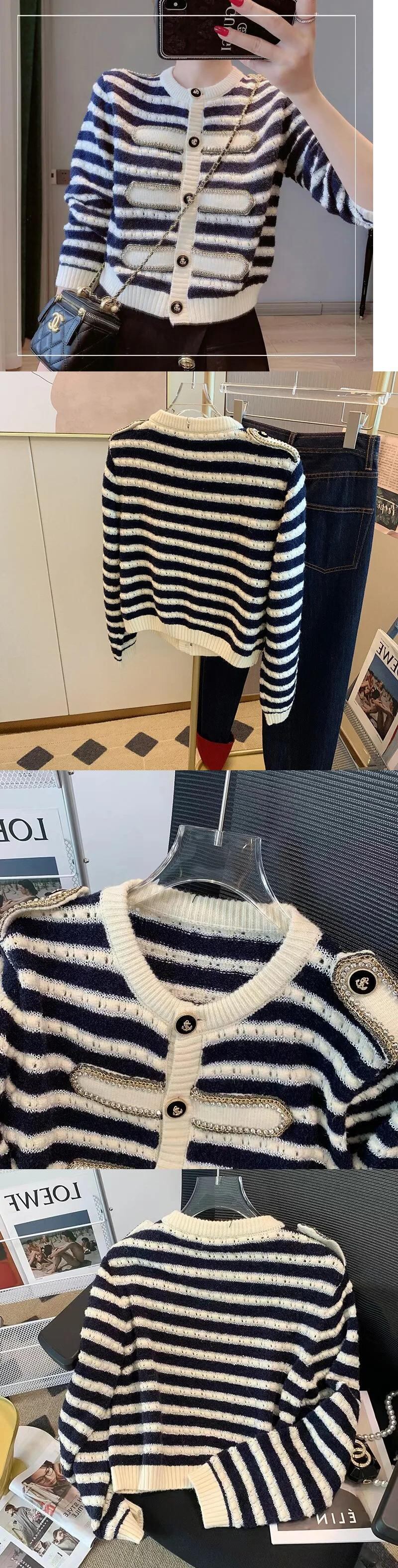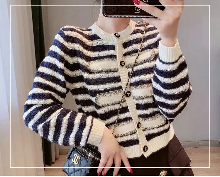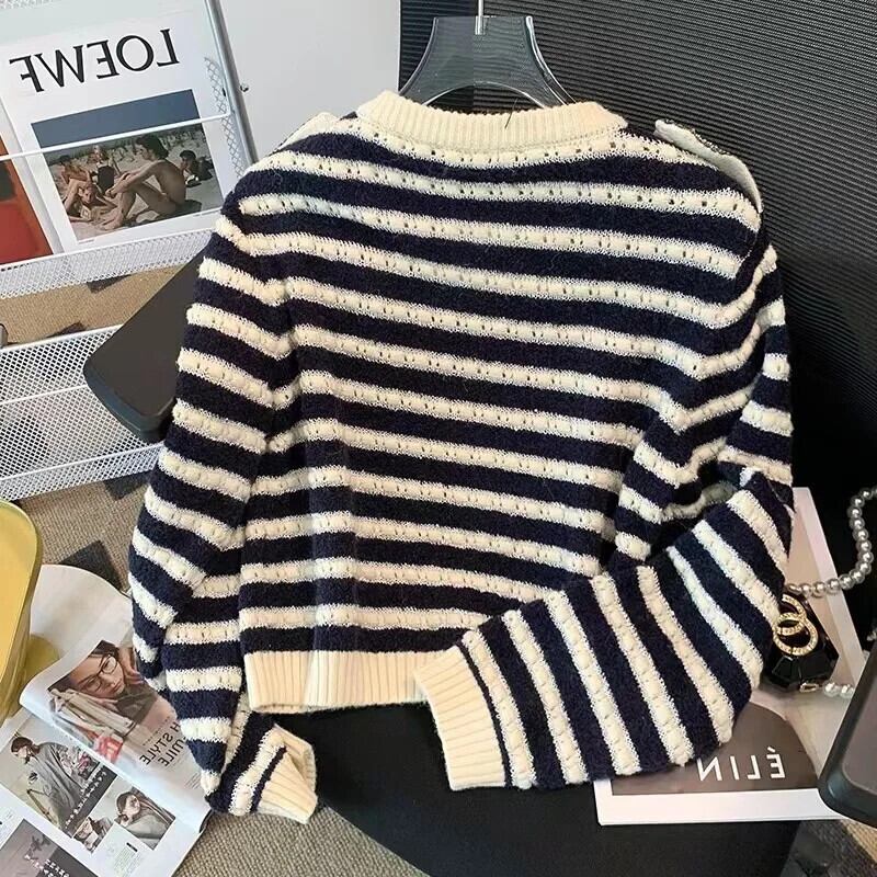 ストライプニットカーディガンセーター秋ルーズOネックシングルブレストクロップトップ オータム 秋物