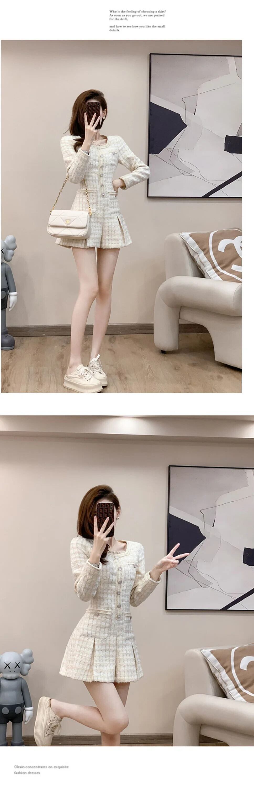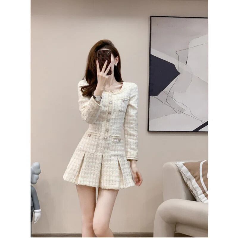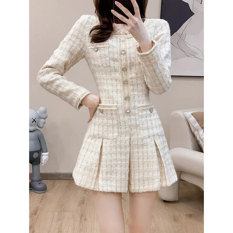 秋冬香りスタイルスリムフィット長袖厚手ツイードドレス ロング オータム 秋物 ウィンター 冬物