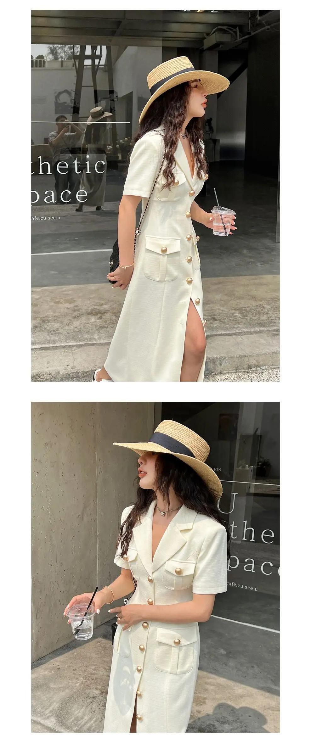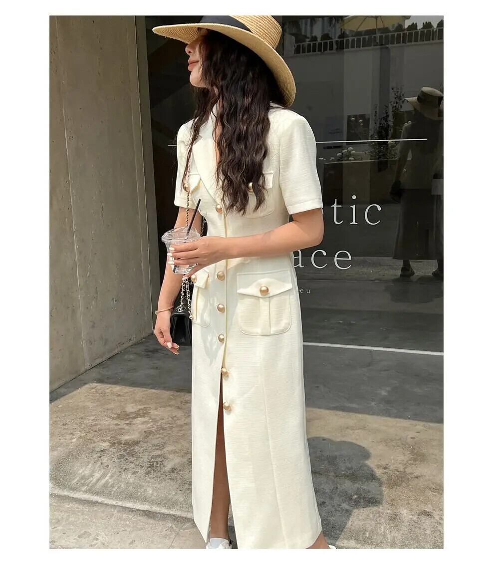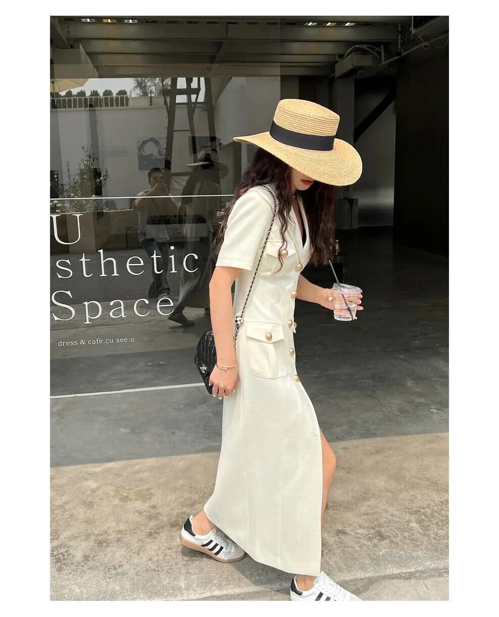 夏シングルブレスト半袖スリムフィットロングストレートスプリットドレスウエスト閉鎖 Vestidos ショート ハーフスリーブ サマー 夏物