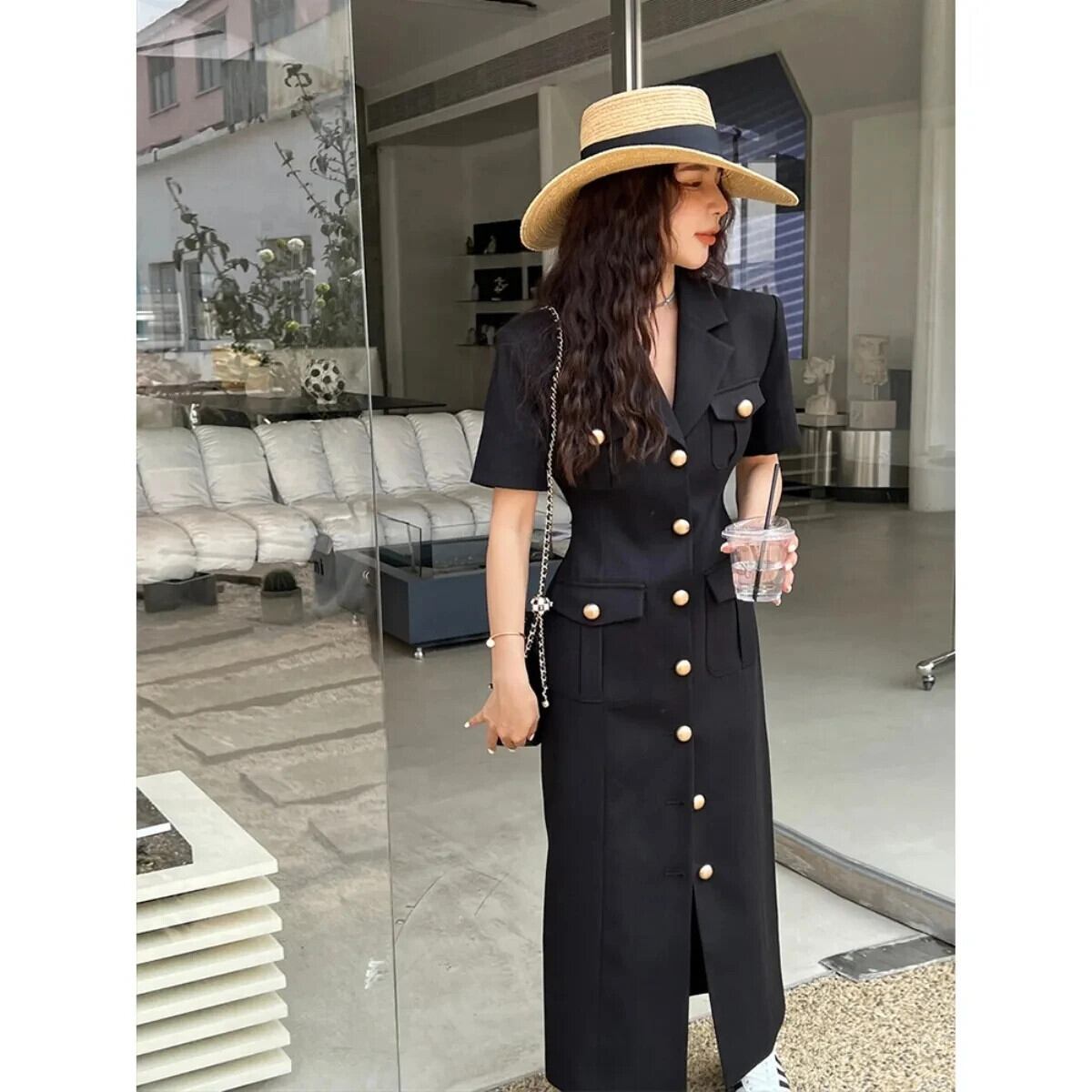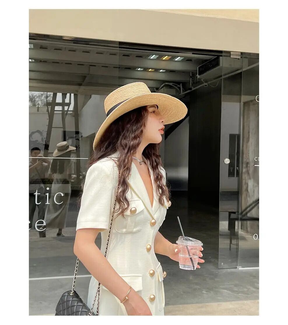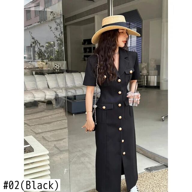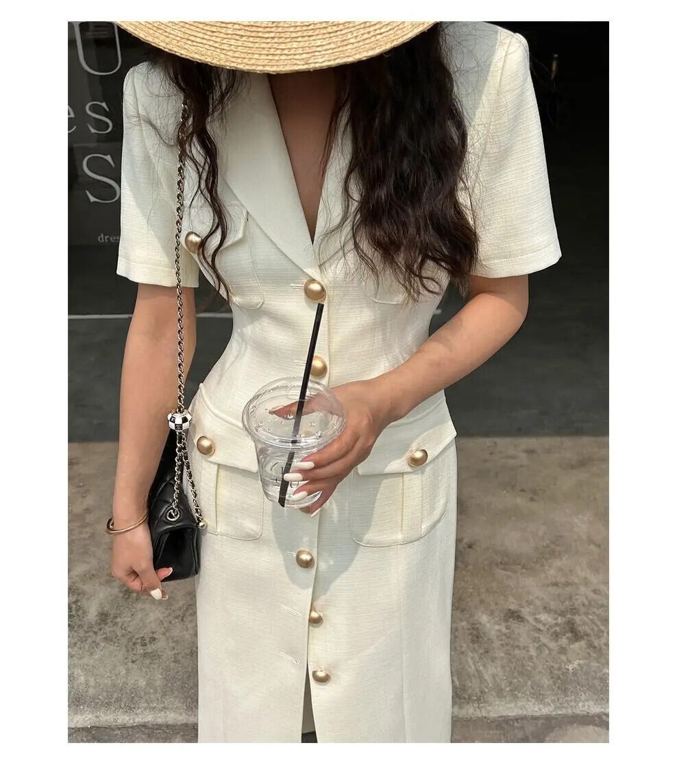 夏シングルブレスト半袖スリムフィットロングストレートスプリットドレスウエスト閉鎖 Vestidos ショート ハーフスリーブ サマー 夏物