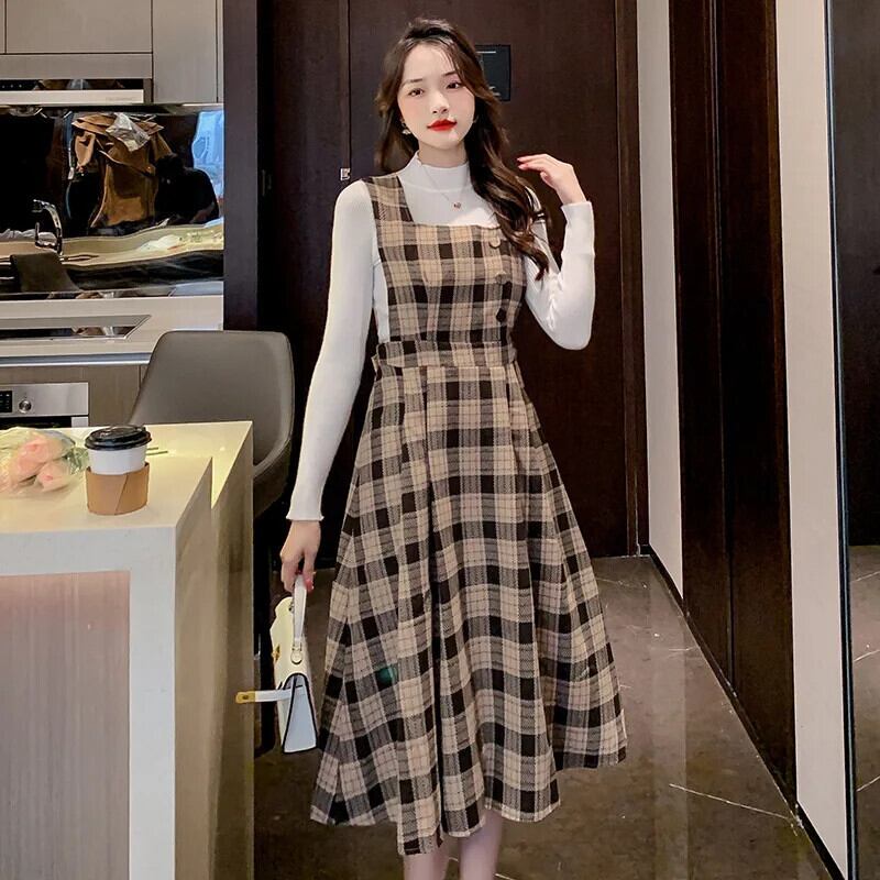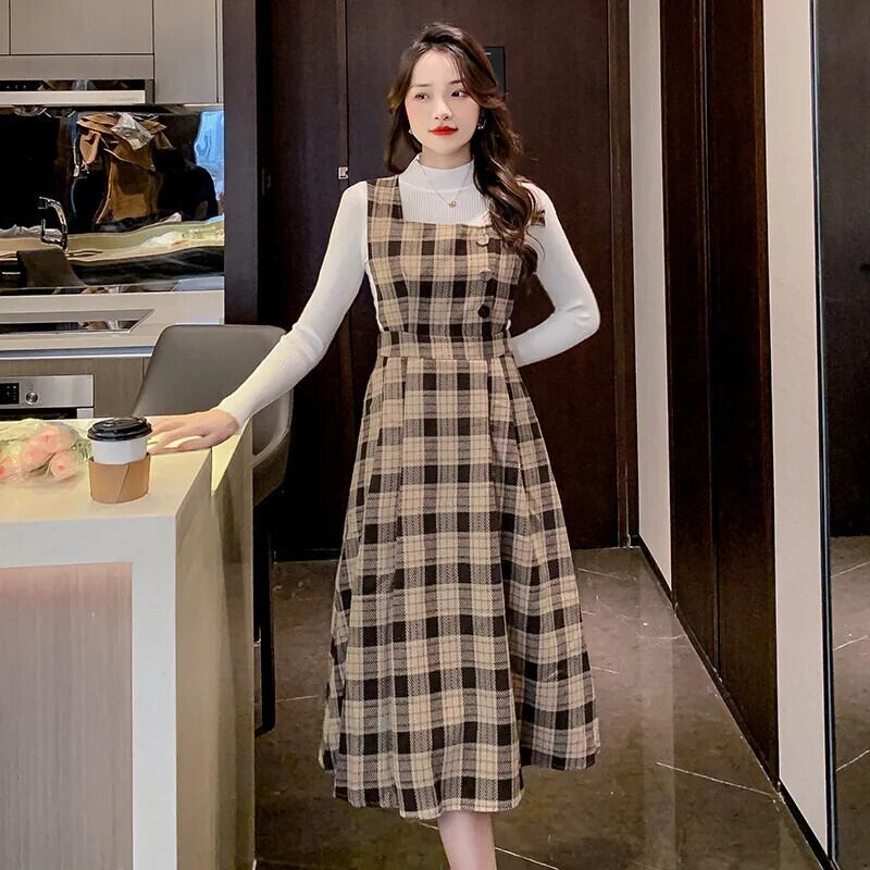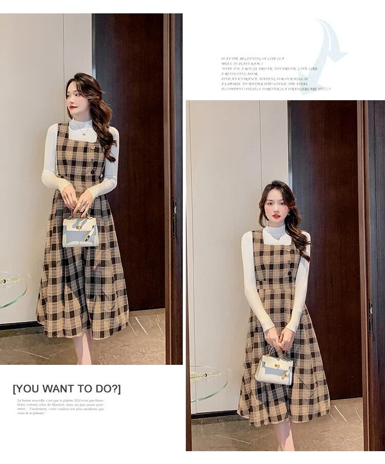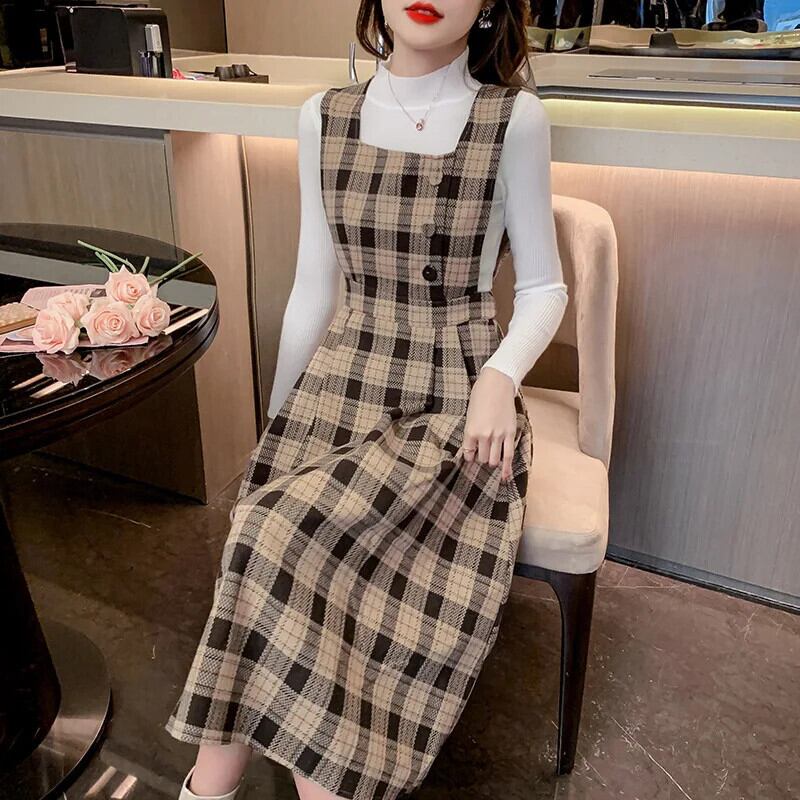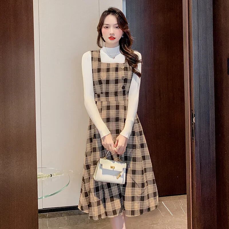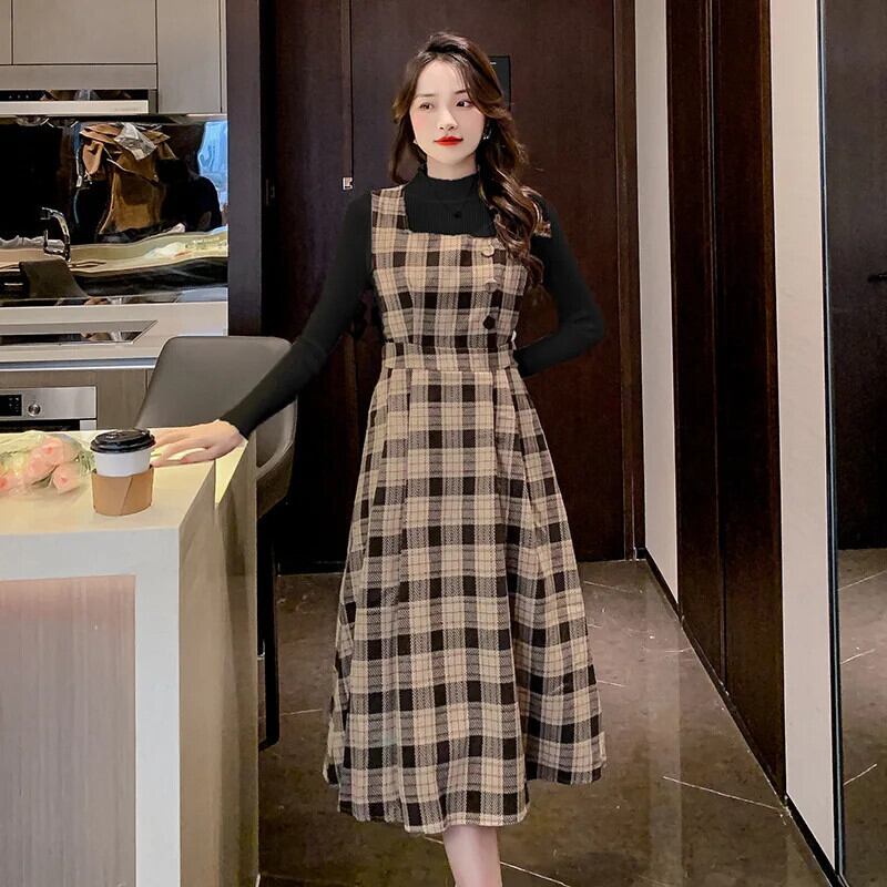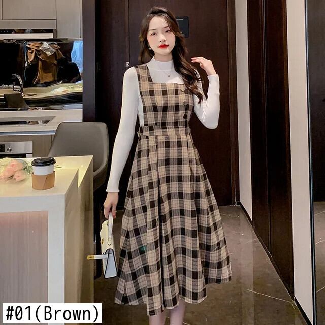 レディースゆったり秋冬レトロチェック柄スラップロングドレス オータム 秋物 ウィンター 冬物