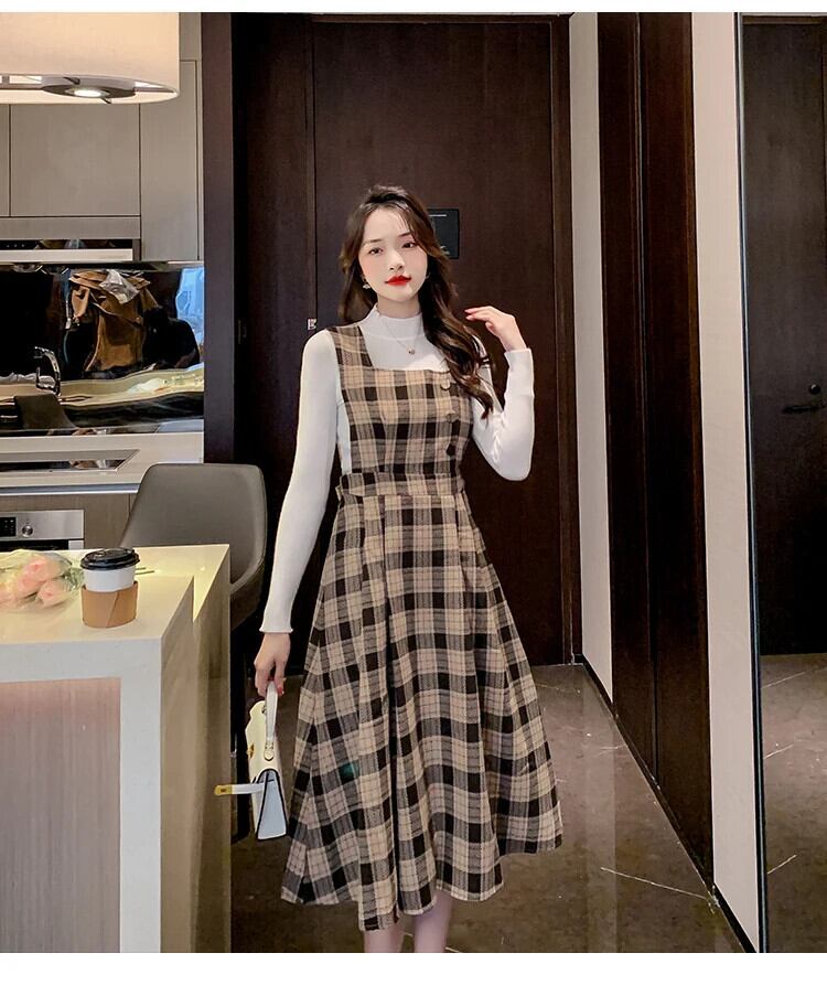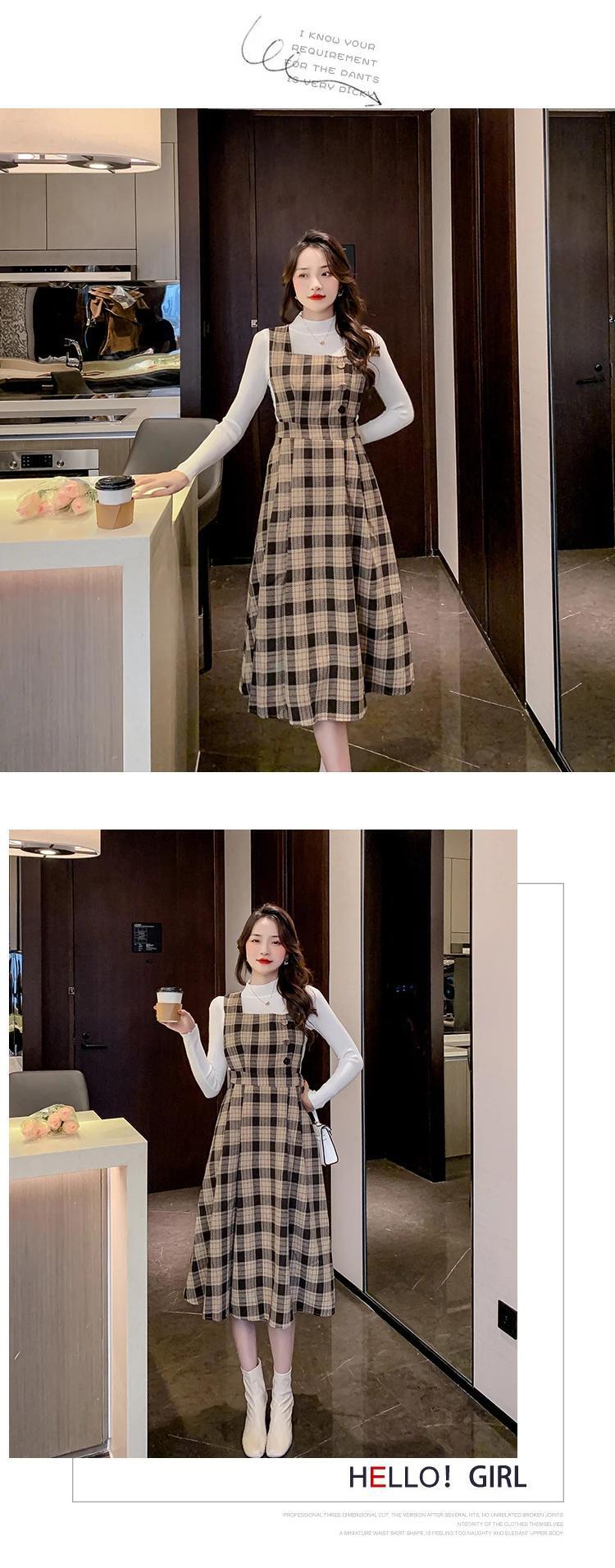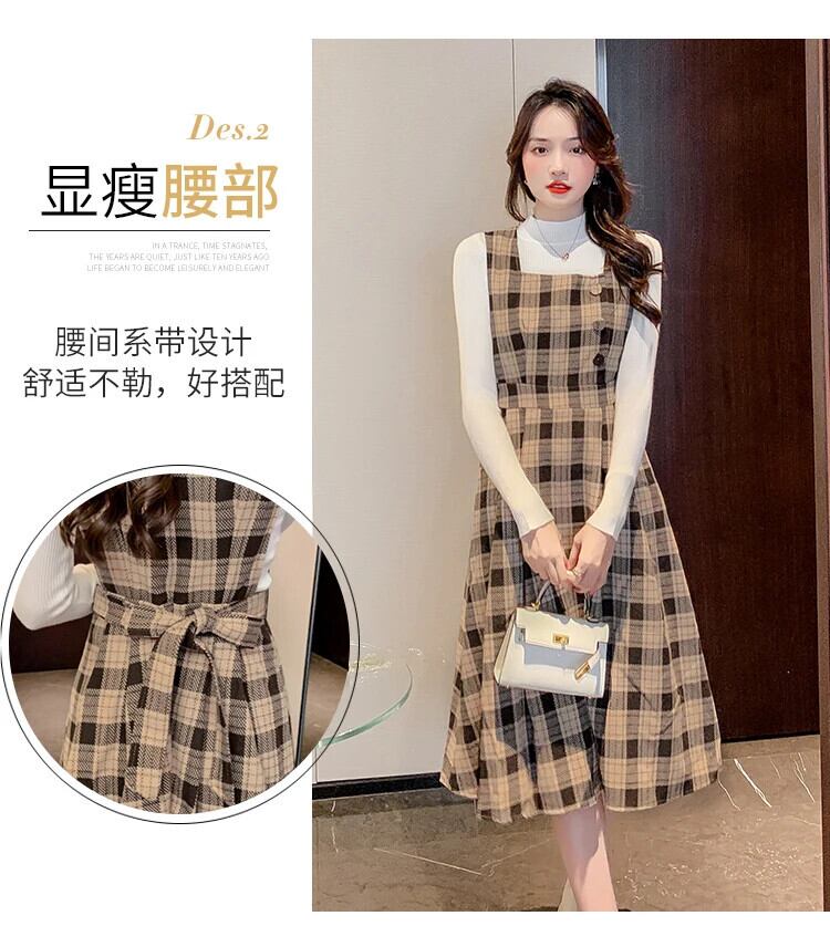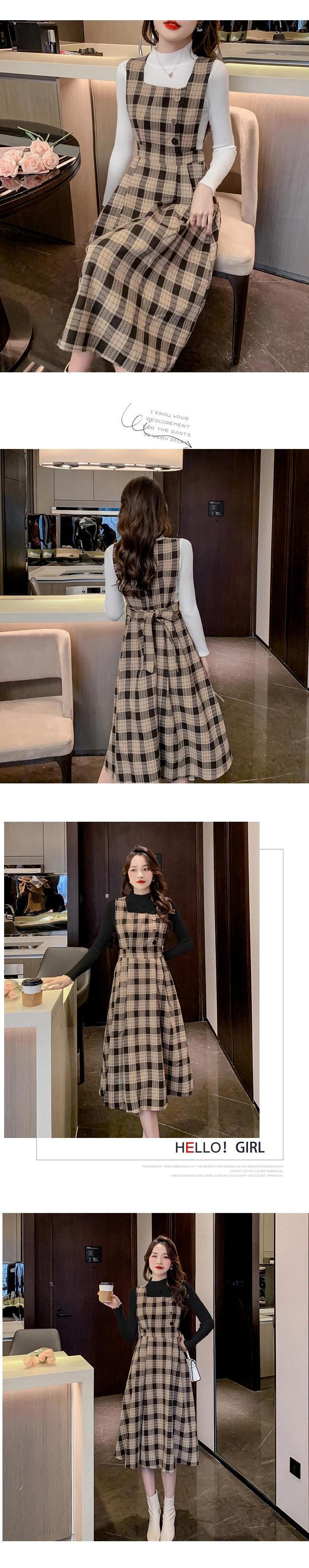レディースゆったり秋冬レトロチェック柄スラップロングドレス オータム 秋物 ウィンター 冬物