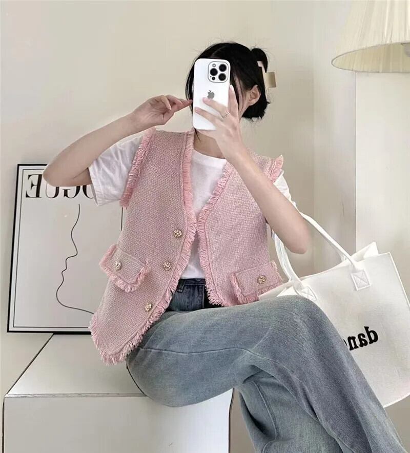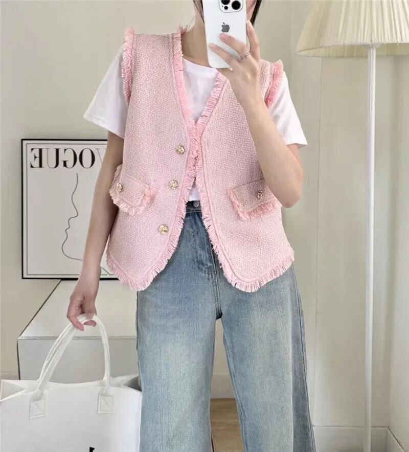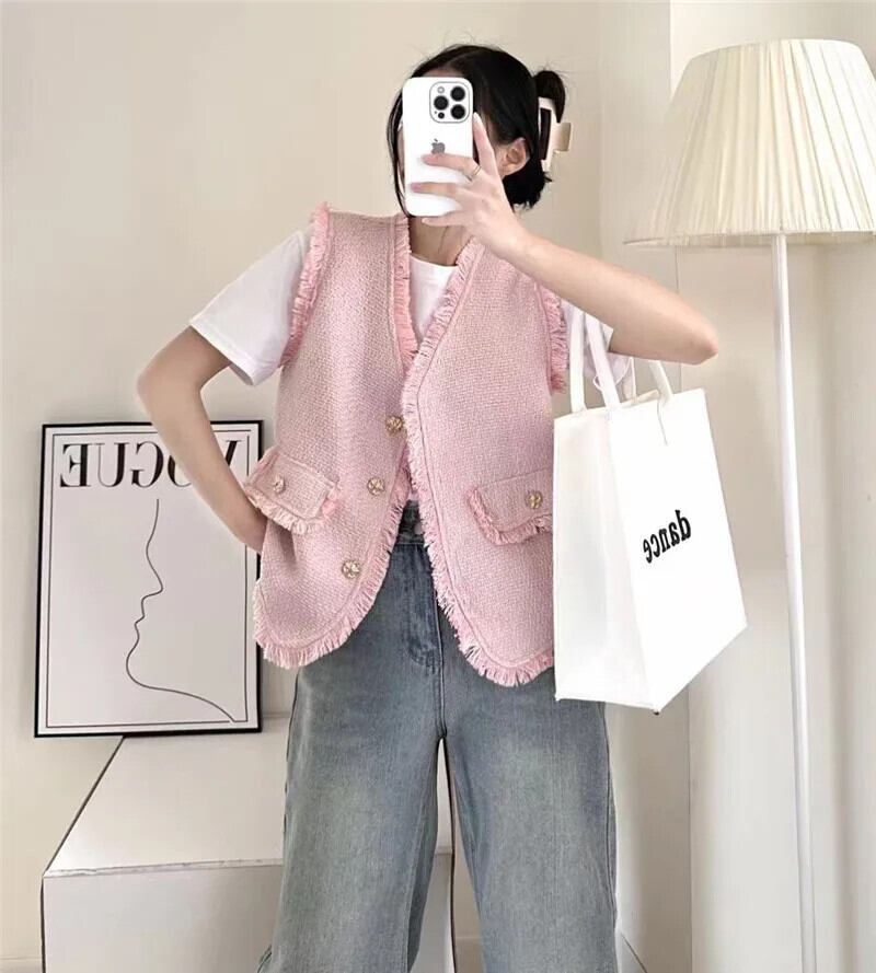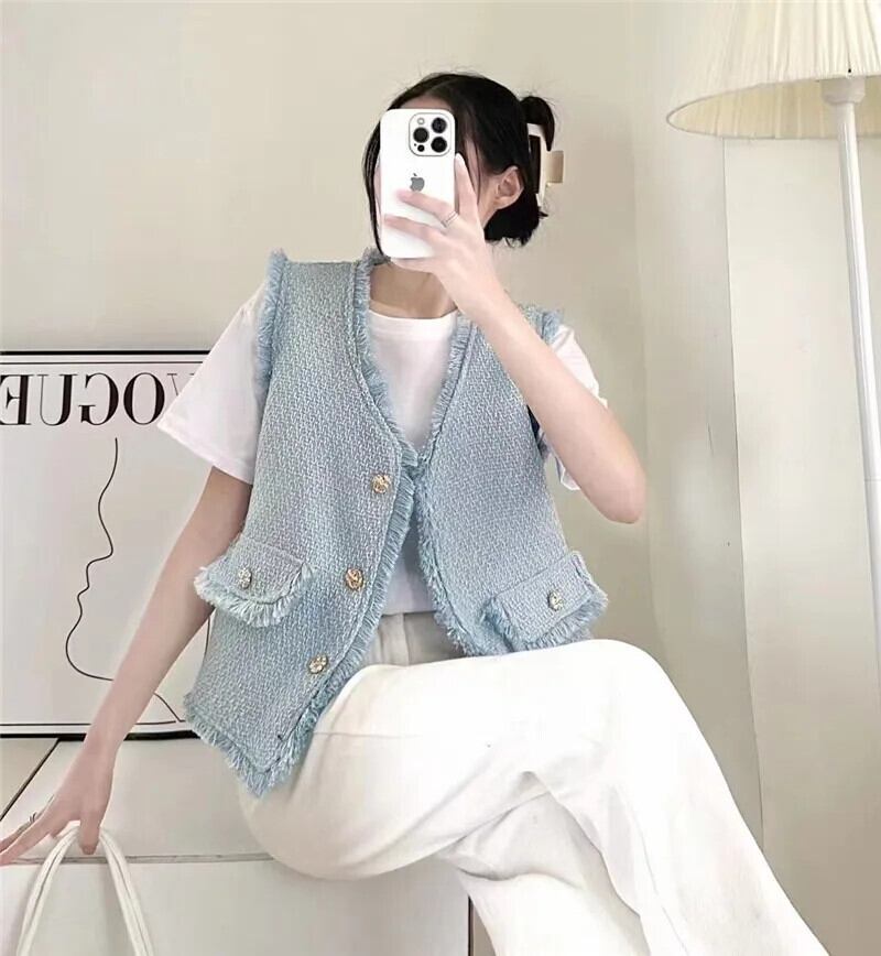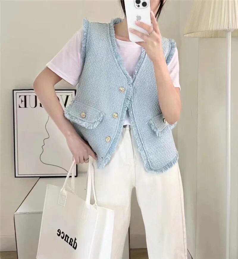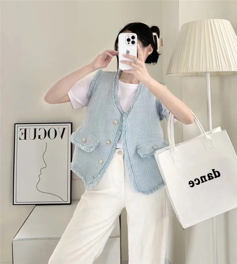 チョッキシック夏 V ネックシングルブレストパッチワーク Tel Raw エッジツイードベストコート サマー 夏物 Vネック
