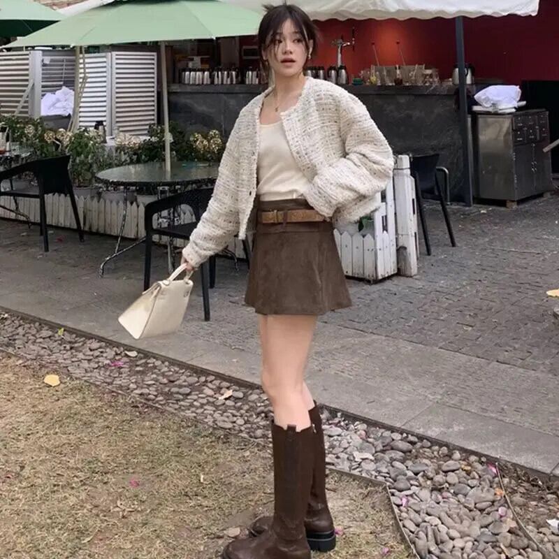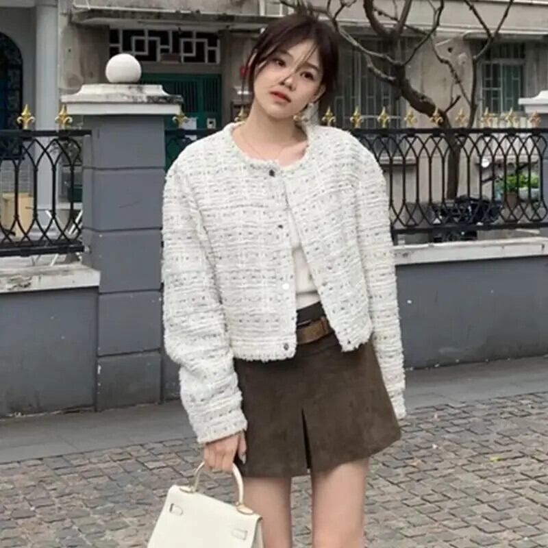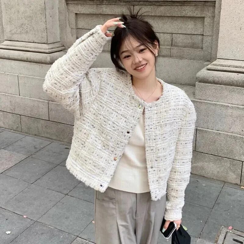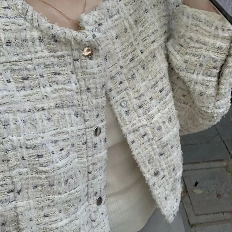春秋気質コントラストチェッカーコートショートツイードインジャケット スプリング 春物 オータム 秋物