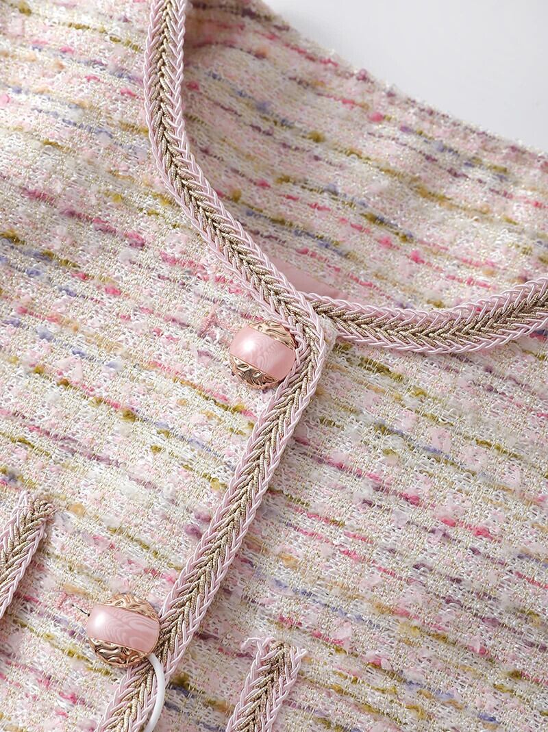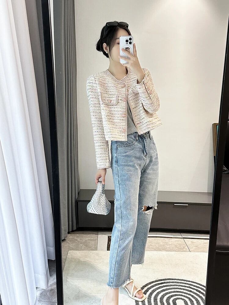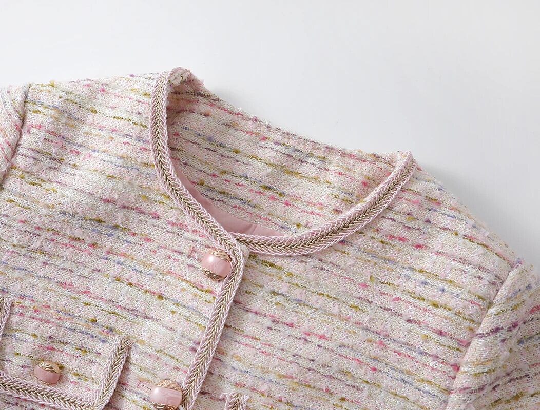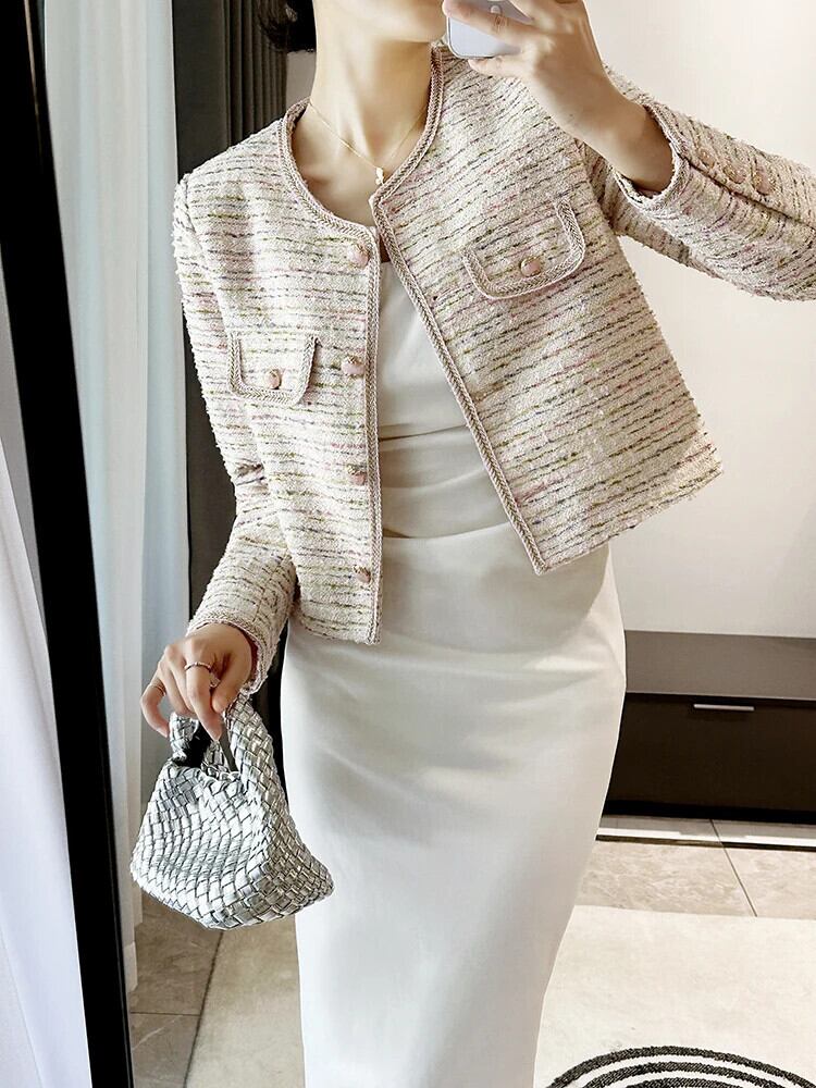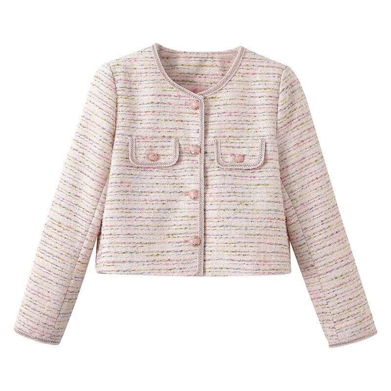 秋ツイードピンクスパンコール香りショートクロップドコートショートアウタージャケット オータム 秋物