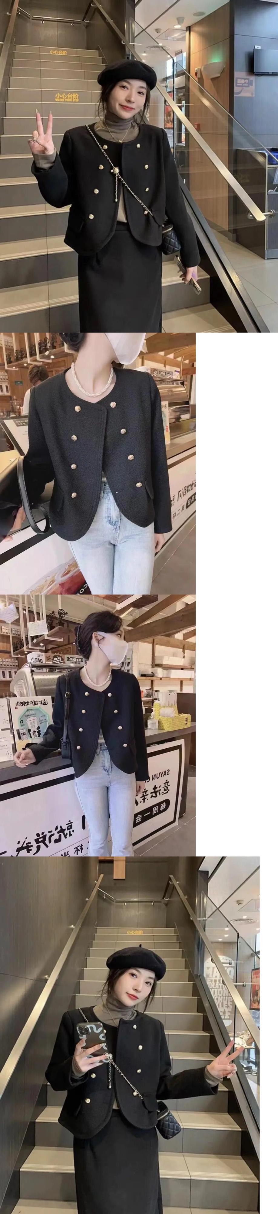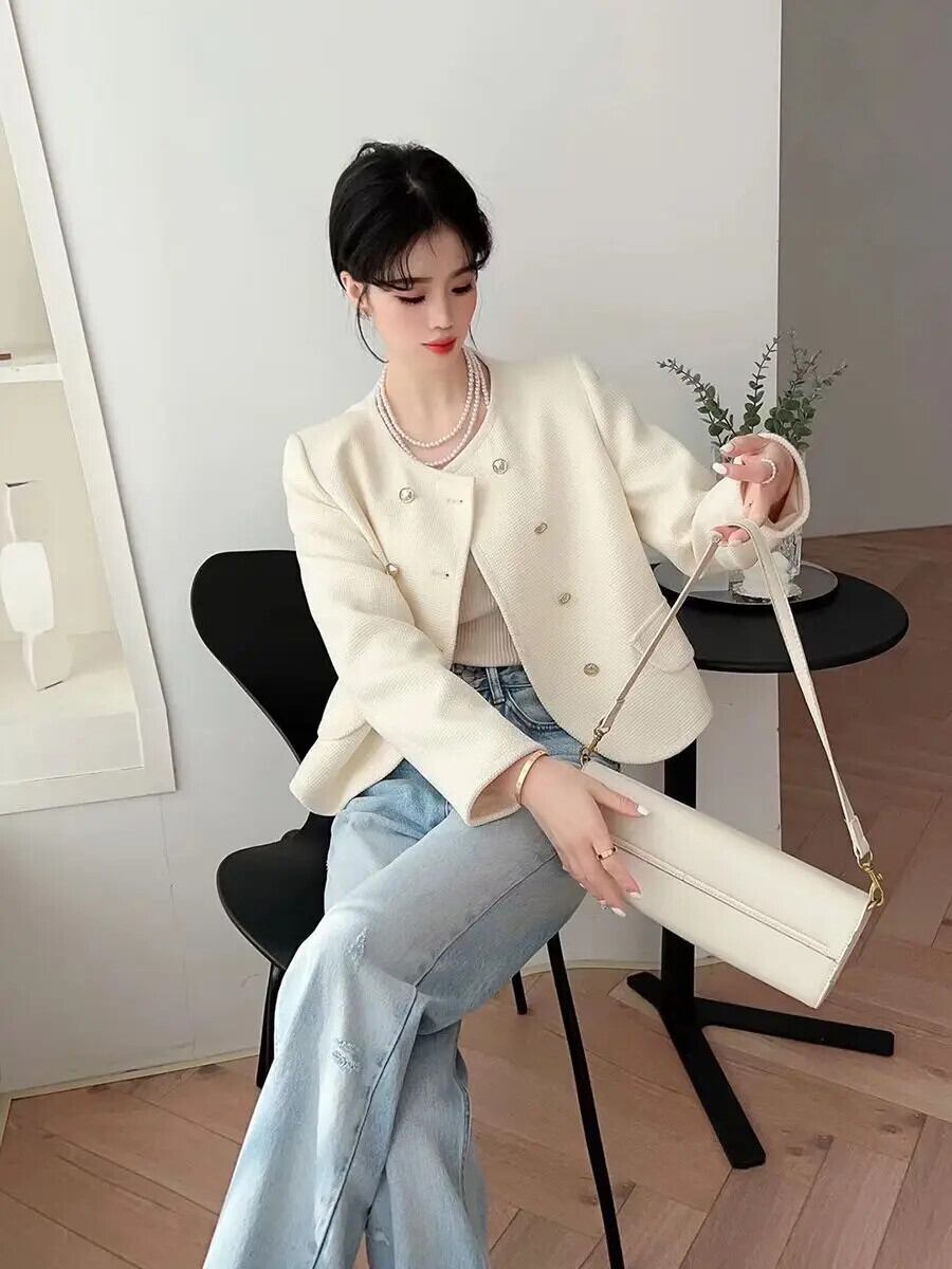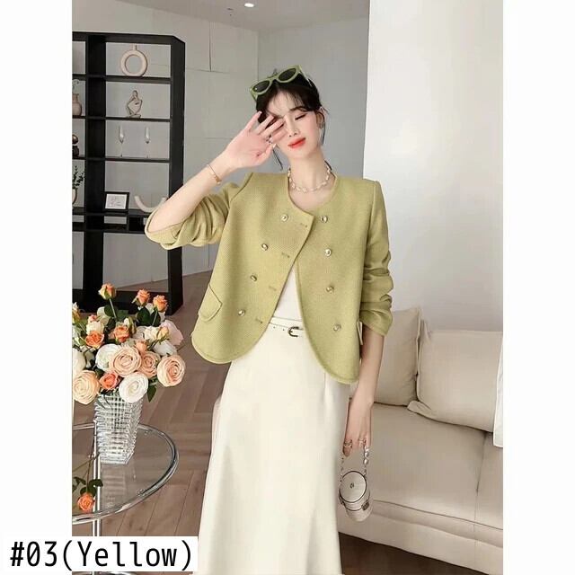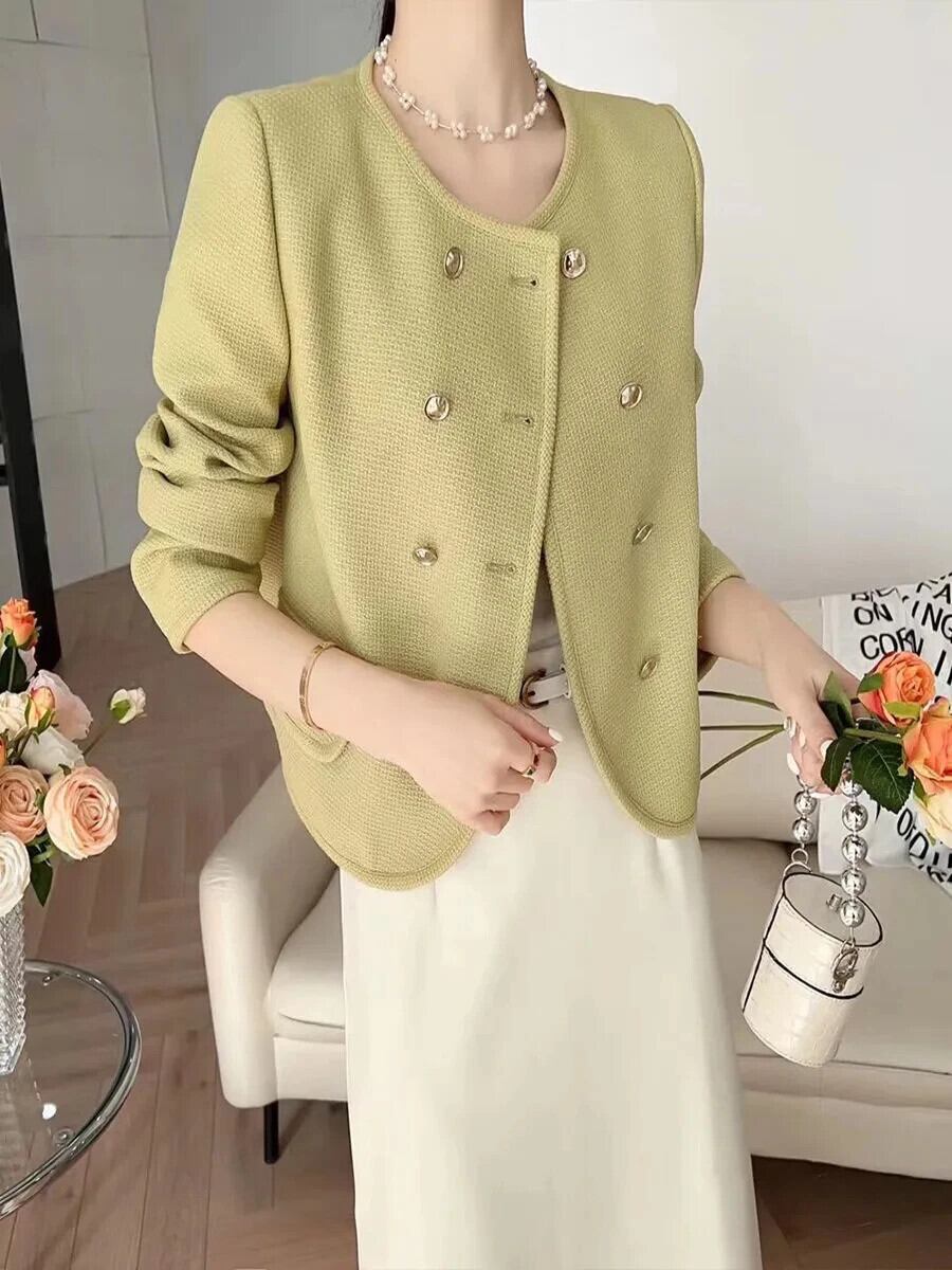 春レディースラウンドネックダブルブレストスタイルコートツイードジャケット スプリング 春物 Oネック