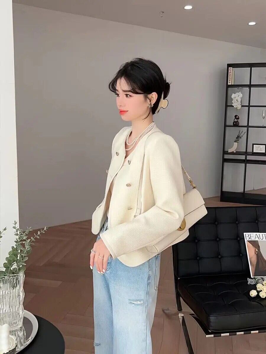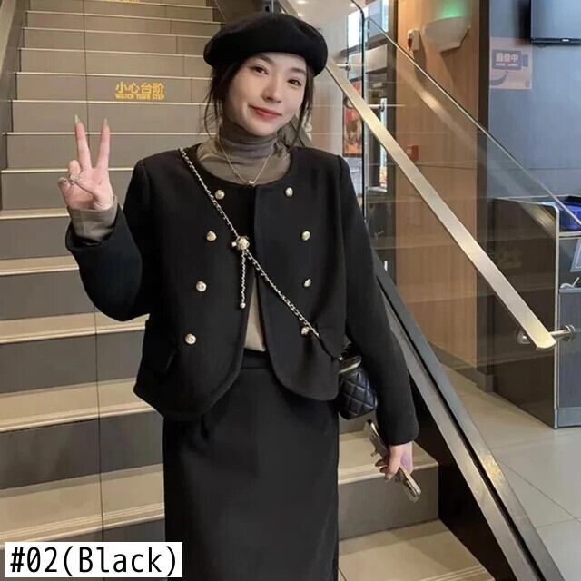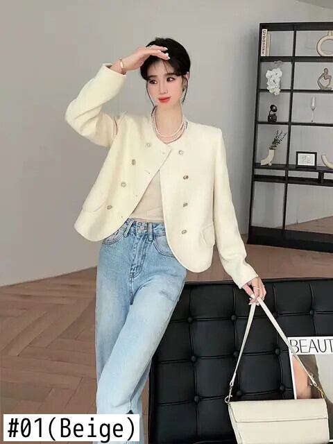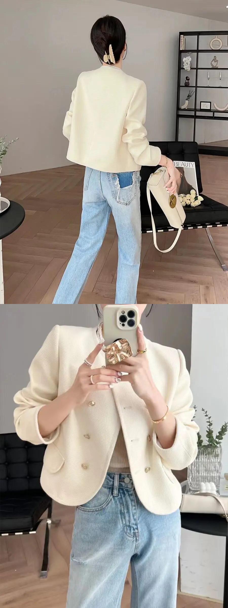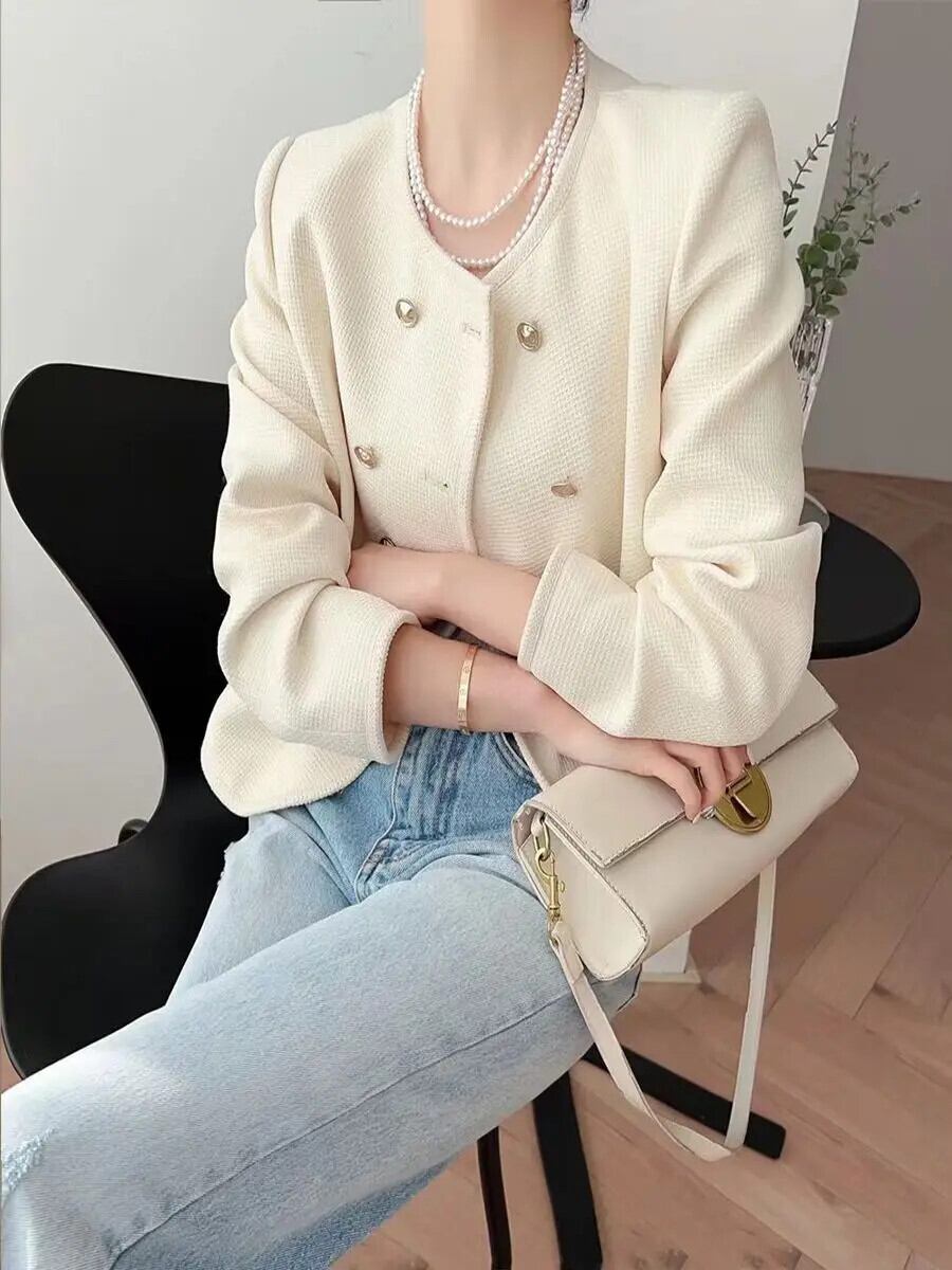 春レディースラウンドネックダブルブレストスタイルコートツイードジャケット スプリング 春物 Oネック