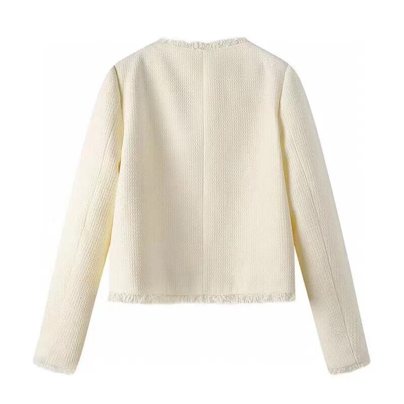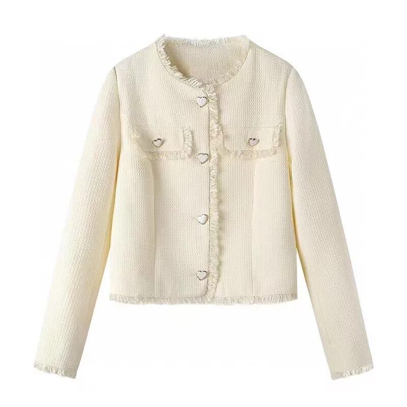春秋多彩ラウンドネック気質甘い香りツイードコート愛ボタンベージュテルジャケット 大人ガーリー スウィート キュート カジュアル スプリング 春物 オータム 秋物 Oネック