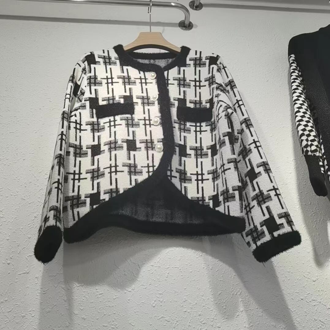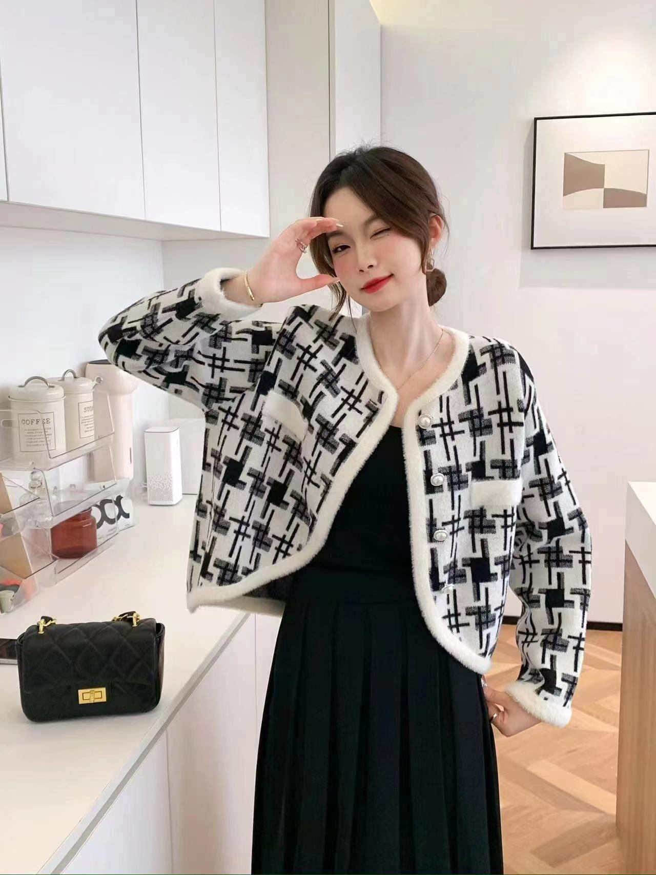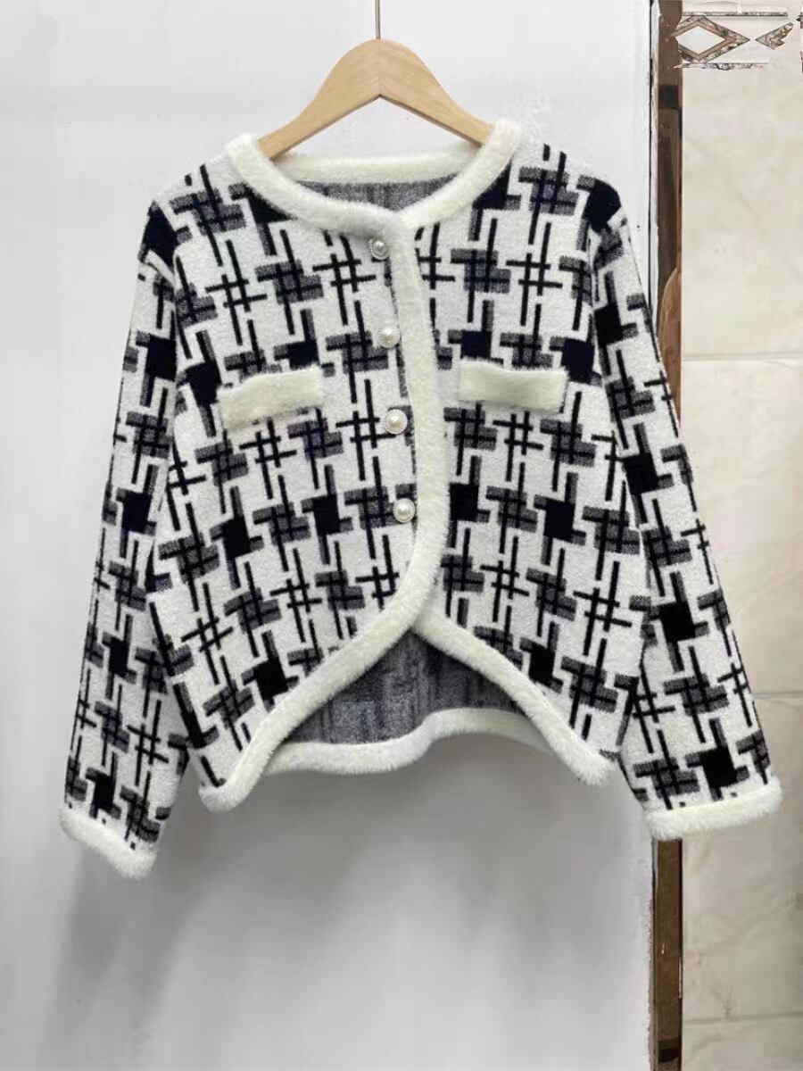 秋冬ルーズフィットシングルブレストラウンドネックセーターチェック柄ニット オータム 秋物 ウィンター 冬物 Oネック