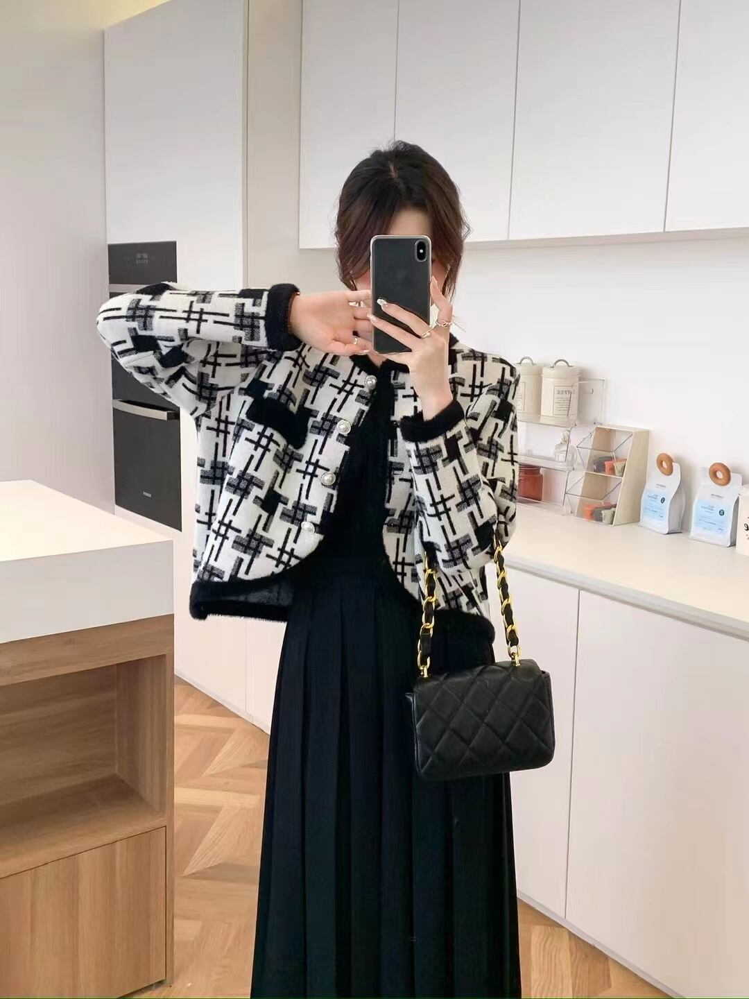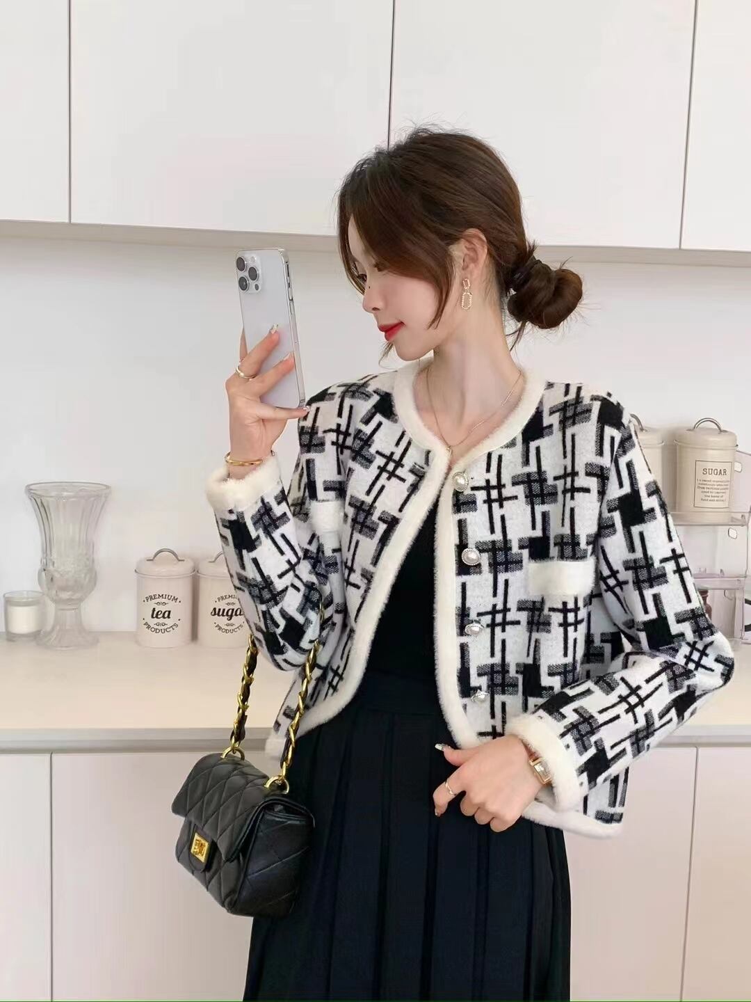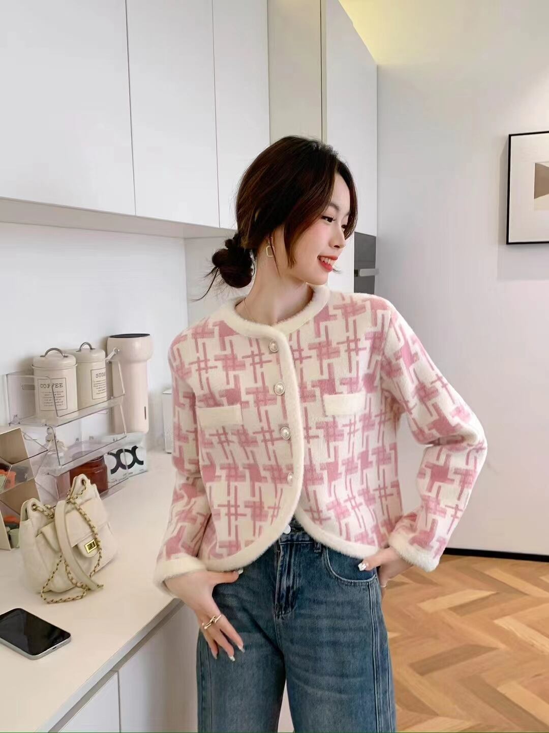 秋冬ルーズフィットシングルブレストラウンドネックセーターチェック柄ニット オータム 秋物 ウィンター 冬物 Oネック