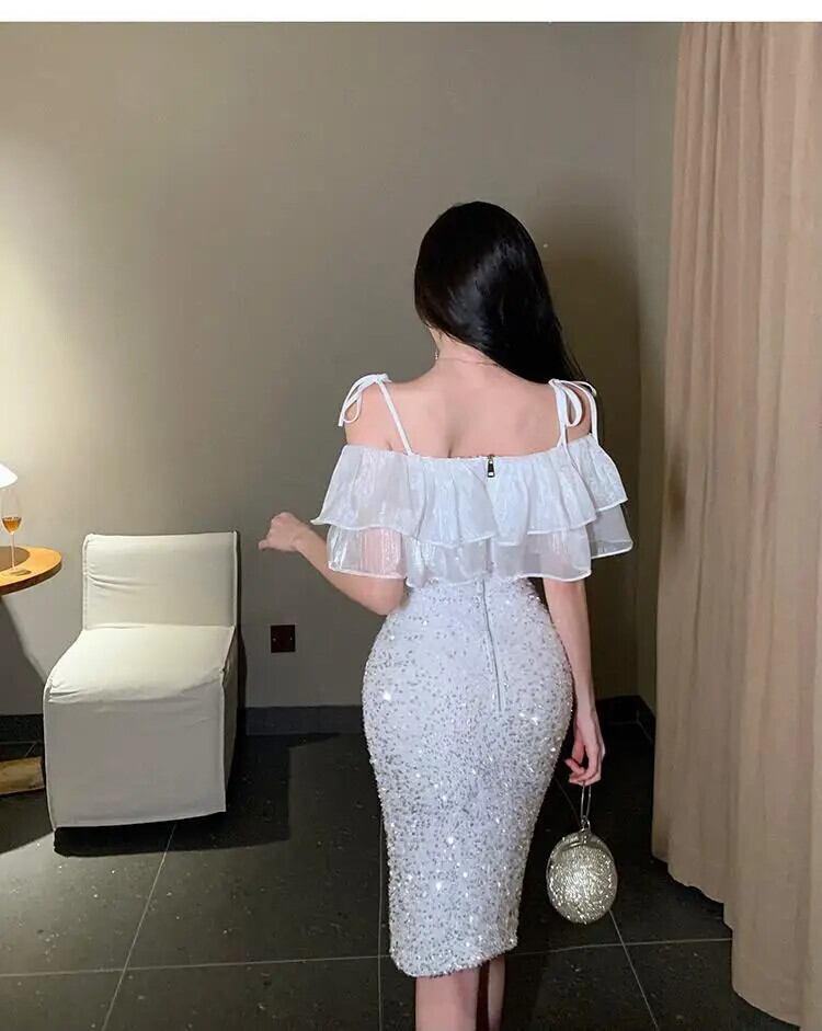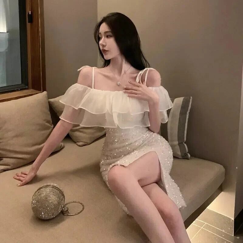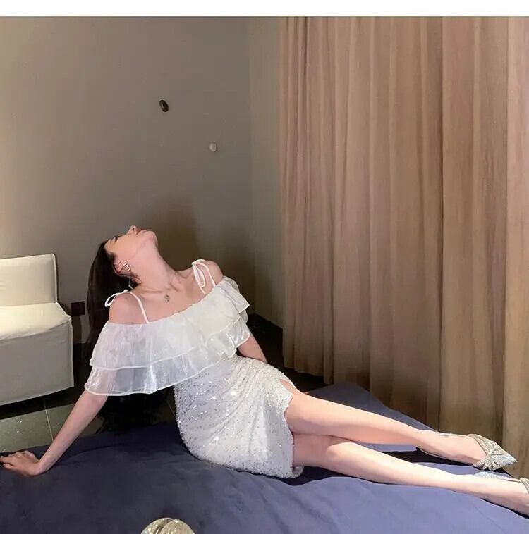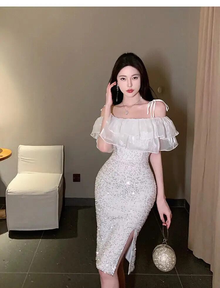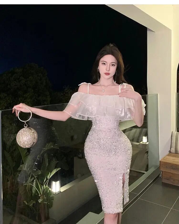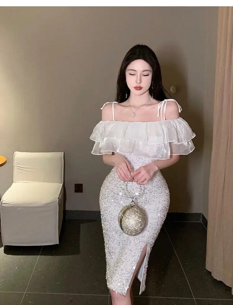 夏光沢あるビーズ スプライス オフショルダー スリム フィット パーティー イブニング ドレス ローブ サマー 夏物