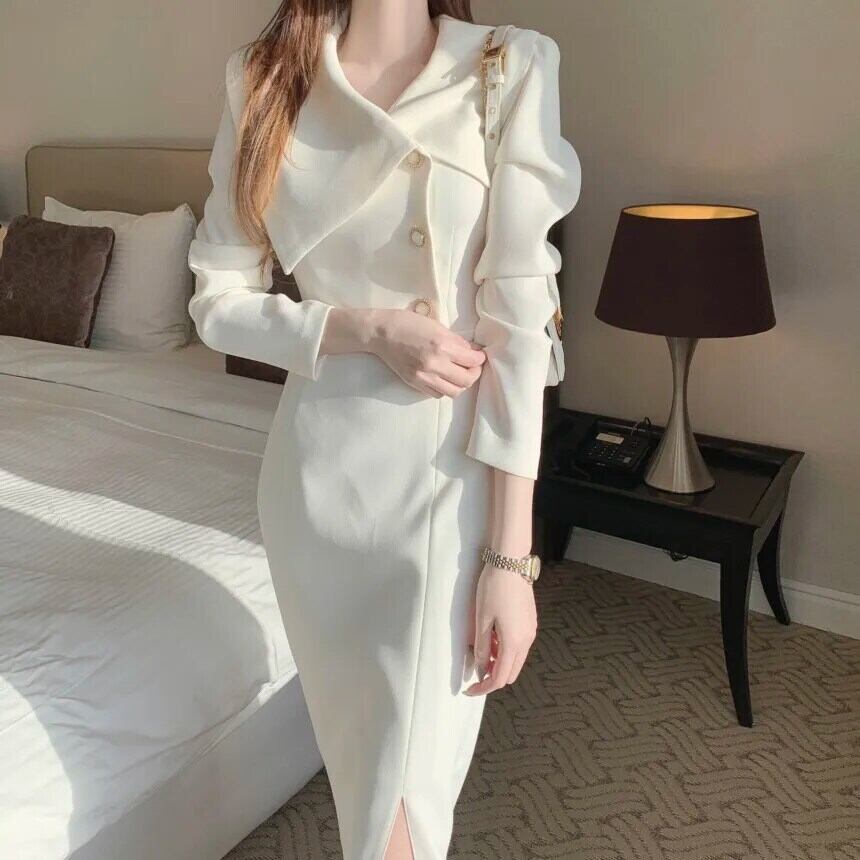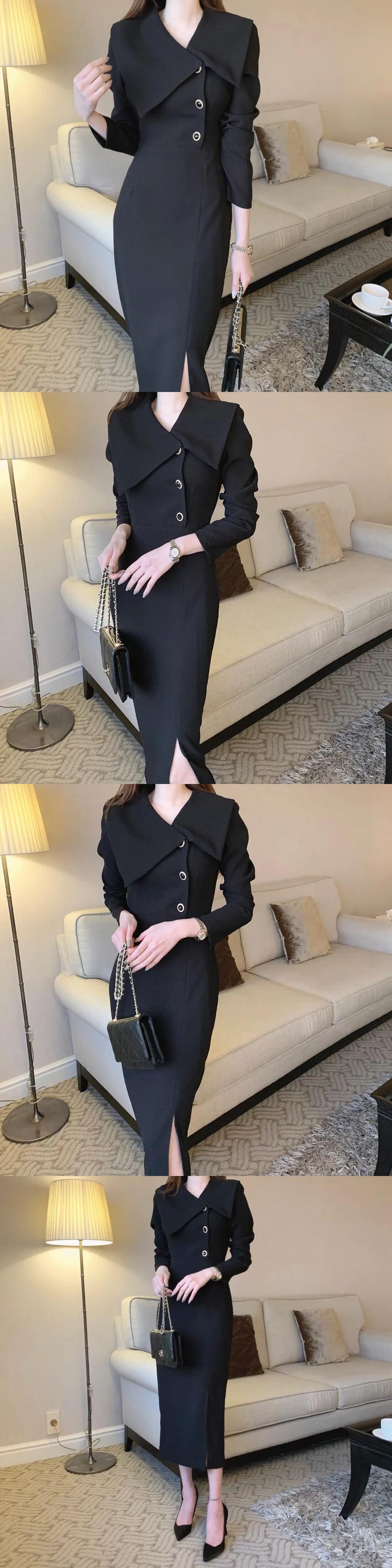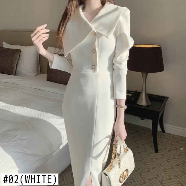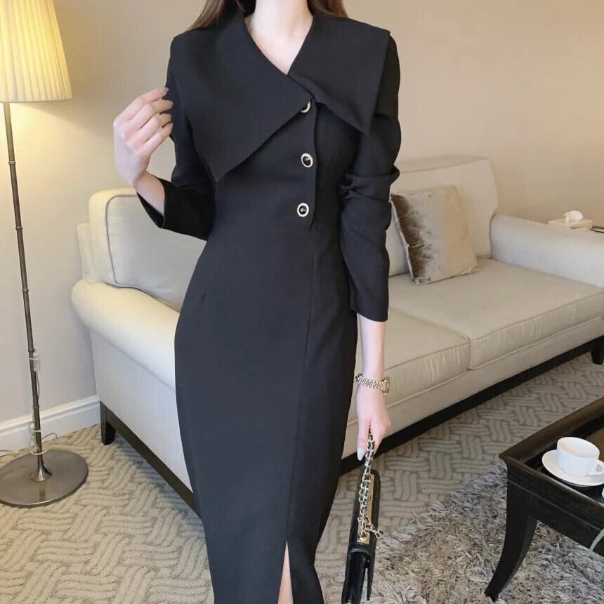 シック秋ターンカラーサイドバックルウエストラップ長袖シフォンドレス ロング オータム 秋物
