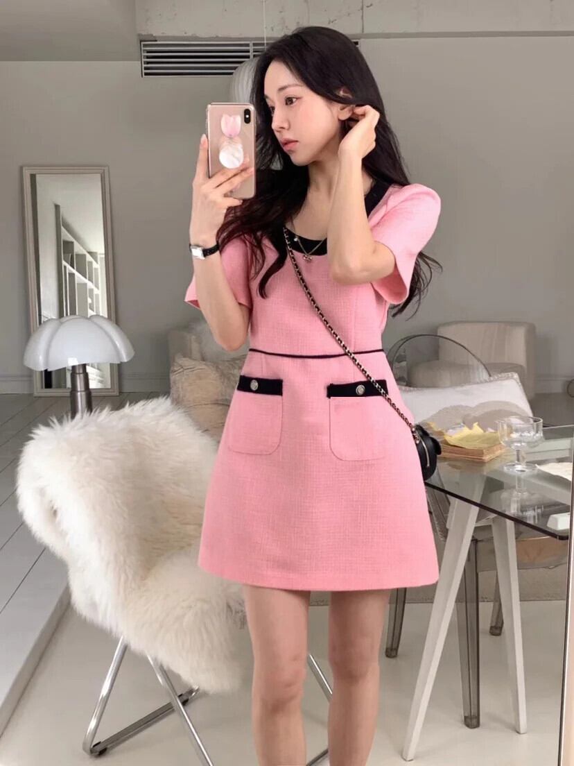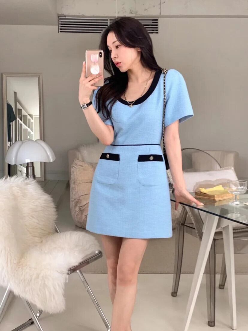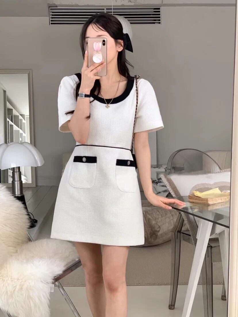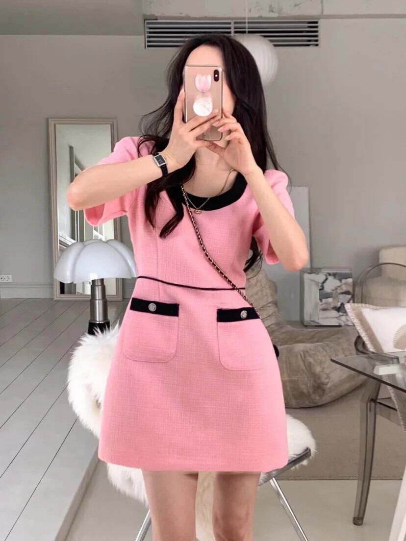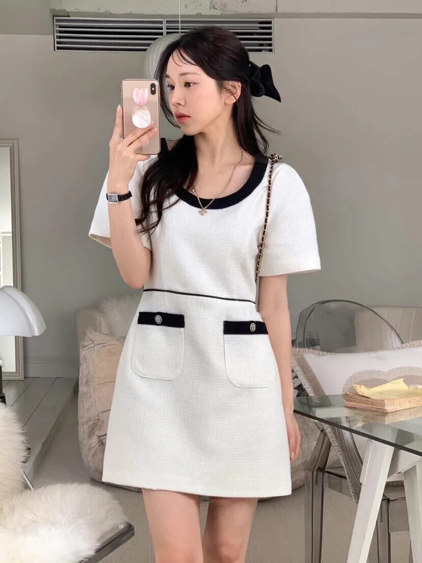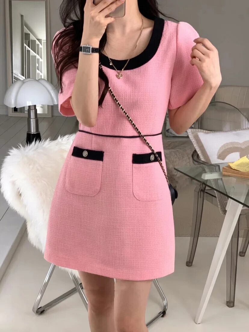 夏香りラウンドネックウエストダブルポケット半袖ドレス ショート ハーフスリーブ サマー 夏物 Oネック