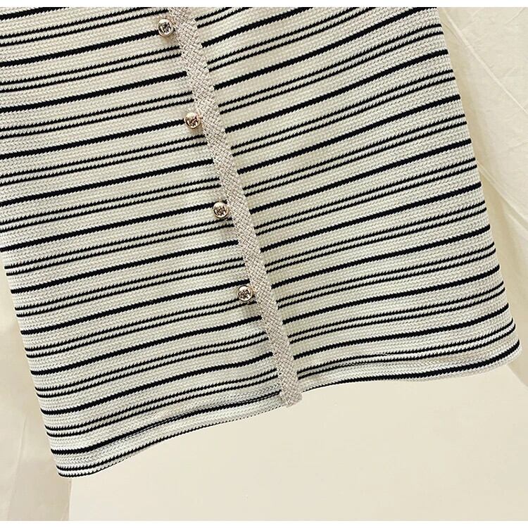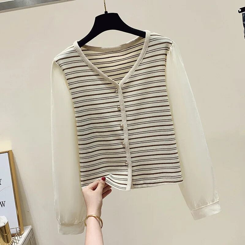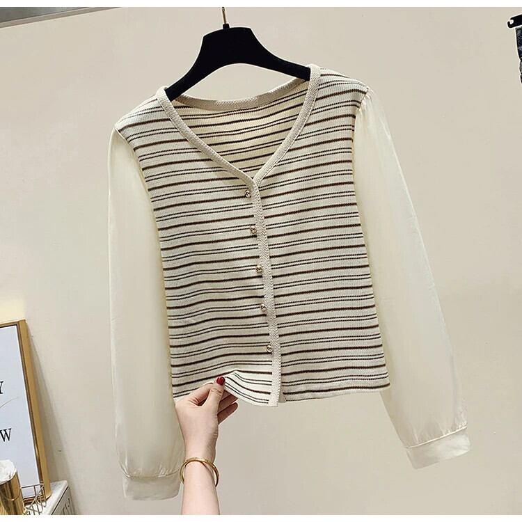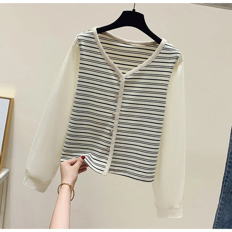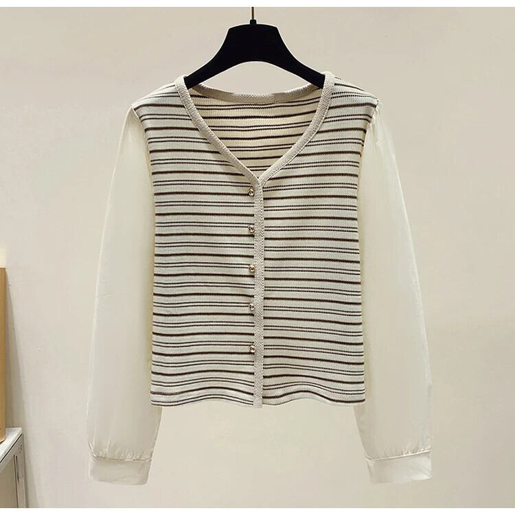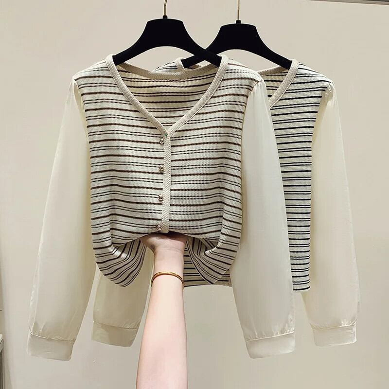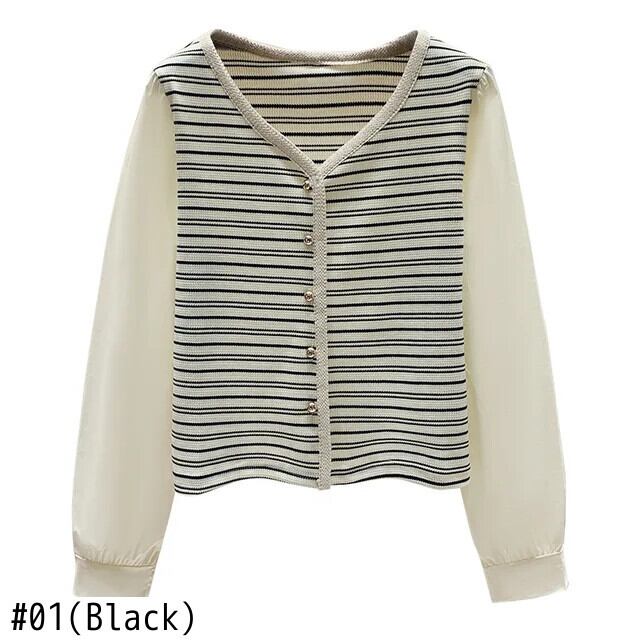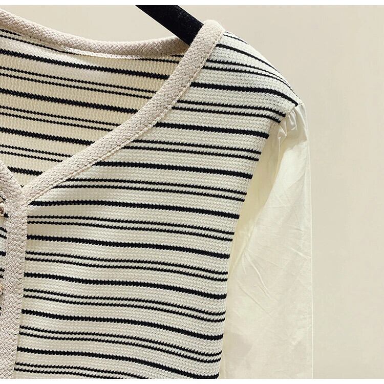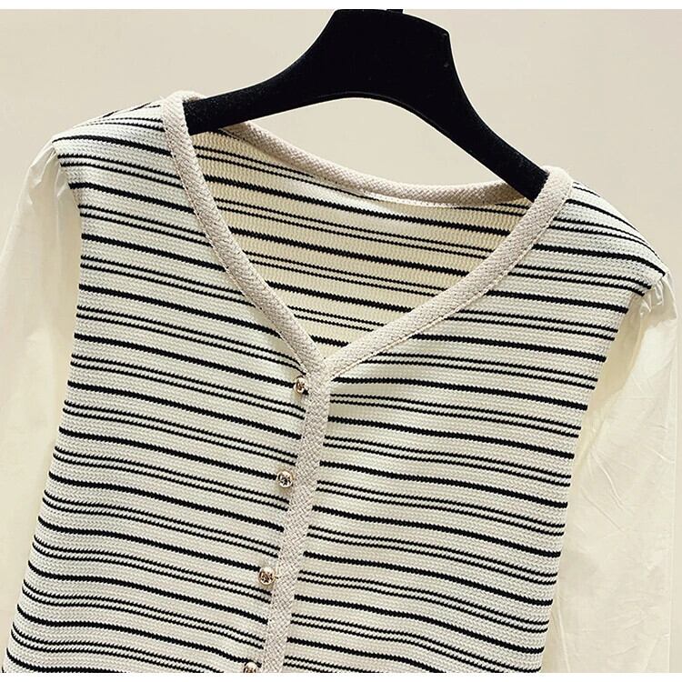 秋レトロ V ネックストライプニット香り風フェイクツーピース長袖ボトム T シャツ ロング オータム 秋物 Vネック Tシャツ