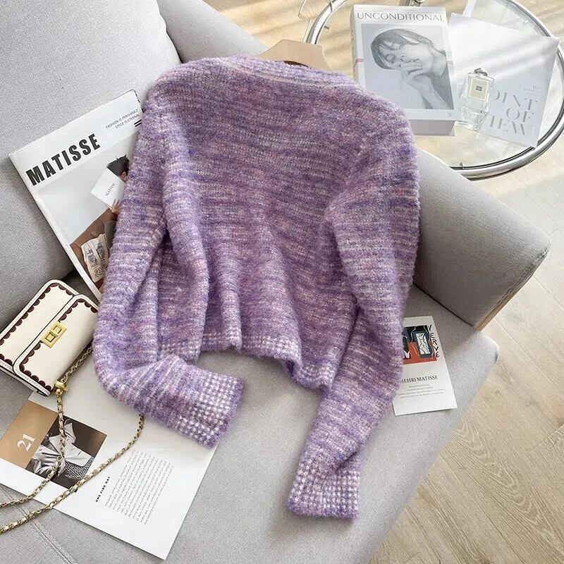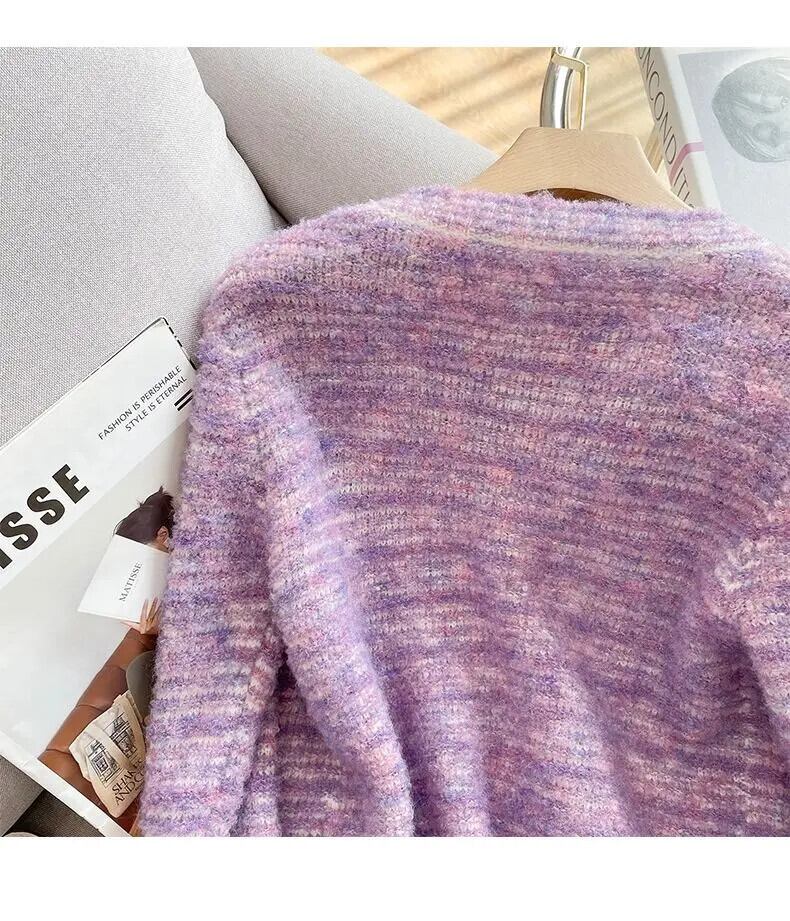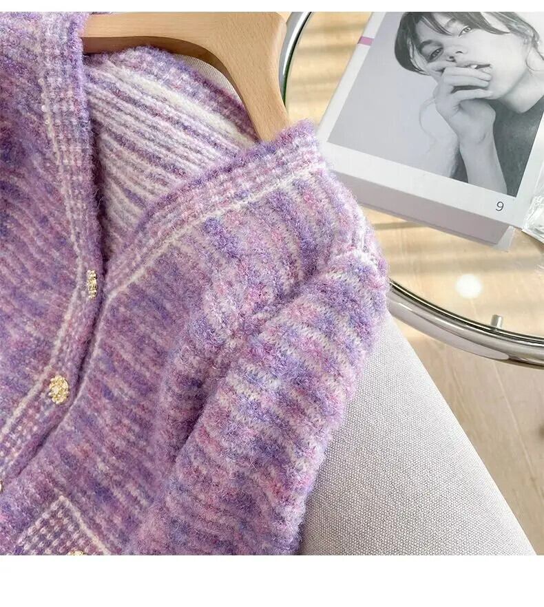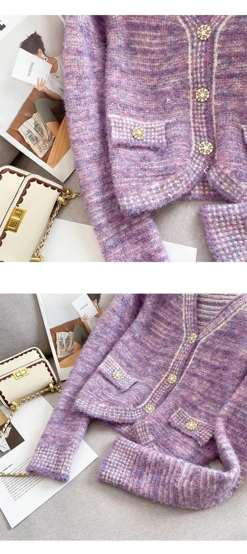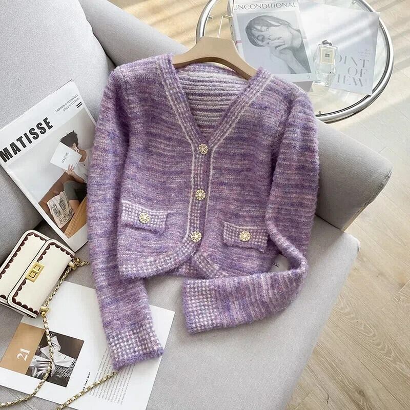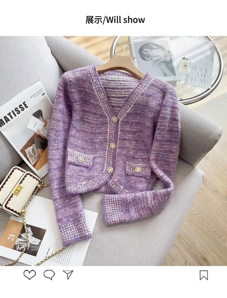 秋と冬香り良いショートセーターカーディガンパープルVネックニットコート オータム 秋物 ウィンター 冬物