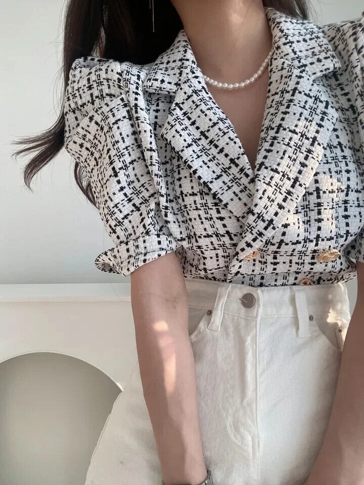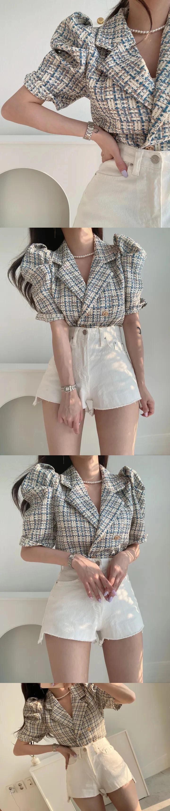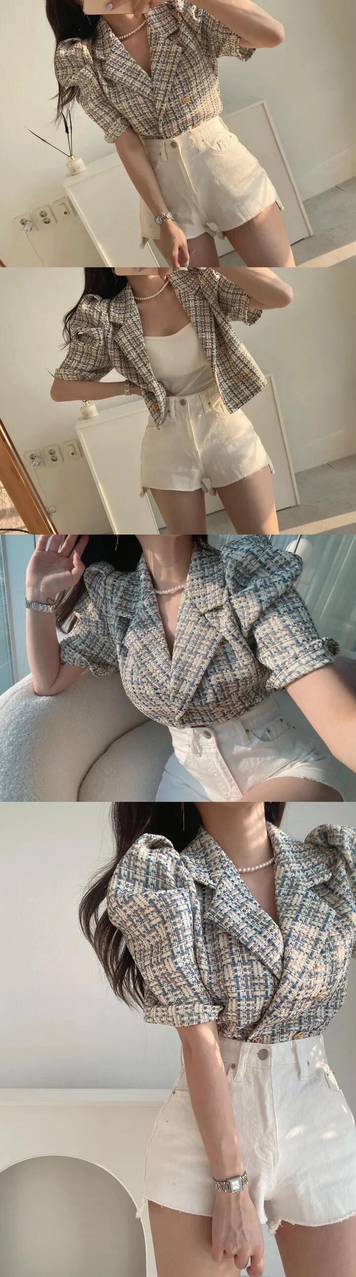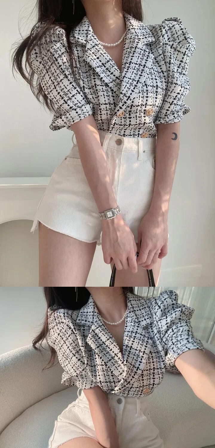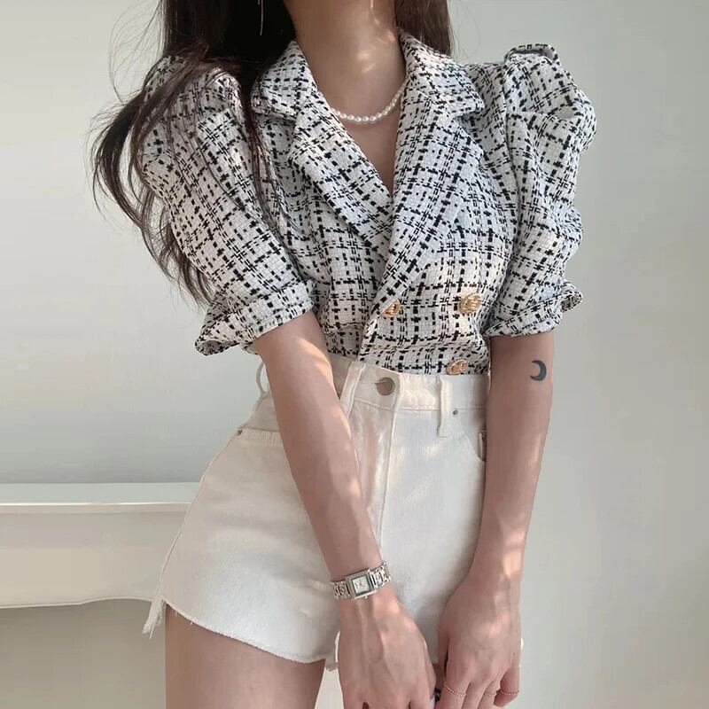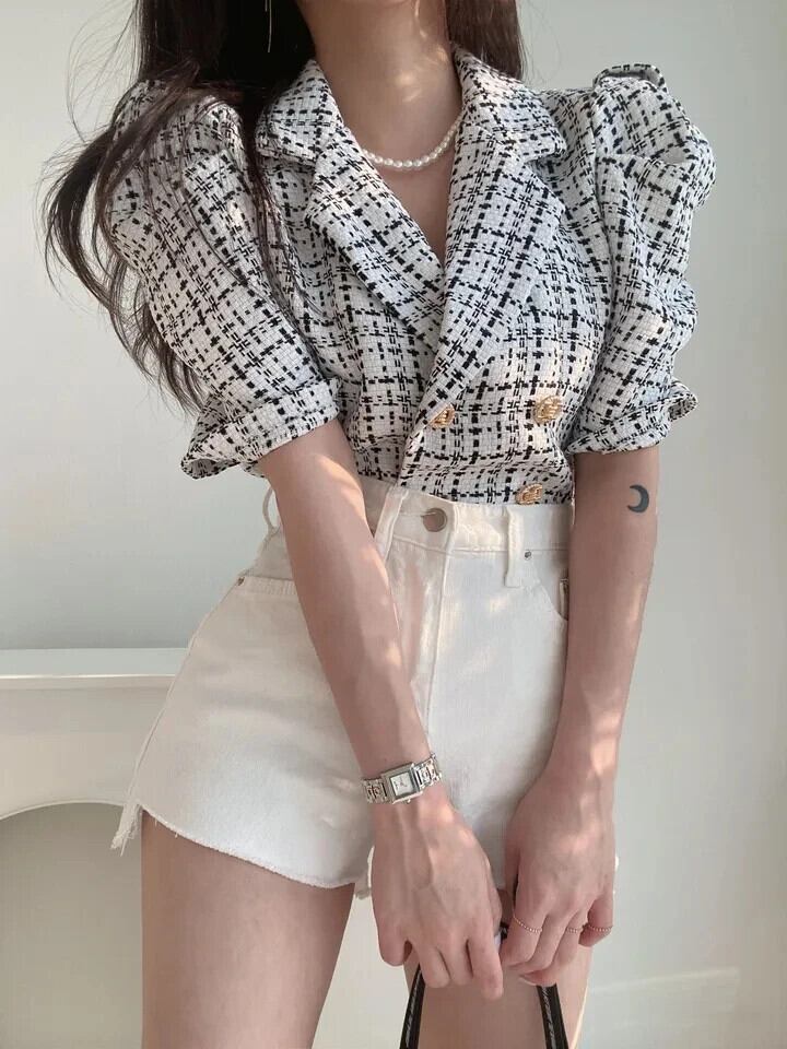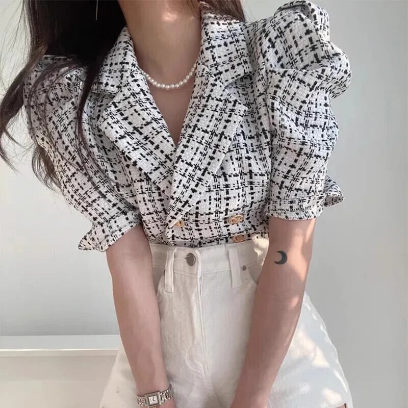 春/夏香りスタイルジャケットスーツ襟コントラストチェック柄ダブルブレストバブルスリーブショートコート スプリング 春物 サマー 夏物