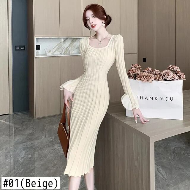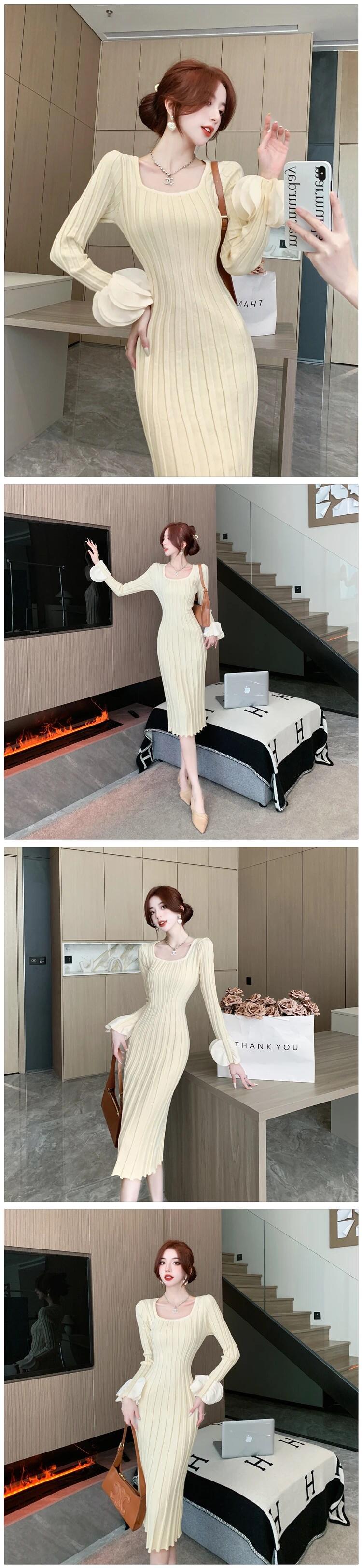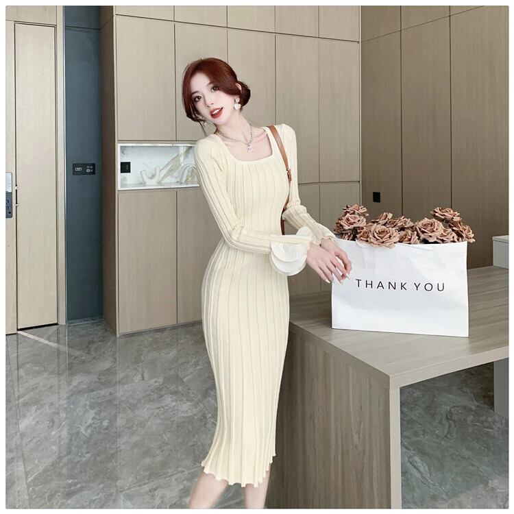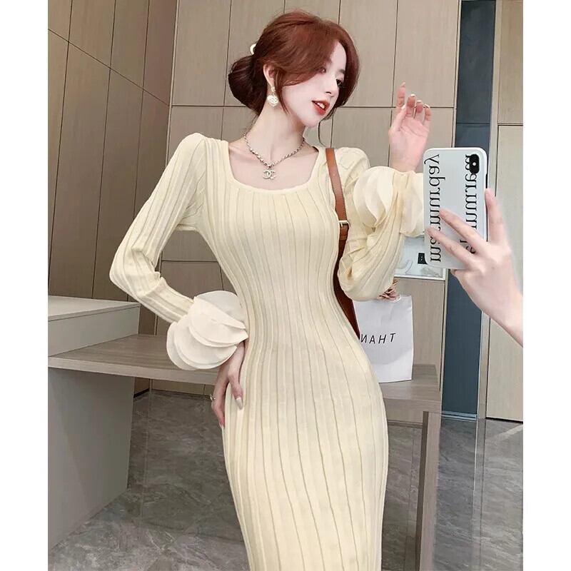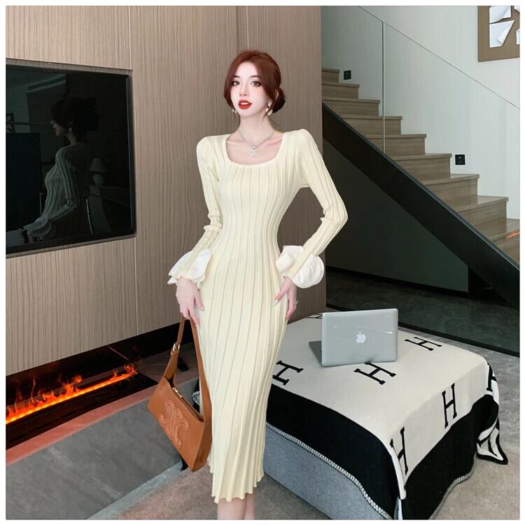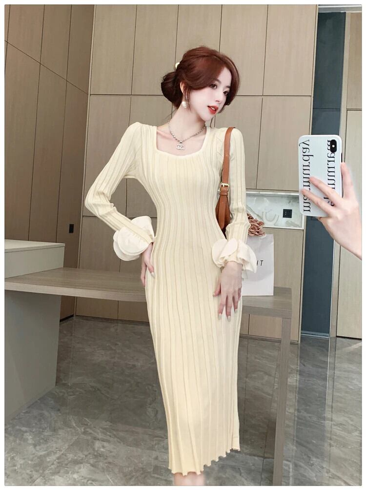 秋冬可能スリムフィットシック気質花びらスリーブ U ネックニットボトムドレス オータム 秋物 ウィンター 冬物