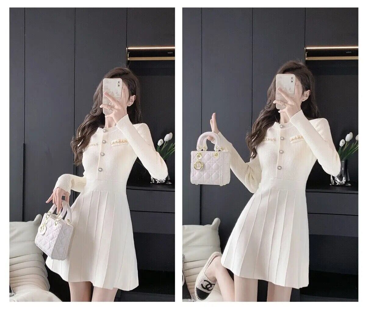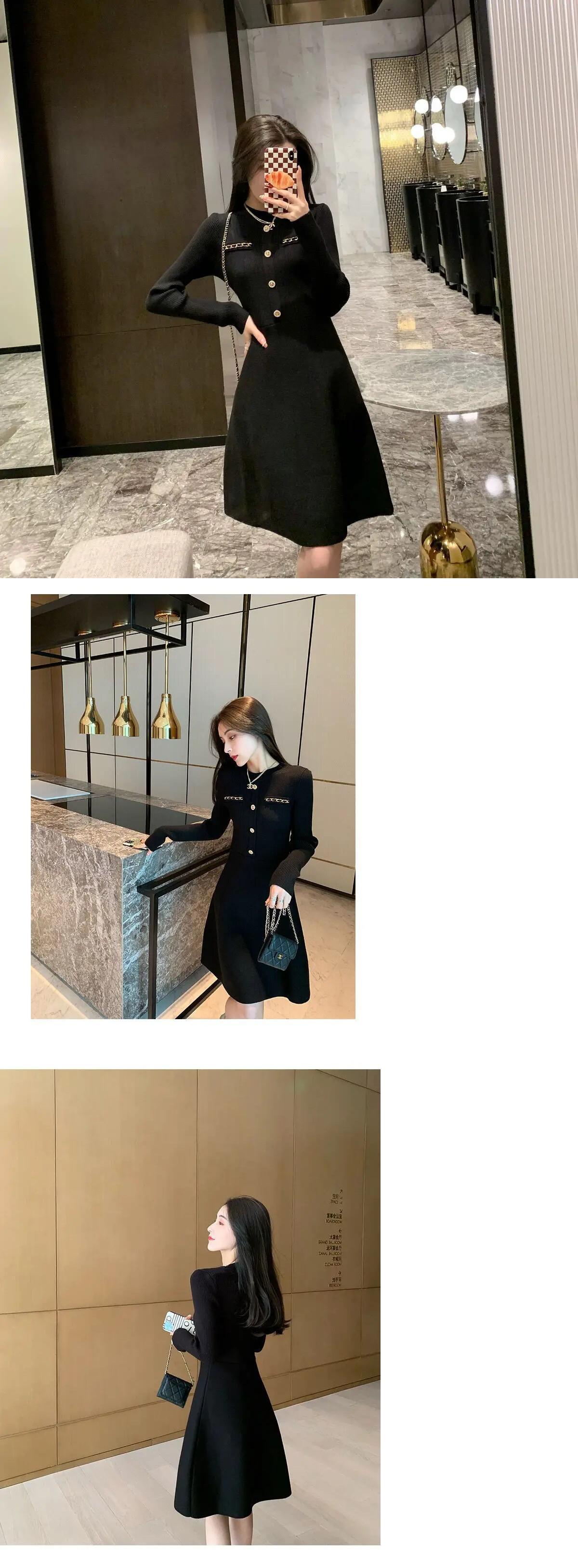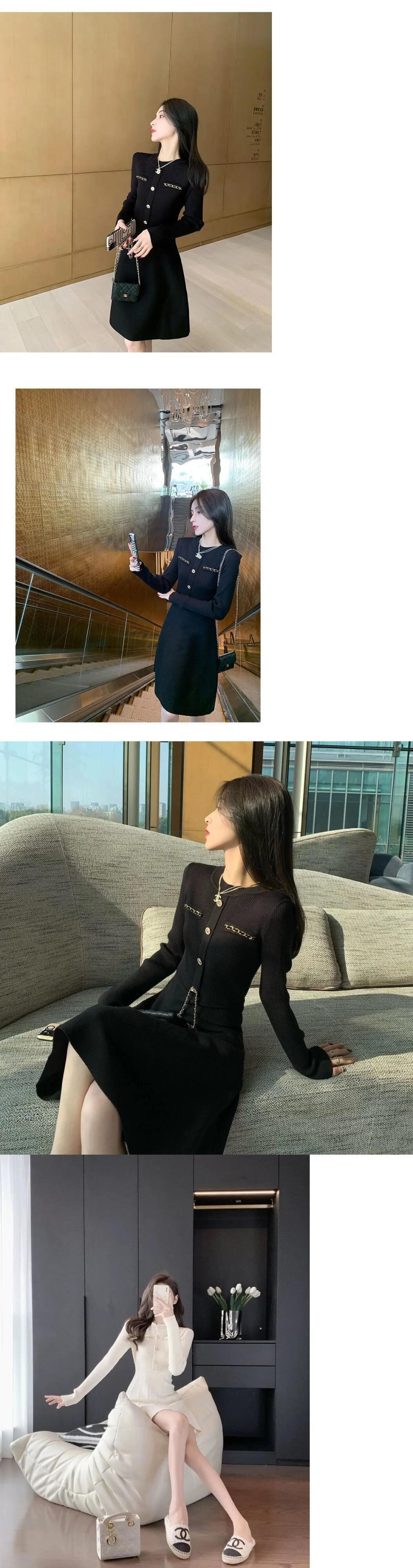 春秋スリムフィット気質セレブ白黒ニットドレス ホワイト ブラック スプリング 春物 オータム 秋物