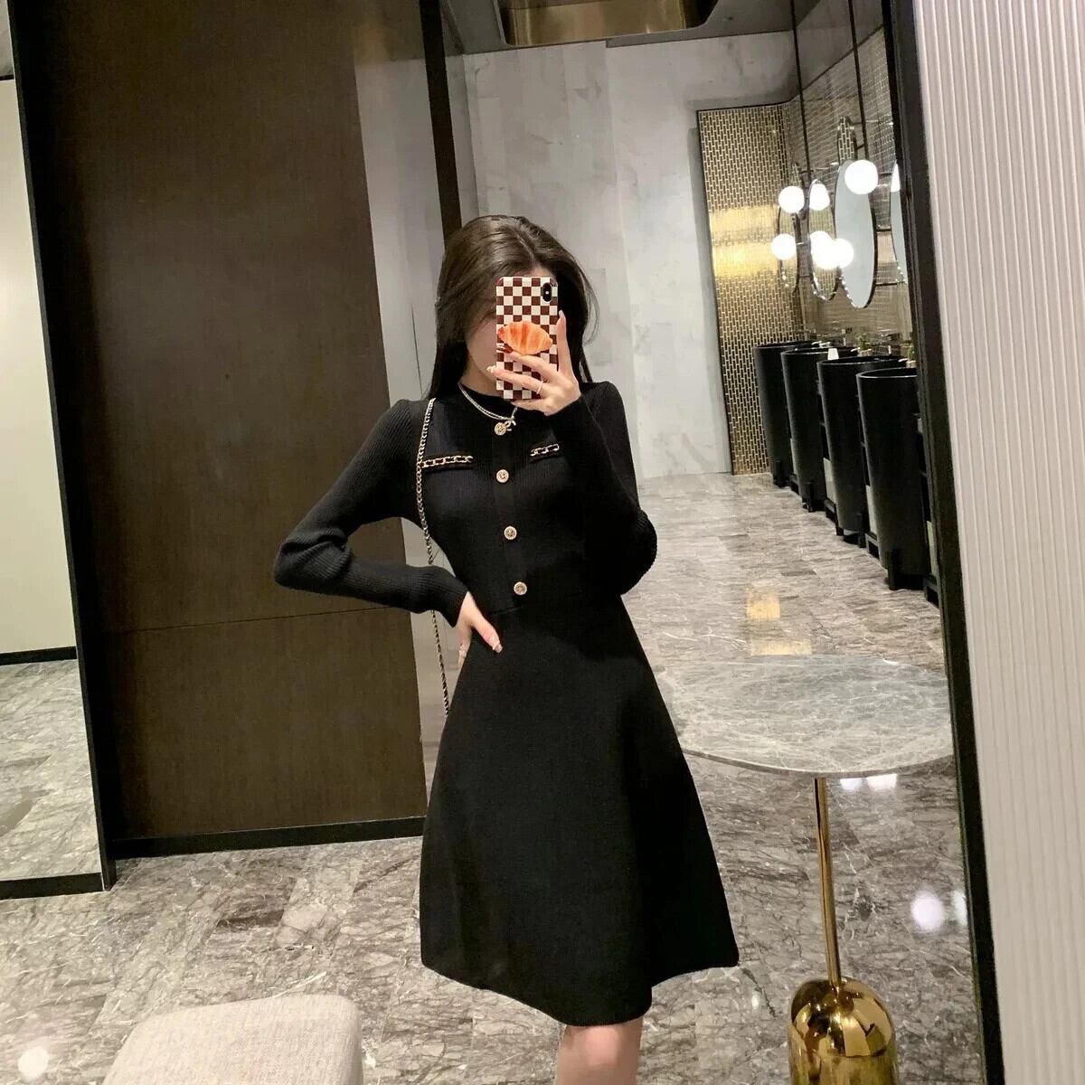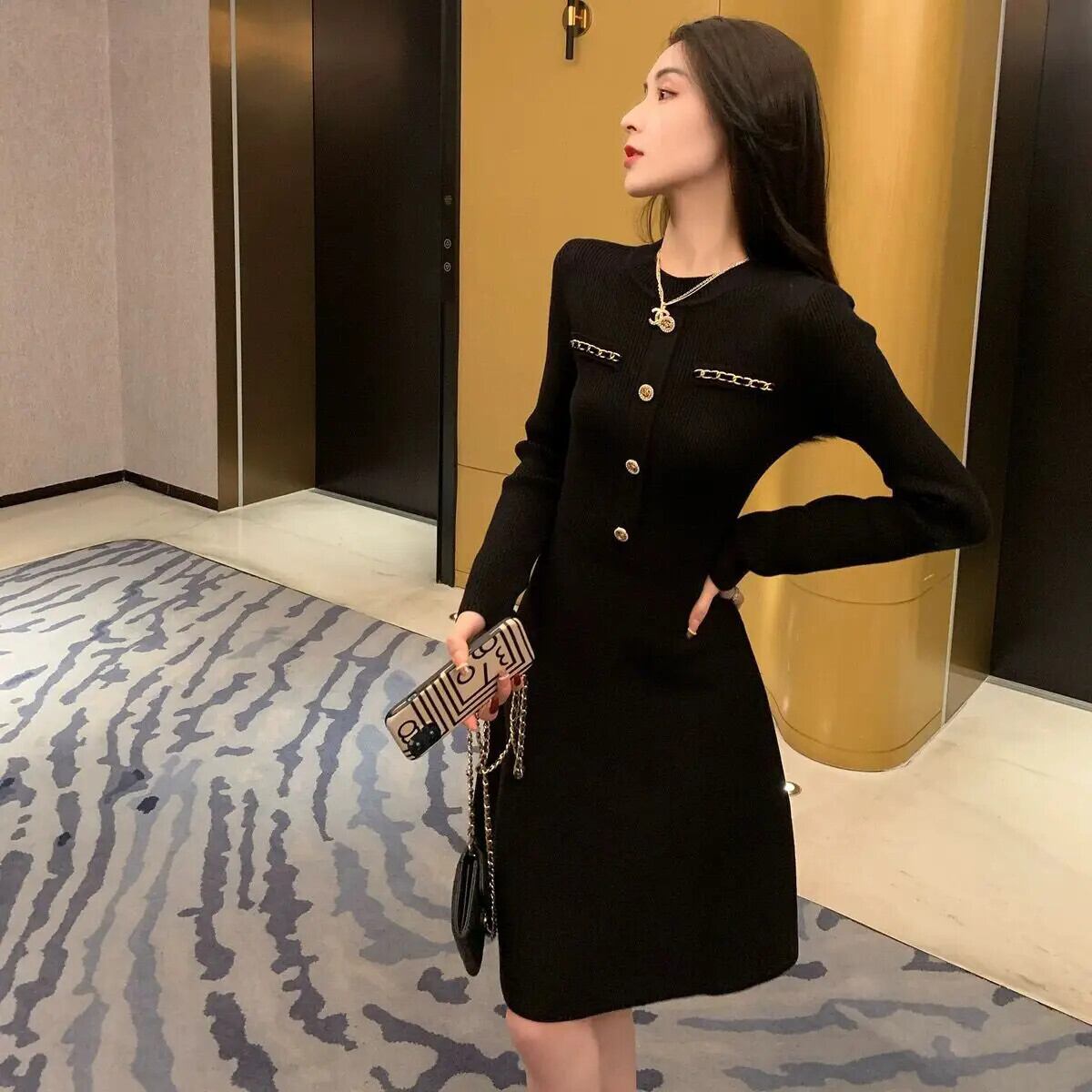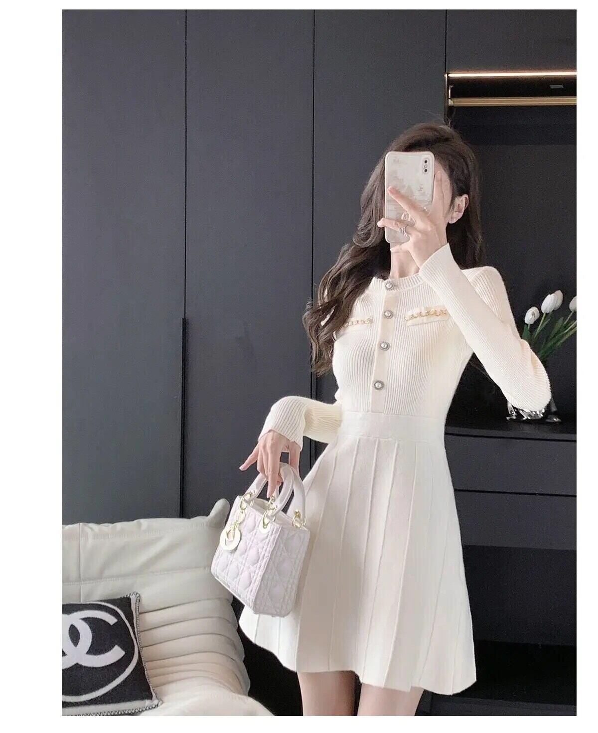 春秋スリムフィット気質セレブ白黒ニットドレス ホワイト ブラック スプリング 春物 オータム 秋物